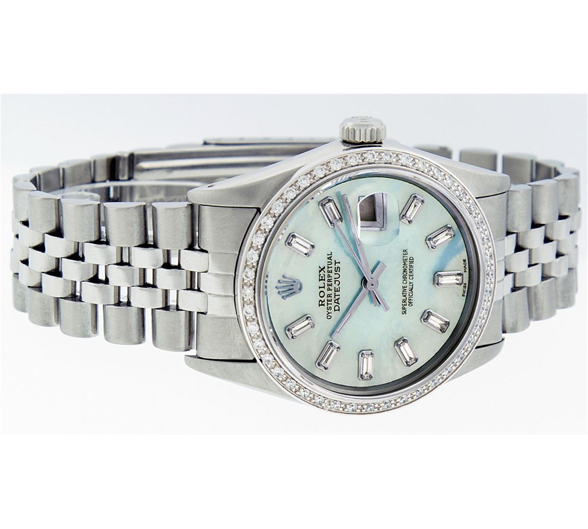 One Mens Rolex Datejust Polished, Serviced & Electronically Tested, Stainless Steel Case:36mm, Stainless Steel Crown, Custom Bezel: 18K White Gold Beadset Diamond Bezel, Diamond Count: 44 Diamonds, Total Weight 1.00 Carat, Clarity: SI-VS, Color: G to H. Custom Crystal: Synthetic Sapphire Cyclops Lens. Movement: Automatic Winding Movement Caliber 3035. Custom Dial: Blue MOP Baguette Diamond Hour Markers, Diamond Count: 10 Diamond Baguette. G To H In Color, Clarity: SI-VS. Date Window: 3 O'Clock Position Date Display, Quickset, Model: Datejust. Condition: G-6 Extra Fine. Bracelet: Stainless Steel Jubilee. Bright Polish & Satin Finish. 7.0 Inch Length, Adjustable. Standard Clasp, With Rolex Logo