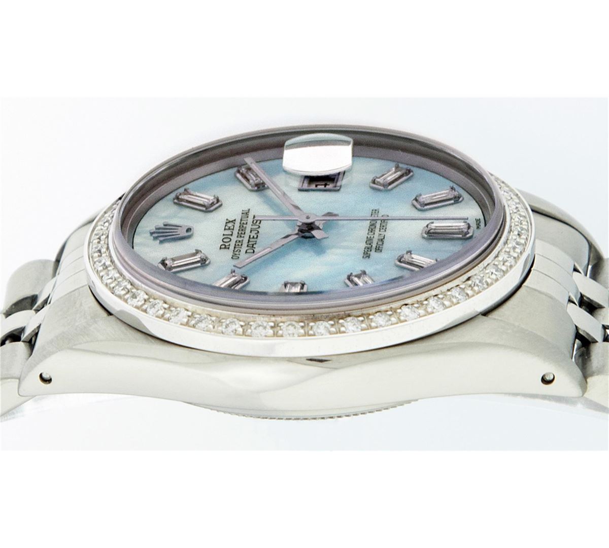 One Mens Rolex Datejust Polished, Serviced & Electronically Tested, Stainless Steel Case:36mm, Stainless Steel Crown, Custom Bezel: 18K White Gold Beadset Diamond Bezel, Diamond Count: 44 Diamonds, Total Weight 1.00 Carat, Clarity: SI-VS, Color: G to H. Custom Crystal: Synthetic Sapphire Cyclops Lens. Movement: Automatic Winding Movement Caliber 3035. Custom Dial: Blue MOP Baguette Diamond Hour Markers, Diamond Count: 10 Diamond Baguette. G To H In Color, Clarity: SI-VS. Date Window: 3 O'Clock Position Date Display, Quickset, Model: Datejust. Condition: G-6 Extra Fine. Bracelet: Stainless Steel Jubilee. Bright Polish & Satin Finish. 7.0 Inch Length, Adjustable. Standard Clasp, With Rolex Logo
