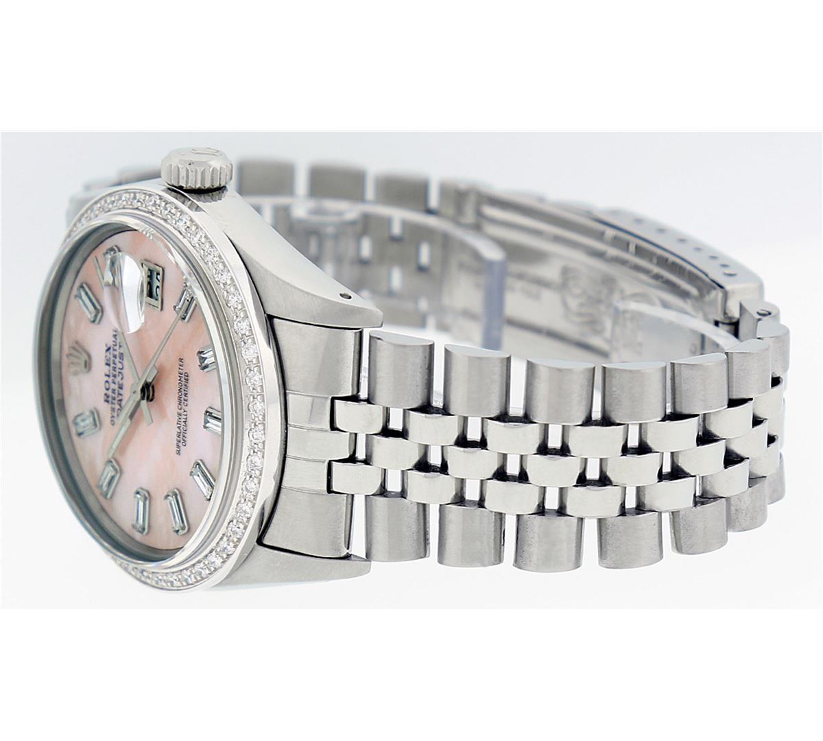 One Mens Rolex Datejust Polished, Serviced & Electronically Tested, Stainless Steel Case:36mm, Stainless Steel Crown, Custom Bezel: 18K White Gold Beadset Diamond Bezel, Diamond Count: 44 Diamonds, Total Weight 1.00 Carat, Clarity: SI-VS, Color: G to H. Custom Crystal: Synthetic Sapphire Cyclops Lens. Movement: Automatic Winding Movement Caliber 3035. Custom Dial: Pink MOP Baguette Diamond Hour Markers, Diamond Count: 10 Diamond Baguette. G To H In Color, Clarity: SI-VS. Date Window: 3 O'Clock Position Date Display, Quickset, Model: Datejust. Condition: G-6 Extra Fine. Bracelet: Stainless Steel Jubilee. Bright Polish & Satin Finish. 7.0 Inch Length, Adjustable. Standard Clasp, With Rolex Logo