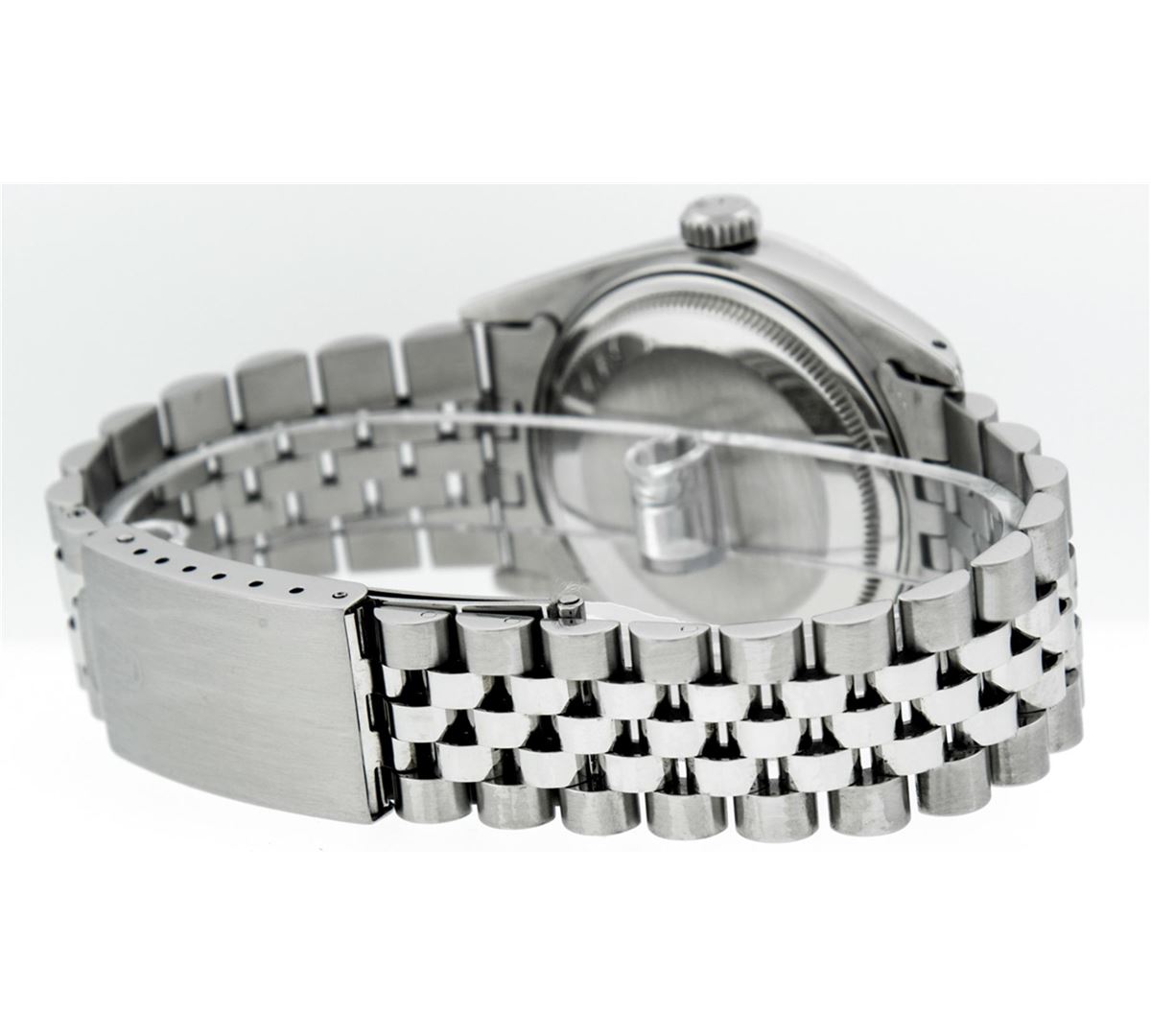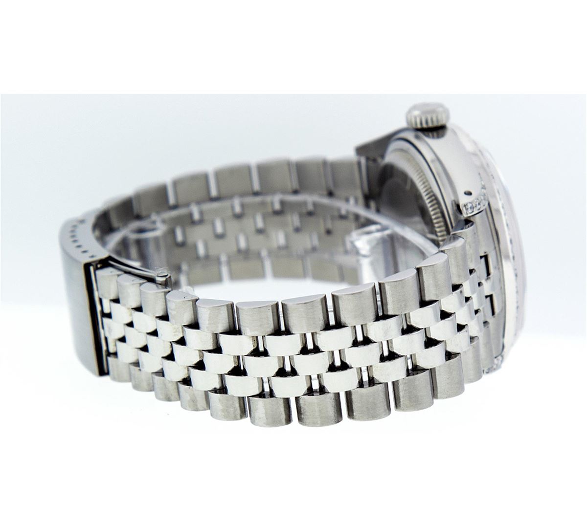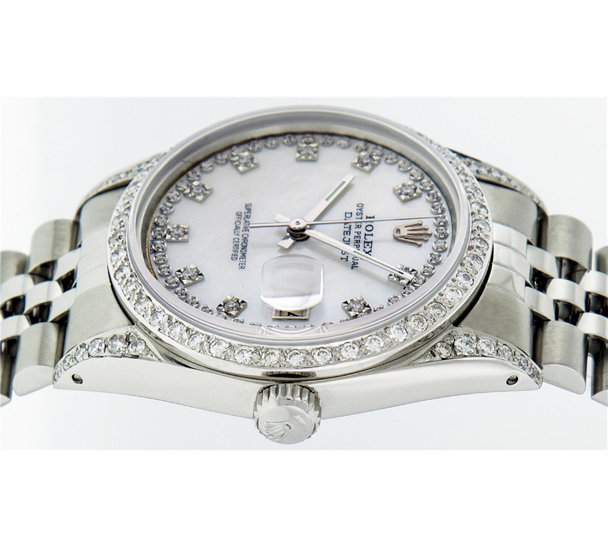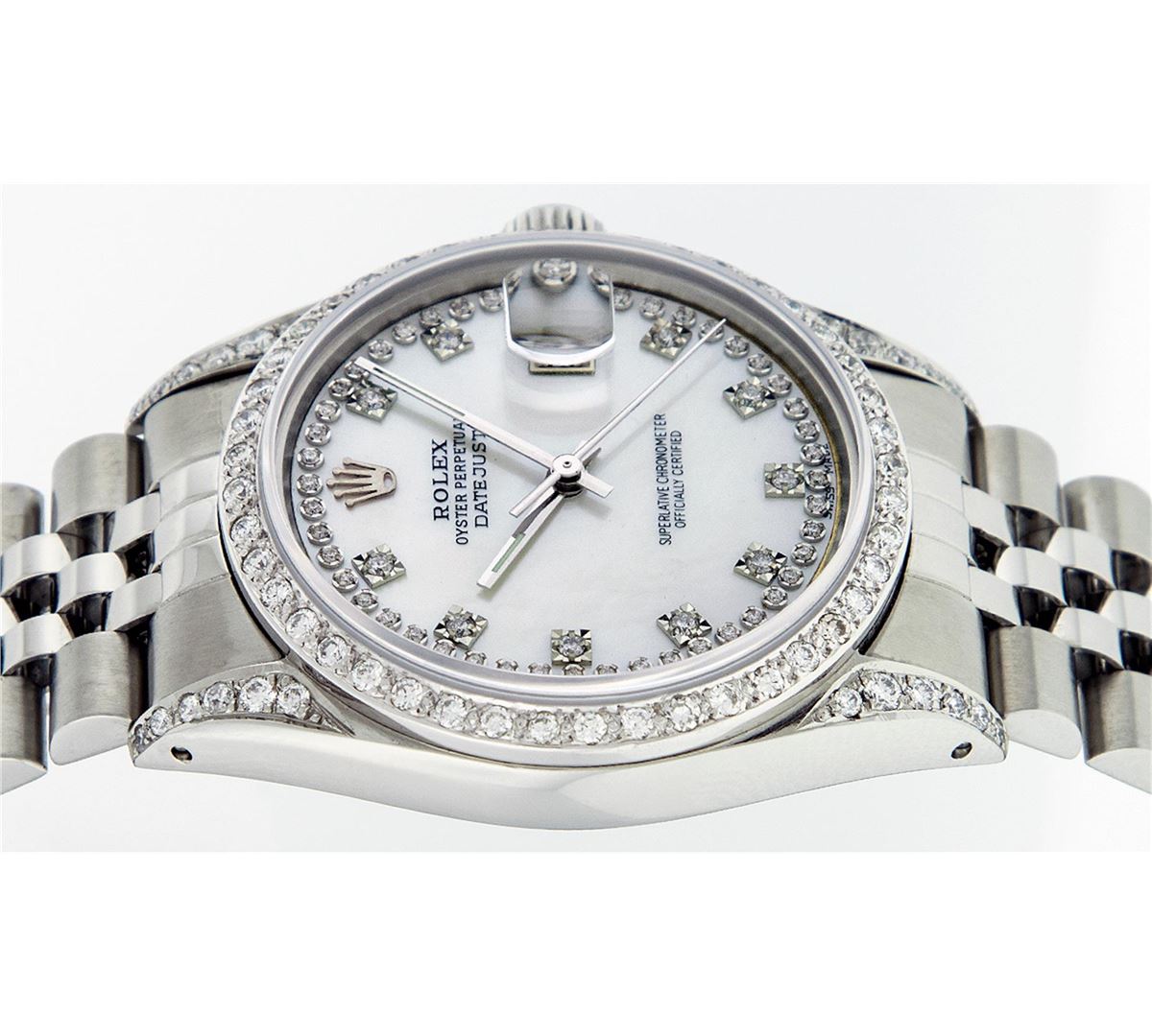 One Mens Rolex Datejust Polished, Serviced & Electronically Tested, Stainless Steel Case:36mm, Stainless Steel Crown, Custom Bezel: 18K White Gold Beadset Diamond Bezel, Diamond Count: 44 Diamonds. Total Weight 1.0 Carat, Clarity: SI-VS, Color: G to H. Custom Crystal: Synthetic Sapphire Cyclops Lens. Movement: Automatic Winding Movement Caliber 3035. Custom Dial: Mother Of Pearl String Diamond Dial VVS, Diamond Count: 58 Diamond In Dial G To H In Color, Clarity: VVS. Date Window: 3 O'Clock Position Date Display, Quickset, Model: Datejust Condition: G-6 Extra Fine. Bracelet: Stainless Steel Jubilee. Bright Polish & Satin Finish. 7.0 Inch Length, Adjustable. Standard Clasp, With Rolex Logo.