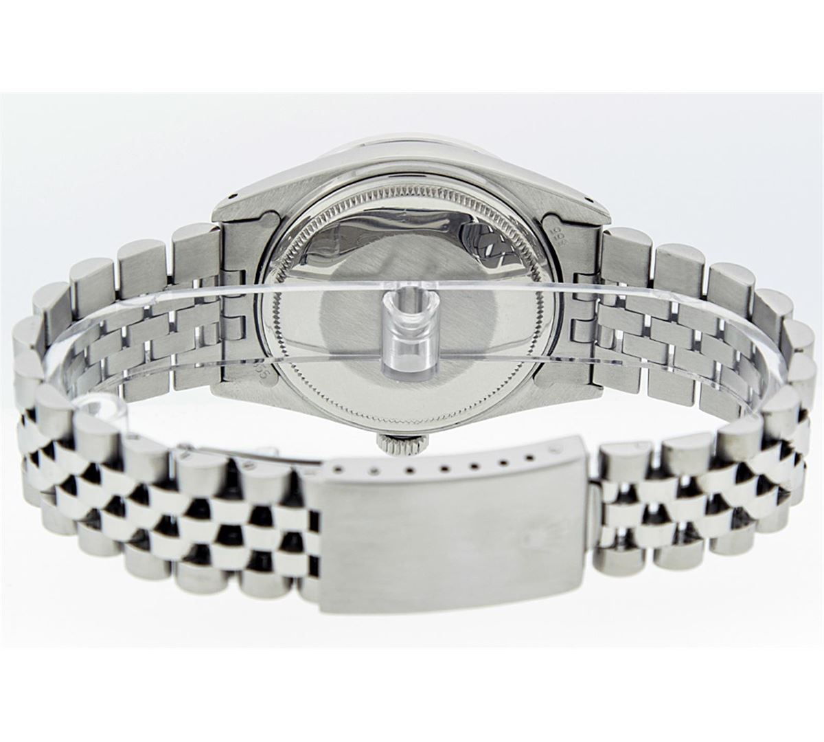 One Mens Stainless Steel Rolex Datejust Polished Bright with Satin Finish, Fully Serviced & Electronically Tested, Stainless Steel Case:36mm, Stainless Steel Crown, Custom Bezel: 18K White Gold Beadset Diamond Bezel, Diamond Count: 44 Diamonds, Total Weight 1.00 Carat, Clarity: SI-VS, Color: G to H. Custom Crystal: Synthetic Sapphire Cyclops Lens. Movement: Automatic Winding Movement Caliber 3035. Custom Dial: Ice Pink Diamond Dial, 10 Diamonds in Dial, G To H In Color, Clarity: SI-VS. Date Window: 3 O'Clock Position Date Display, Quickset, Model: Datejust, Condition: G-6 Extra Fine. Bracelet:Stainless Steel Jubilee. Bright Polish & Satin Finish. 7.0 Inch Length, Adjustable. Standard Clasp, With Rolex Logo.