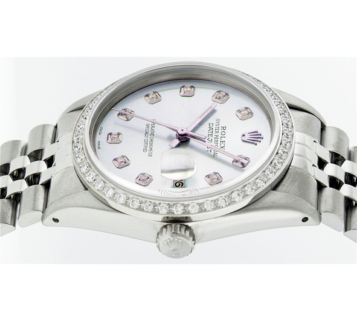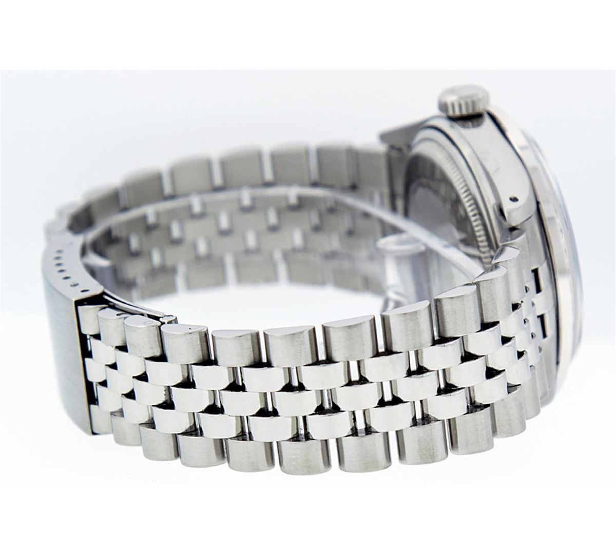One Mens Stainless Steel Rolex Datejust Polished Bright with Satin Finish, Fully Serviced & Electronically Tested, Stainless Steel Case:36mm, Stainless Steel Crown, Custom Bezel: 18K White Gold Beadset Diamond Bezel, Diamond Count: 44 Diamonds Total Weigh