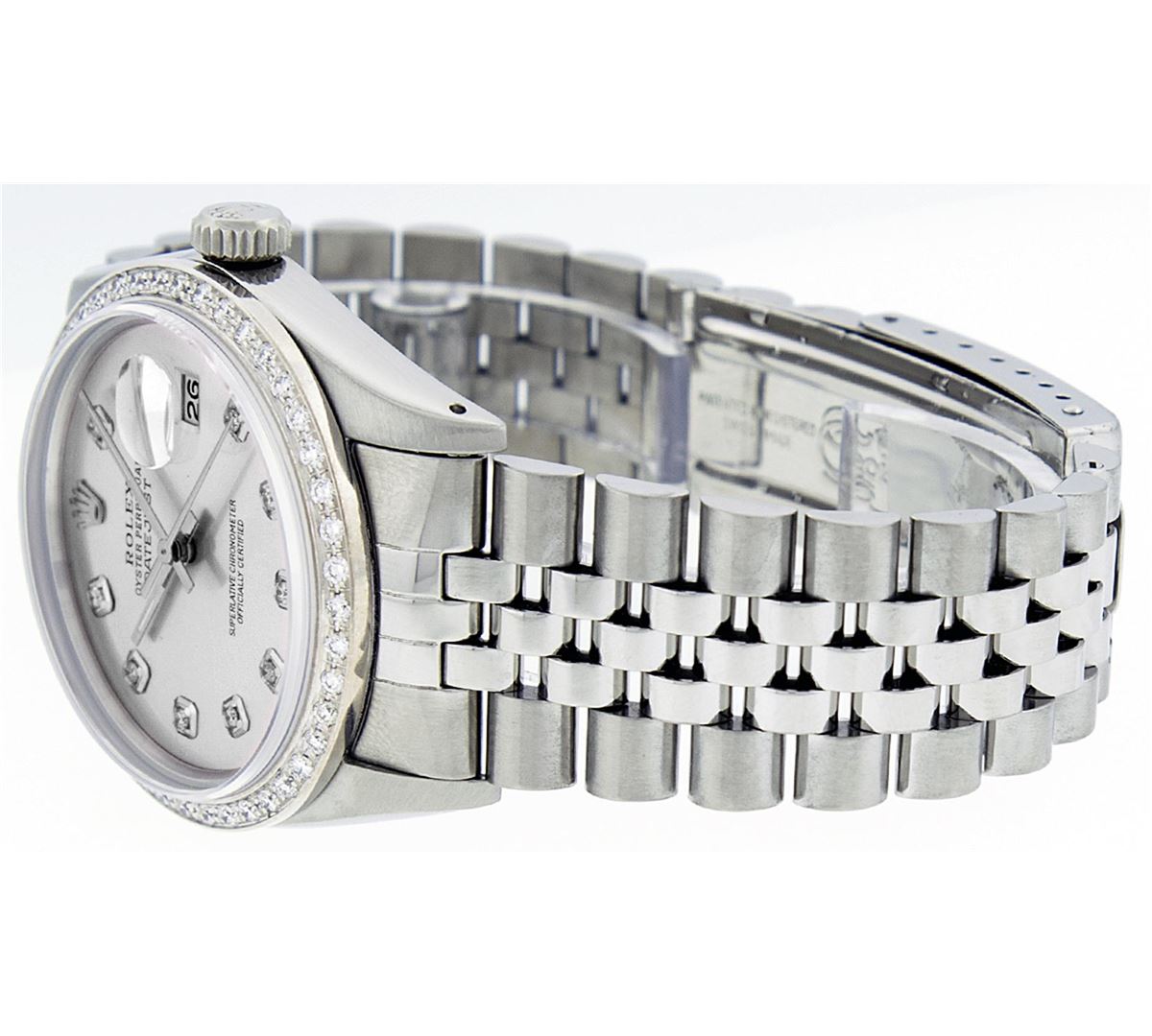 One Mens Stainless Steel Rolex Datejust Polished Bright with Satin Finish, Fully Serviced & Electronically Tested, Stainless Steel Case:36mm, Stainless Steel Crown, Custom Bezel: 18K White Gold Beadset Diamond Bezel, Diamond Count: 44 Diamonds Total Weigh