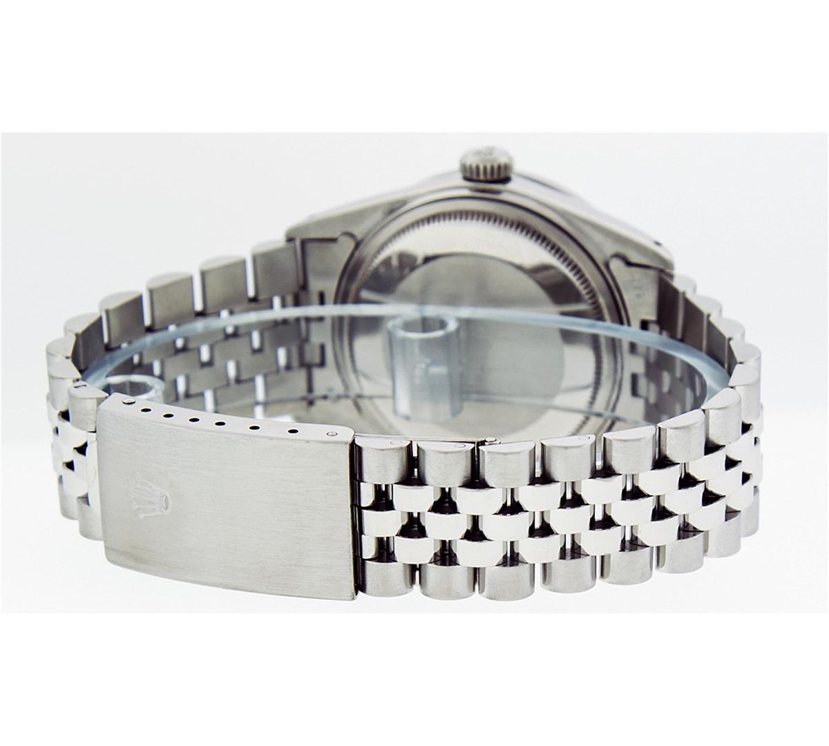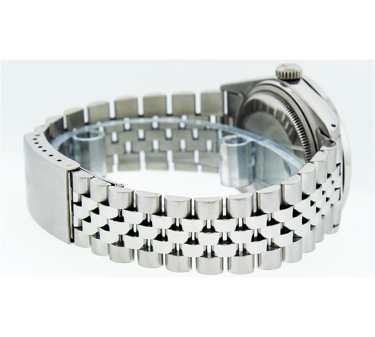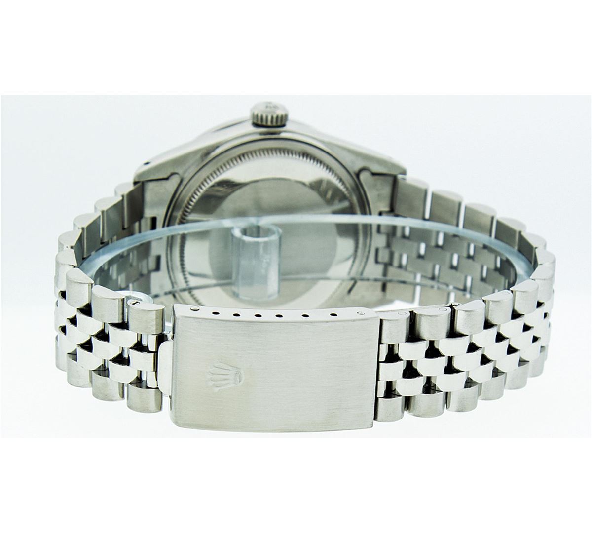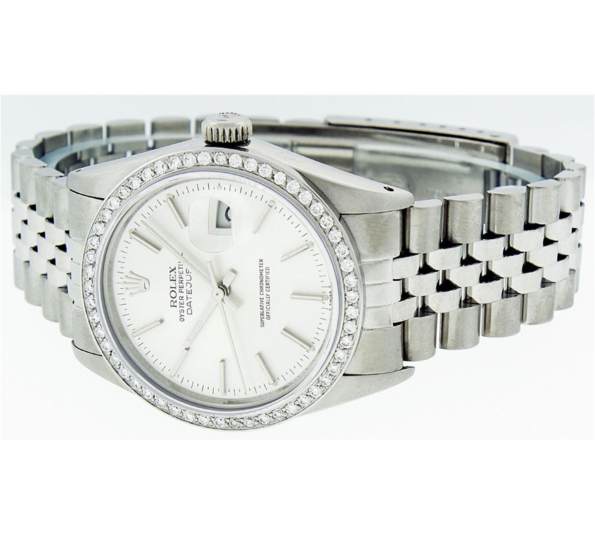 One Mens Rolex Datejust Polished Bright with Satin Finish, Serviced & Electronically Tested, Stainless Steel Case:36mm, Stainless Steel Crown, Custom Bezel: Stainless Steel Beadset Diamond Bezel, Diamond Count: 54 Diamonds Total Weight 1.00 Carat, Clarity: SI-VS, Color: G to H. Custom Crystal: Synthetic Sapphire Cyclops Lens. Movement: Automatic Winding Movement Caliber 3035. Dial: Silver Index Dial With Small Track. Date Window: 3 O'Clock Position Date Display, Quickset, Model: Datejust. Condition: G-6 Extra Fine. Bracelet:Stainless Steel Jubilee. Bright Polish & Satin Finish. 7.0 Inch Length, Adjustable. Standard Clasp, With Rolex Logo.