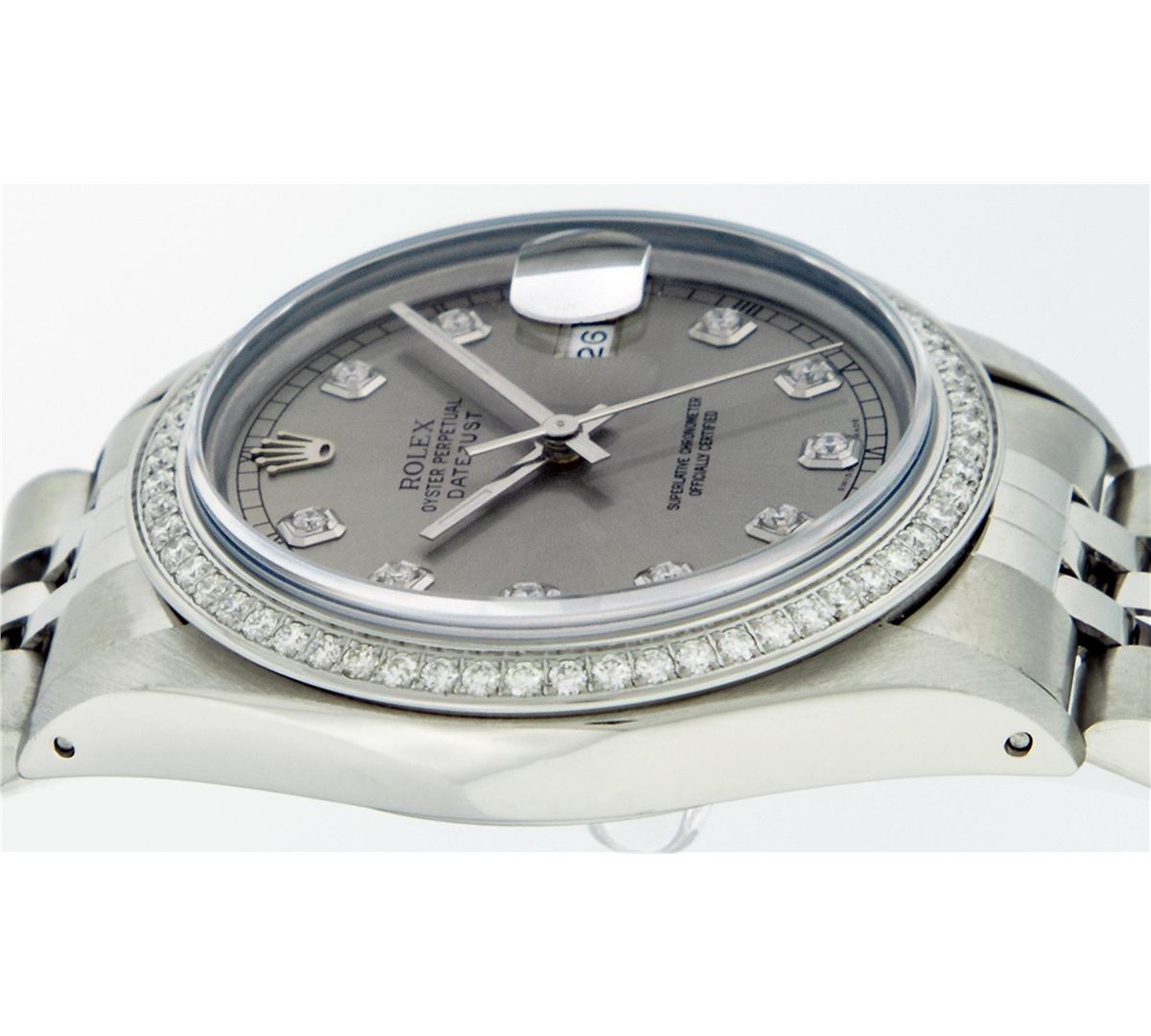 One Mens Rolex Datejust Polished Bright with Satin Finish, Serviced & Electronically Tested, Stainless Steel Case:36mm, Stainless Steel Crown, Custom Bezel: Stainless Steel Beadset Diamond Bezel, Diamond Count: 54 Diamonds Total Weight 1.00 Carat, Clarity: SI-VS, Color: G to H. Custom Crystal: Synthetic Sapphire Cyclops Lens. Movement: Automatic Winding Movement Caliber 3035. Custom Dial: Slate Grey With Diamond Hour Markers and Square Roman Track, Diamond Count: 10 Diamond in Dial G To H In Color, Clarity: SI-VS. Date Window: 3 O'Clock Position Date Display, Quickset, Model: Datejust Condition: G-6 Extra Fine. Bracelet: Stainless Steel Jubilee. Bright Polish & Satin Finish. 7.0 Inch Length, Adjustable. Standard Clasp, With Rolex Logo.