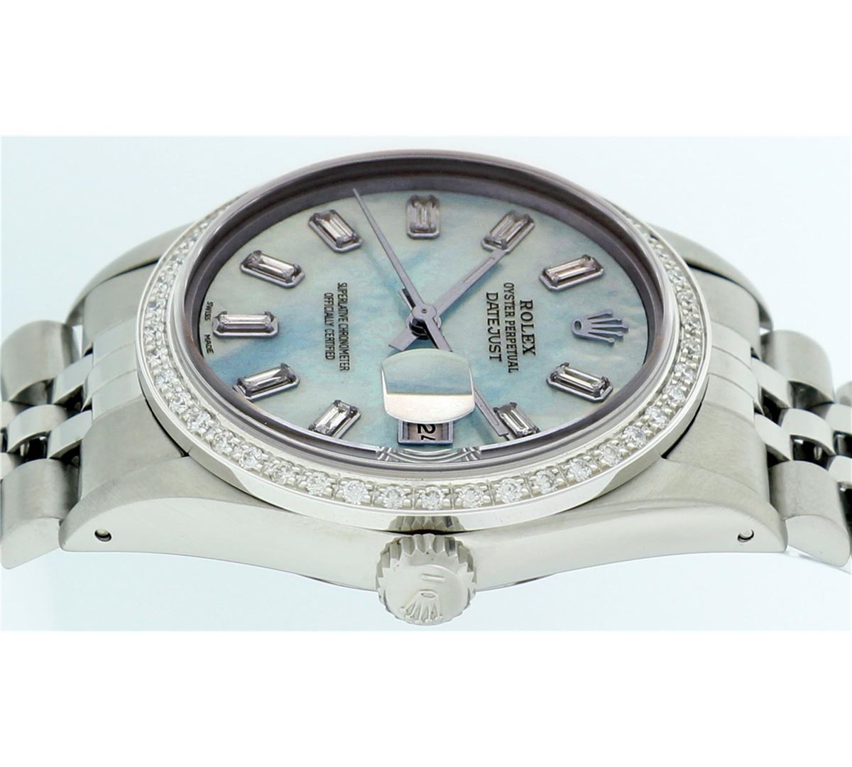One Mens Rolex Datejust Polished, Serviced & Electronically Tested, Stainless Steel Case:36mm, Stainless Steel Crown, Custom Bezel: 18K White Gold Beadset Diamond Bezel, Diamond Count: 44 Diamonds, Total Weight 1.00 Carat, Clarity: SI-VS, Color: G to H. Custom Crystal: Synthetic Sapphire Cyclops Lens. Movement: Automatic Winding Movement Caliber 3035. Custom Dial: Blue MOP Baguette Diamond Hour Markers, Diamond Count: 10 Diamond Baguette. G To H In Color, Clarity: SI-VS. Date Window: 3 O'Clock Position Date Display, Quickset, Model: Datejust. Condition: G-6 Extra Fine. Bracelet: Stainless Steel Jubilee. Bright Polish & Satin Finish. 7.0 Inch Length, Adjustable. Standard Clasp, With Rolex Logo