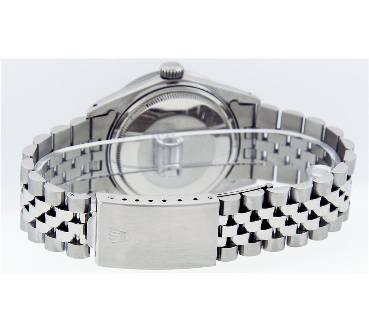 One Mens Rolex Datejust Polished Bright with Satin Finish, Serviced & Electronically Tested, Stainless Steel Case:36mm, Stainless Steel Crown, Custom Bezel: Stainless Steel Beadset Diamond Bezel, Diamond Count: 54 Diamonds Total Weight 1.00 Carat, Clarity: SI-VS, Color: G to H. Custom Crystal: Synthetic Sapphire Cyclops Lens. Movement: Automatic Winding Movement Caliber 3035. Custom Dial: Slate Grey With Diamond Hour Markers and Square Roman Track, Diamond Count: 10 Diamond in Dial G To H In Color, Clarity: SI-VS. Date Window: 3 O'Clock Position Date Display, Quickset, Model: Datejust Condition: G-6 Extra Fine. Bracelet: Stainless Steel Jubilee. Bright Polish & Satin Finish. 7.0 Inch Length, Adjustable. Standard Clasp, With Rolex Logo.