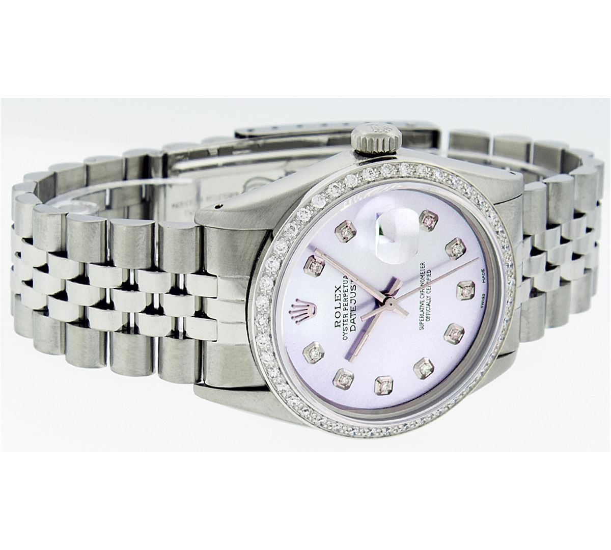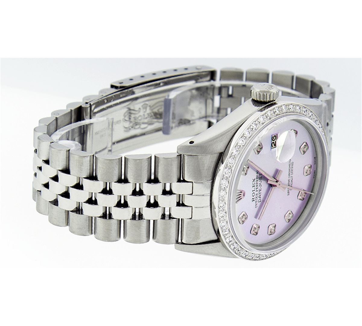 One Mens Stainless Steel Rolex Datejust Polished Bright with Satin Finish, Fully Serviced & Electronically Tested, Stainless Steel Case:36mm, Stainless Steel Crown, Custom Bezel: 18K White Gold Beadset Diamond Bezel, Diamond Count: 44 Diamonds Total Weight 1.00 Carat, Clarity: SI-VS, Color: G to H. Custom Crystal: Synthetic Sapphire Cyclops Lens. Movement: Automatic Winding Movement Caliber 3035. Custom Dial: Light Purple With Diamond Hour Markers, Diamond Count: 10 Diamonds in Dial G To H In Color, Clarity: SI-VS. Date Window: 3 O'Clock Position Date Display, Quickset, Model: Datejust, Condition: G-6 Extra Fine. Bracelet: Stainless Steel Jubilee. Bright Polish & Satin Finish. 7.0 Inch Length, Adjustable. Standard Clasp, With Rolex Logo.