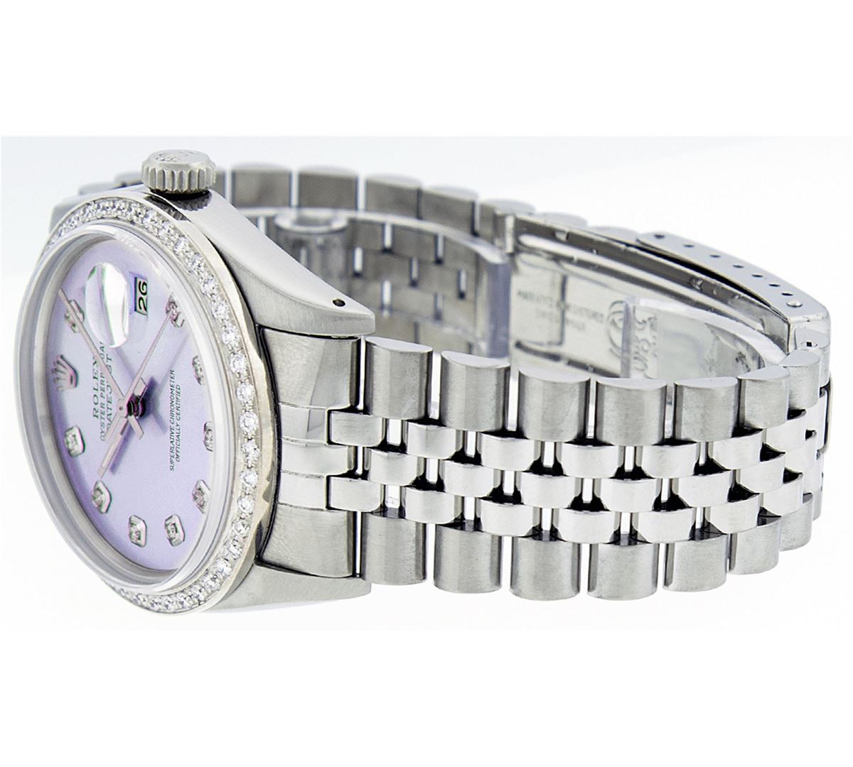 One Mens Stainless Steel Rolex Datejust Polished Bright with Satin Finish, Fully Serviced & Electronically Tested, Stainless Steel Case:36mm, Stainless Steel Crown, Custom Bezel: 18K White Gold Beadset Diamond Bezel, Diamond Count: 44 Diamonds Total Weight 1.00 Carat, Clarity: SI-VS, Color: G to H. Custom Crystal: Synthetic Sapphire Cyclops Lens. Movement: Automatic Winding Movement Caliber 3035. Custom Dial: Light Purple With Diamond Hour Markers, Diamond Count: 10 Diamonds in Dial G To H In Color, Clarity: SI-VS. Date Window: 3 O'Clock Position Date Display, Quickset, Model: Datejust, Condition: G-6 Extra Fine. Bracelet: Stainless Steel Jubilee. Bright Polish & Satin Finish. 7.0 Inch Length, Adjustable. Standard Clasp, With Rolex Logo.
