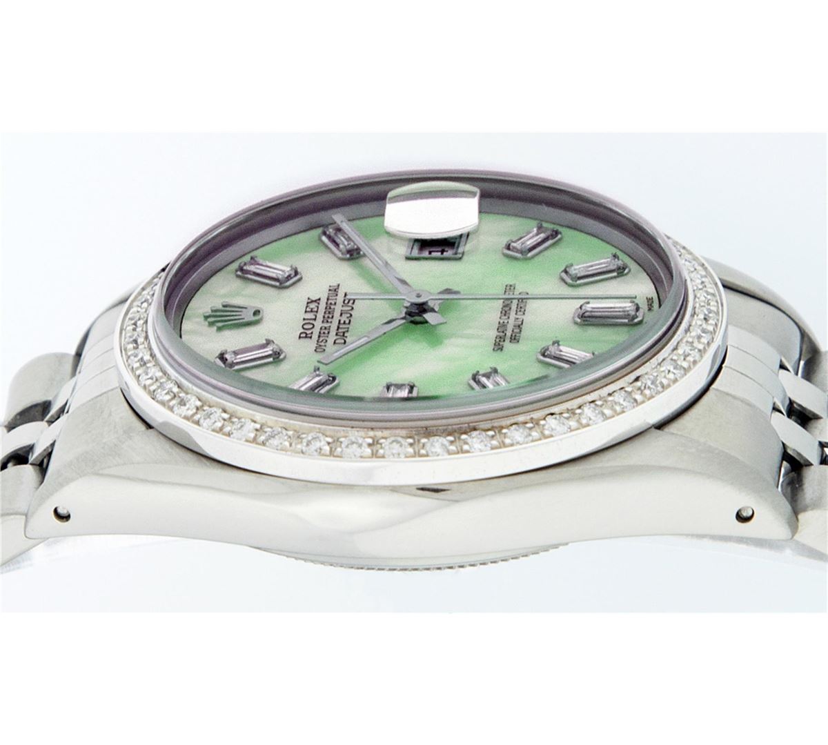 One Mens Rolex Datejust Polished, Serviced & Electronically Tested, Stainless Steel Case:36mm, Stainless Steel Crown, Custom Bezel: 18K White Gold Beadset Diamond Bezel, Diamond Count: 44 Diamonds, Total Weight 1.00 Carat, Clarity: SI-VS, Color: G to H. Custom Crystal: Synthetic Sapphire Cyclops Lens. Movement: Automatic Winding Movement Caliber 3035. Custom Dial: Green MOP Baguette Diamond Hour Markers, Diamond Count: 10 Diamond Baguette. G To H In Color, Clarity: SI-VS. Date Window: 3 O'Clock Position Date Display, Quickset, Model: Datejust. Condition: G-6 Extra Fine. Bracelet: Stainless Steel Jubilee. Bright Polish & Satin Finish. 7.0 Inch Length, Adjustable. Standard Clasp, With Rolex Logo.