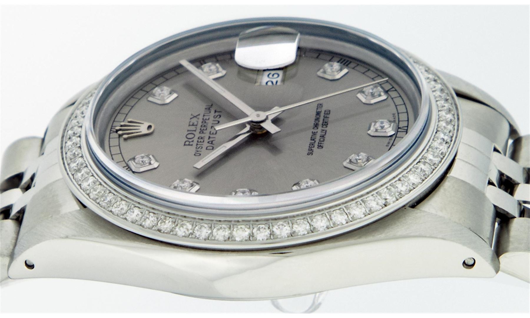 One Mens Rolex Datejust Polished Bright with Satin Finish, Serviced & Electronically Tested, Stainless Steel Case:36mm, Stainless Steel Crown, Custom Bezel: Stainless Steel Beadset Diamond Bezel, Diamond Count: 54 Diamonds Total Weight 1.00 Carat, Clarity: SI-VS, Color: G to H. Custom Crystal: Synthetic Sapphire Cyclops Lens. Movement: Automatic Winding Movement Caliber 3035. Custom Dial: Slate Grey With Diamond Hour Markers and Square Roman Track, Diamond Count: 10 Diamond in Dial G To H In Color, Clarity: SI-VS. Date Window: 3 O'Clock Position Date Display, Quickset, Model: Datejust Condition: G-6 Extra Fine. Bracelet: Stainless Steel Jubilee. Bright Polish & Satin Finish. 7.0 Inch Length, Adjustable. Standard Clasp, With Rolex Logo.