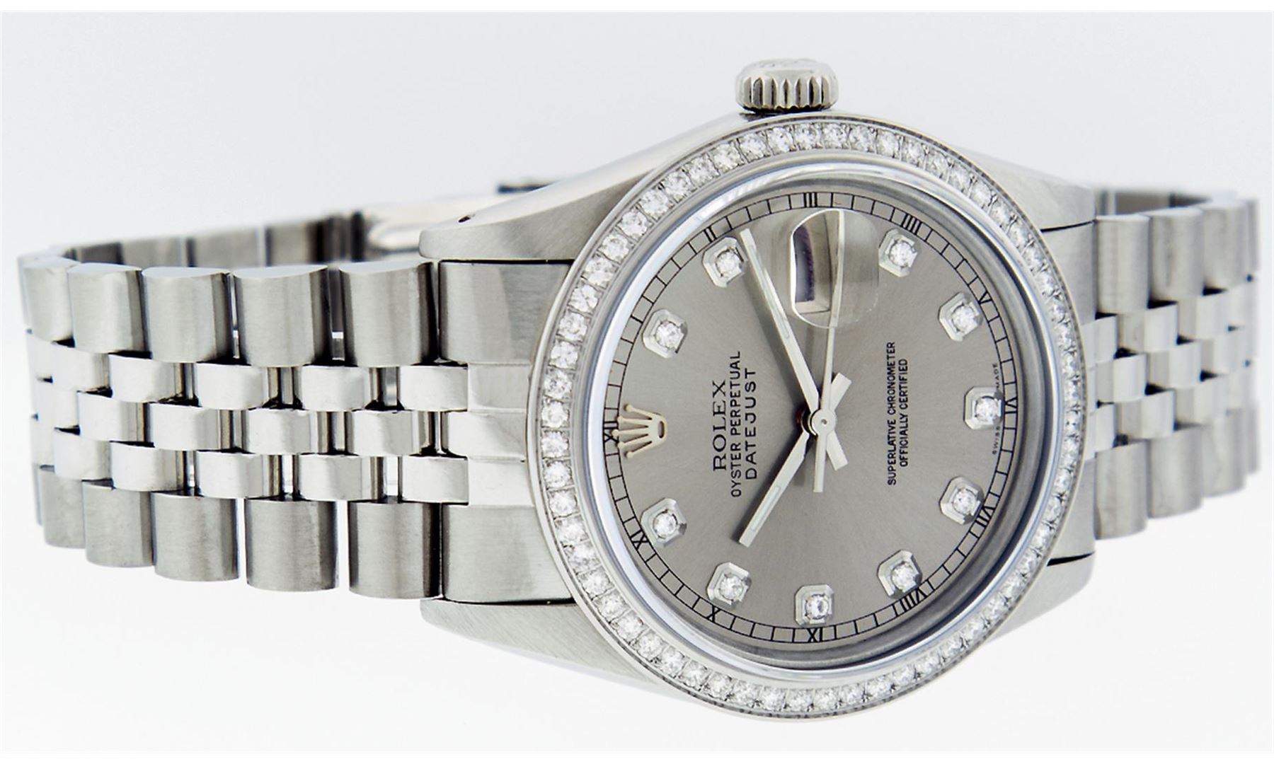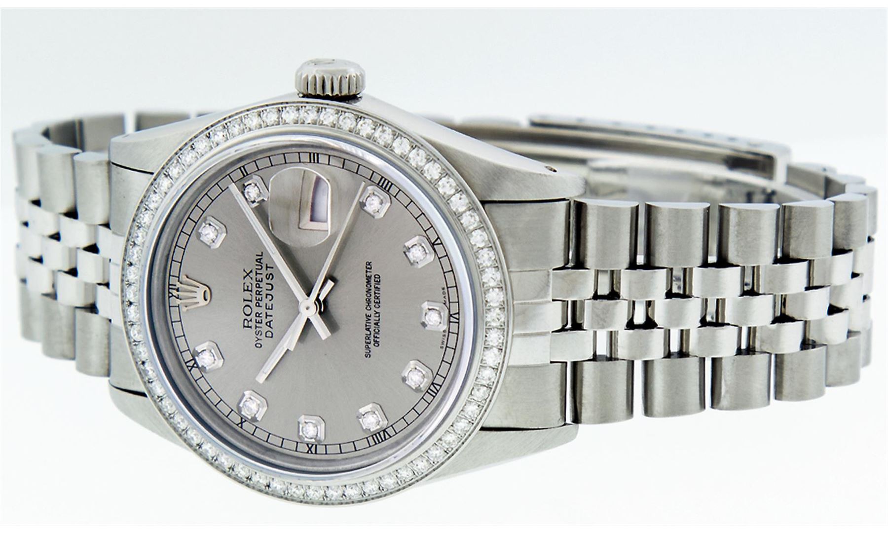 One Mens Rolex Datejust Polished Bright with Satin Finish, Serviced & Electronically Tested, Stainless Steel Case:36mm, Stainless Steel Crown, Custom Bezel: Stainless Steel Beadset Diamond Bezel, Diamond Count: 54 Diamonds Total Weight 1.00 Carat, Clarity: SI-VS, Color: G to H. Custom Crystal: Synthetic Sapphire Cyclops Lens. Movement: Automatic Winding Movement Caliber 3035. Custom Dial: Slate Grey With Diamond Hour Markers and Square Roman Track, Diamond Count: 10 Diamond in Dial G To H In Color, Clarity: SI-VS. Date Window: 3 O'Clock Position Date Display, Quickset, Model: Datejust Condition: G-6 Extra Fine. Bracelet: Stainless Steel Jubilee. Bright Polish & Satin Finish. 7.0 Inch Length, Adjustable. Standard Clasp, With Rolex Logo.