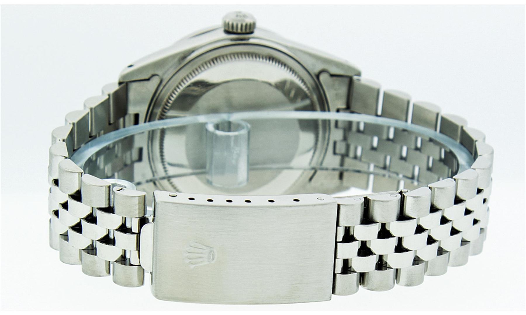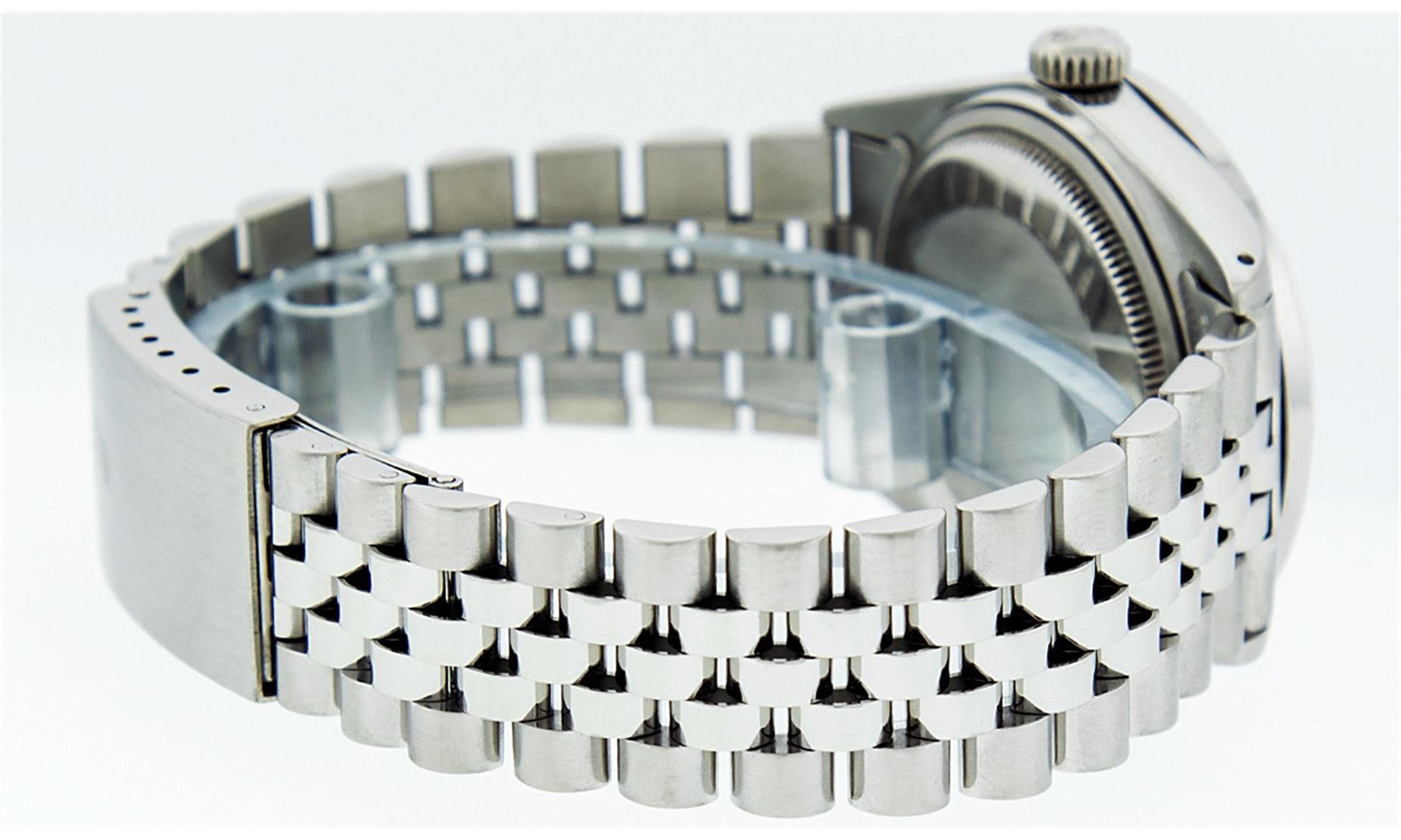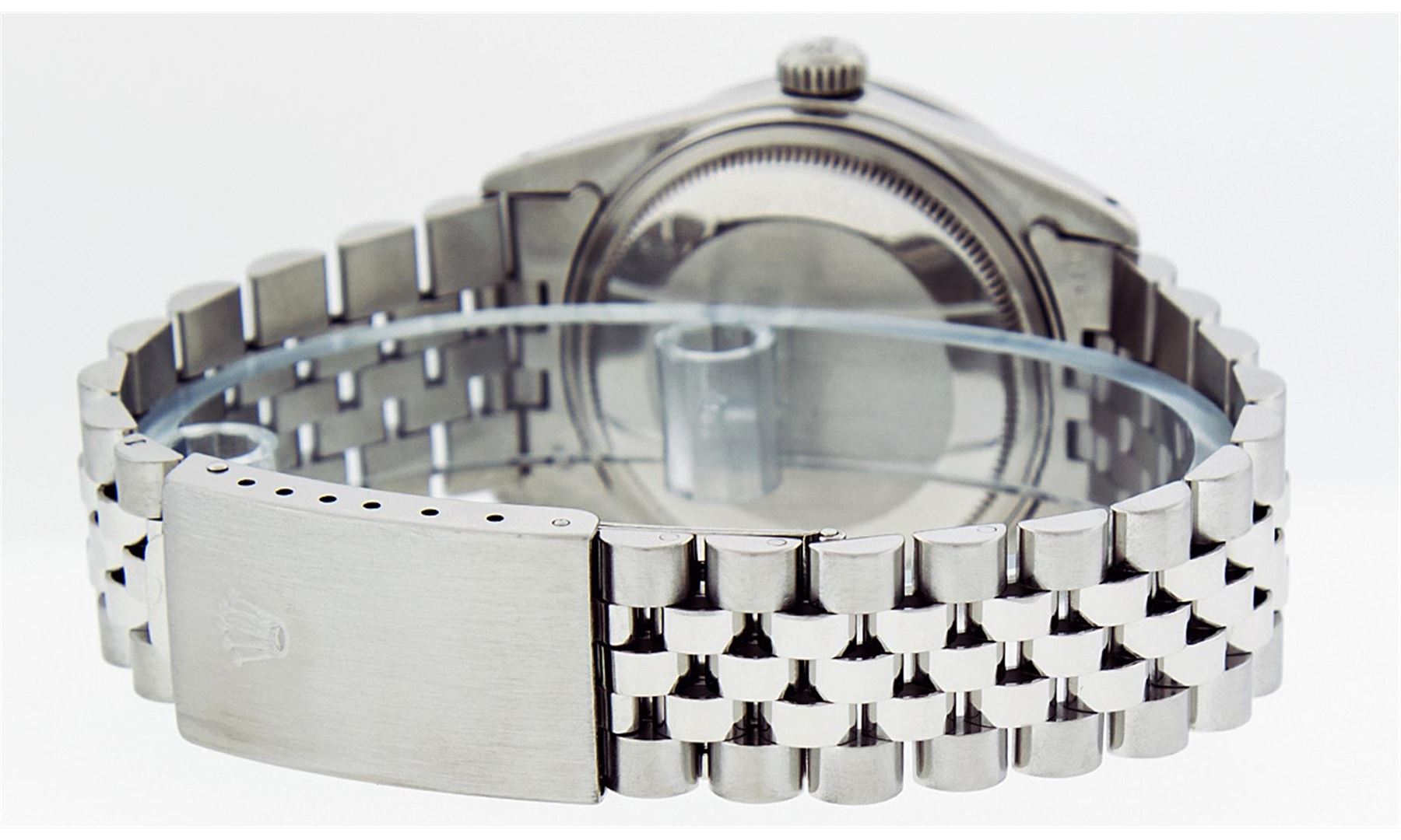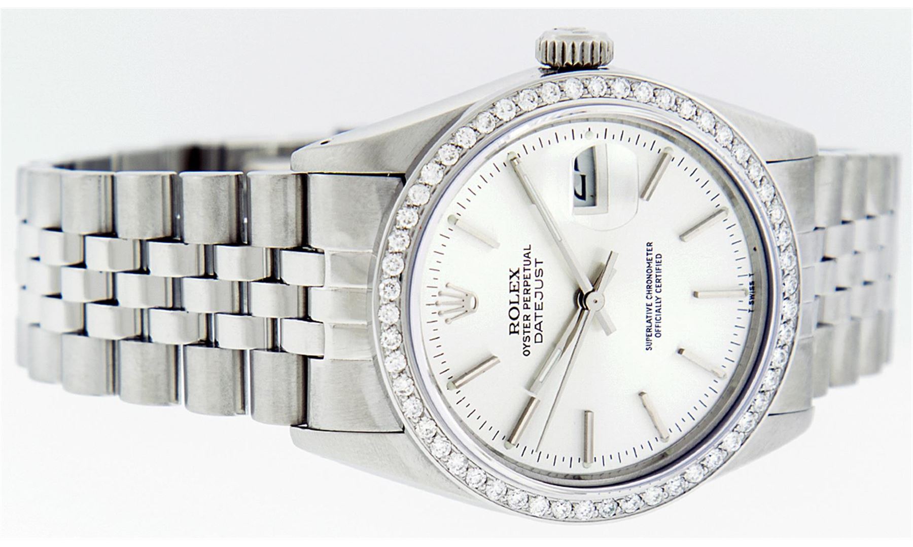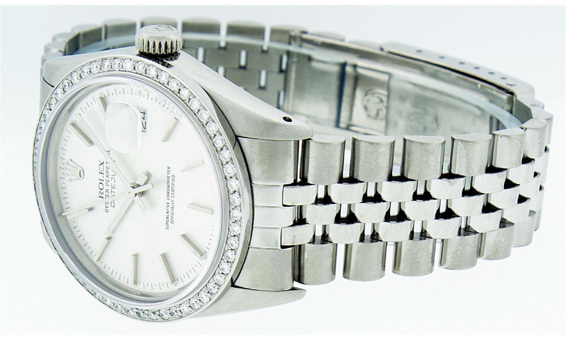 One Mens Rolex Datejust Polished Bright with Satin Finish, Serviced & Electronically Tested, Stainless Steel Case:36mm, Stainless Steel Crown, Custom Bezel: Stainless Steel Beadset Diamond Bezel, Diamond Count: 54 Diamonds Total Weight 1.00 Carat, Clarity: SI-VS, Color: G to H. Custom Crystal: Synthetic Sapphire Cyclops Lens. Movement: Automatic Winding Movement Caliber 3035. Dial: Silver Index Dial With Small Track. Date Window: 3 O'Clock Position Date Display, Quickset, Model: Datejust. Condition: G-6 Extra Fine. Bracelet:Stainless Steel Jubilee. Bright Polish & Satin Finish. 7.0 Inch Length, Adjustable. Standard Clasp, With Rolex Logo.