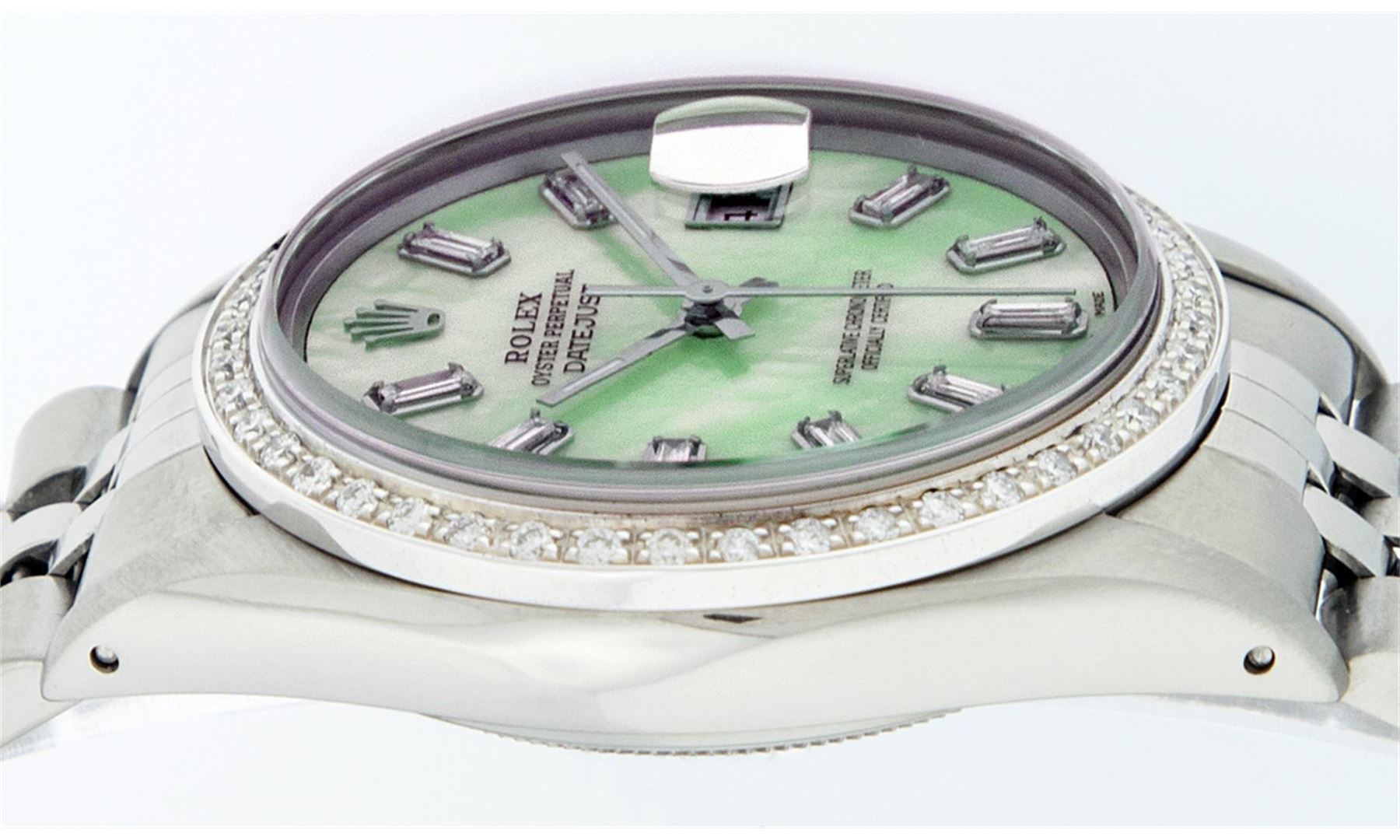 One Mens Rolex Datejust Polished, Serviced & Electronically Tested, Stainless Steel Case:36mm, Stainless Steel Crown, Custom Bezel: 18K White Gold Beadset Diamond Bezel, Diamond Count: 44 Diamonds, Total Weight 1.00 Carat, Clarity: SI-VS, Color: G to H. Custom Crystal: Synthetic Sapphire Cyclops Lens. Movement: Automatic Winding Movement Caliber 3035. Custom Dial: Green MOP Baguette Diamond Hour Markers, Diamond Count: 10 Diamond Baguette. G To H In Color, Clarity: SI-VS. Date Window: 3 O'Clock Position Date Display, Quickset, Model: Datejust. Condition: G-6 Extra Fine. Bracelet: Stainless Steel Jubilee. Bright Polish & Satin Finish. 7.0 Inch Length, Adjustable. Standard Clasp, With Rolex Logo.