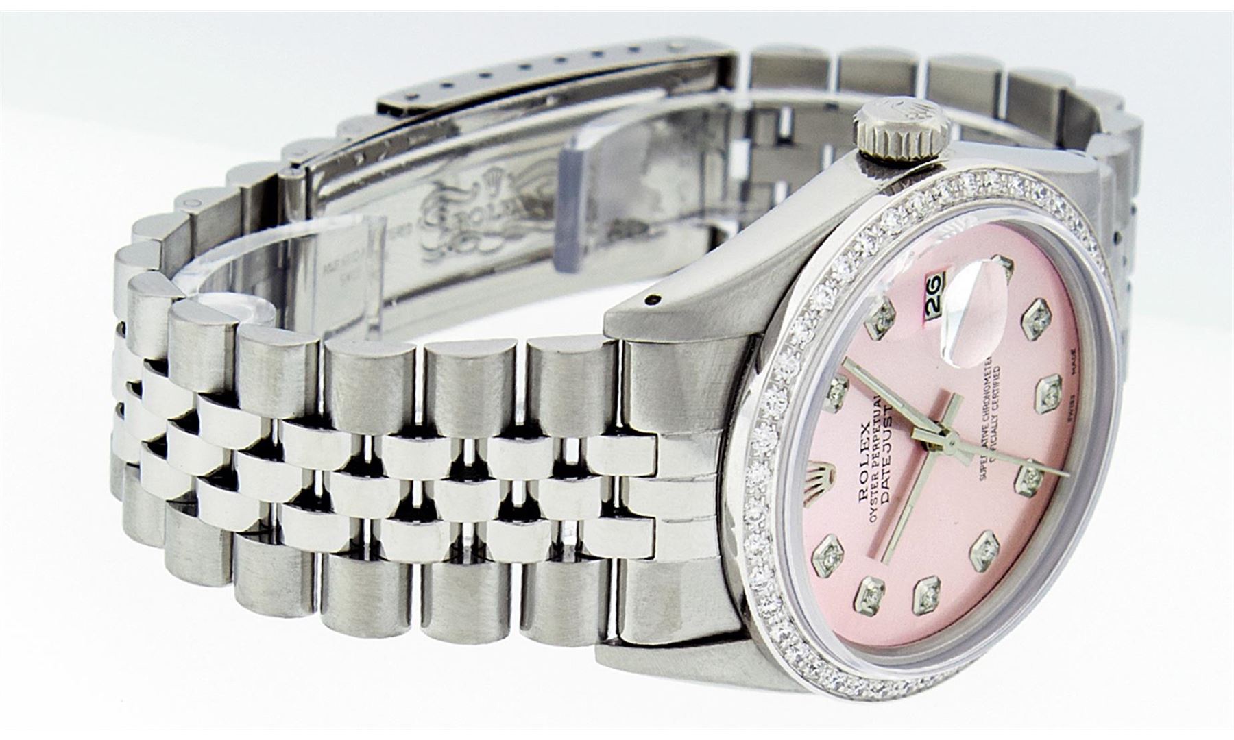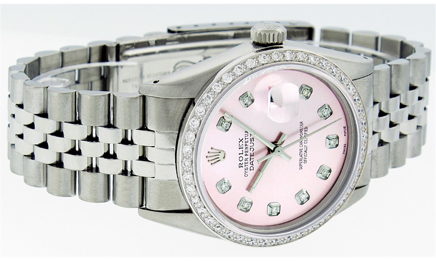 One Mens Stainless Steel Rolex Datejust Polished Bright with Satin Finish, Fully Serviced & Electronically Tested, Stainless Steel Case:36mm, Stainless Steel Crown, Custom Bezel: 18K White Gold Beadset Diamond Bezel, Diamond Count: 44 Diamonds, Total Weight 1.00 Carat, Clarity: SI-VS, Color: G to H. Custom Crystal: Synthetic Sapphire Cyclops Lens. Movement: Automatic Winding Movement Caliber 3035. Custom Dial: Ice Pink Diamond Dial, 10 Diamonds in Dial, G To H In Color, Clarity: SI-VS. Date Window: 3 O'Clock Position Date Display, Quickset, Model: Datejust, Condition: G-6 Extra Fine. Bracelet:Stainless Steel Jubilee. Bright Polish & Satin Finish. 7.0 Inch Length, Adjustable. Standard Clasp, With Rolex Logo.