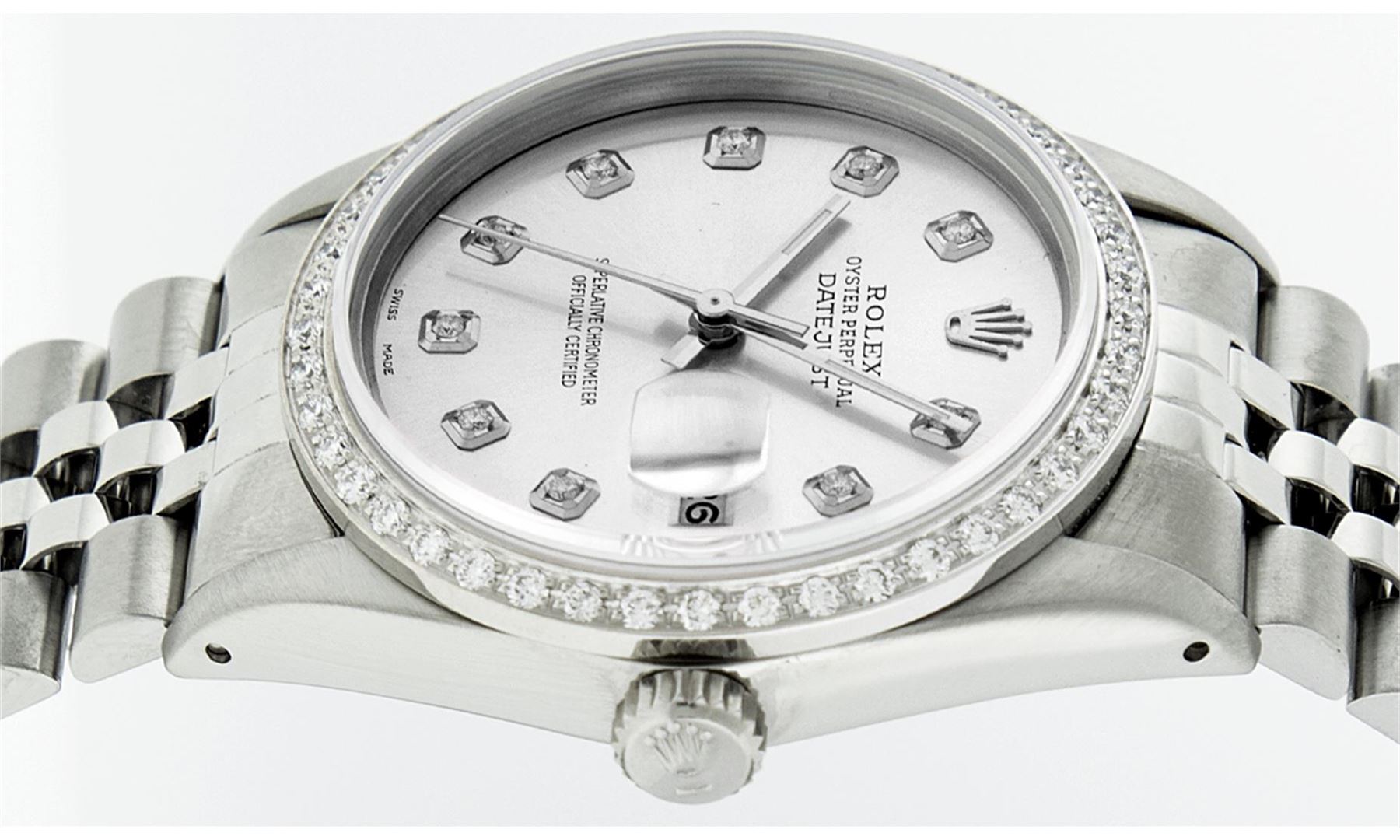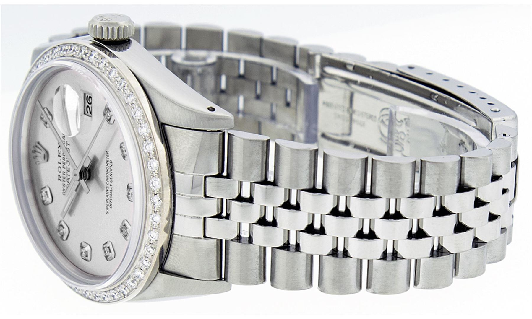 One Mens Stainless Steel Rolex Datejust Polished Bright with Satin Finish, Fully Serviced & Electronically Tested, Stainless Steel Case:36mm, Stainless Steel Crown, Custom Bezel: 18K White Gold Beadset Diamond Bezel, Diamond Count: 44 Diamonds Total Weight 1.00 Carat, Clarity: SI-VS, Color: G to H. Custom Crystal: Synthetic Sapphire Cyclops Lens. Movement: Automatic Winding Movement Caliber 3035. Custom Dial: Silver With Diamond Hour Markers, Diamond Count: 10 Diamonds in Dial G To H In Color, Clarity: SI-VS. Date Window: 3 O'Clock Position Date Display, Quickset, Model: Datejust, Condition: G-6 Extra Fine. Bracelet: Stainless Steel Jubilee. Bright Polish & Satin Finish. 7.0 Inch Length, Adjustable. Standard Clasp, With Rolex Logo.