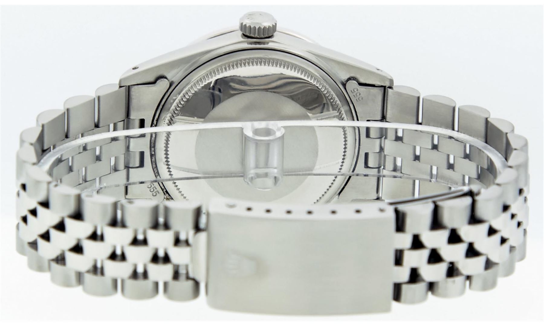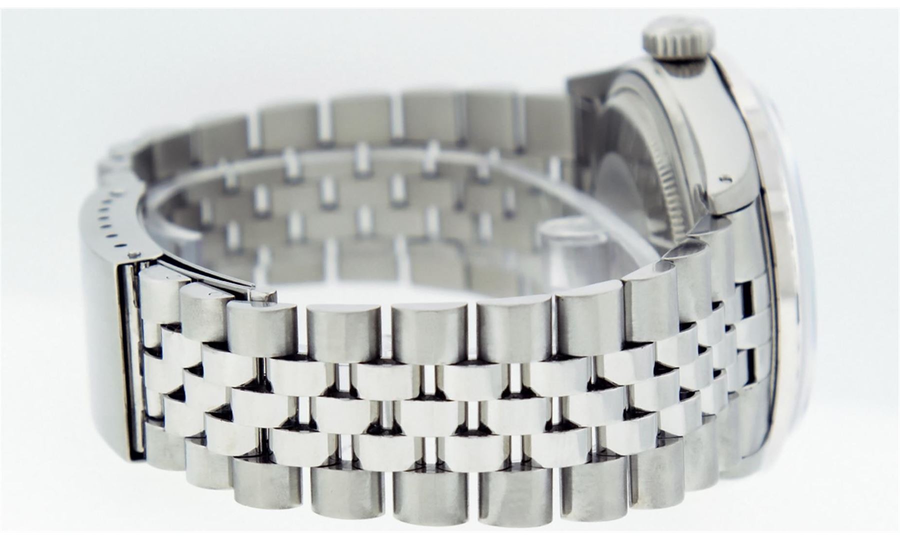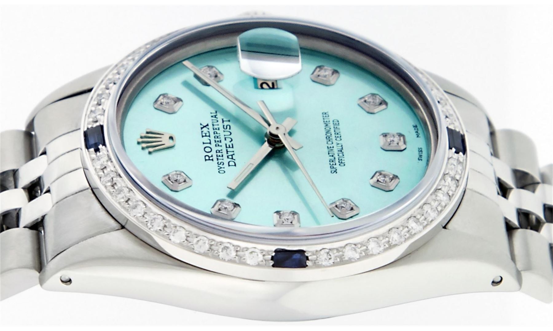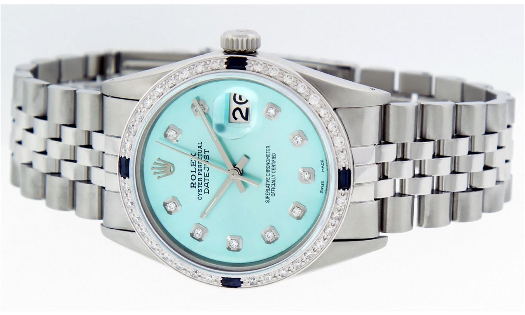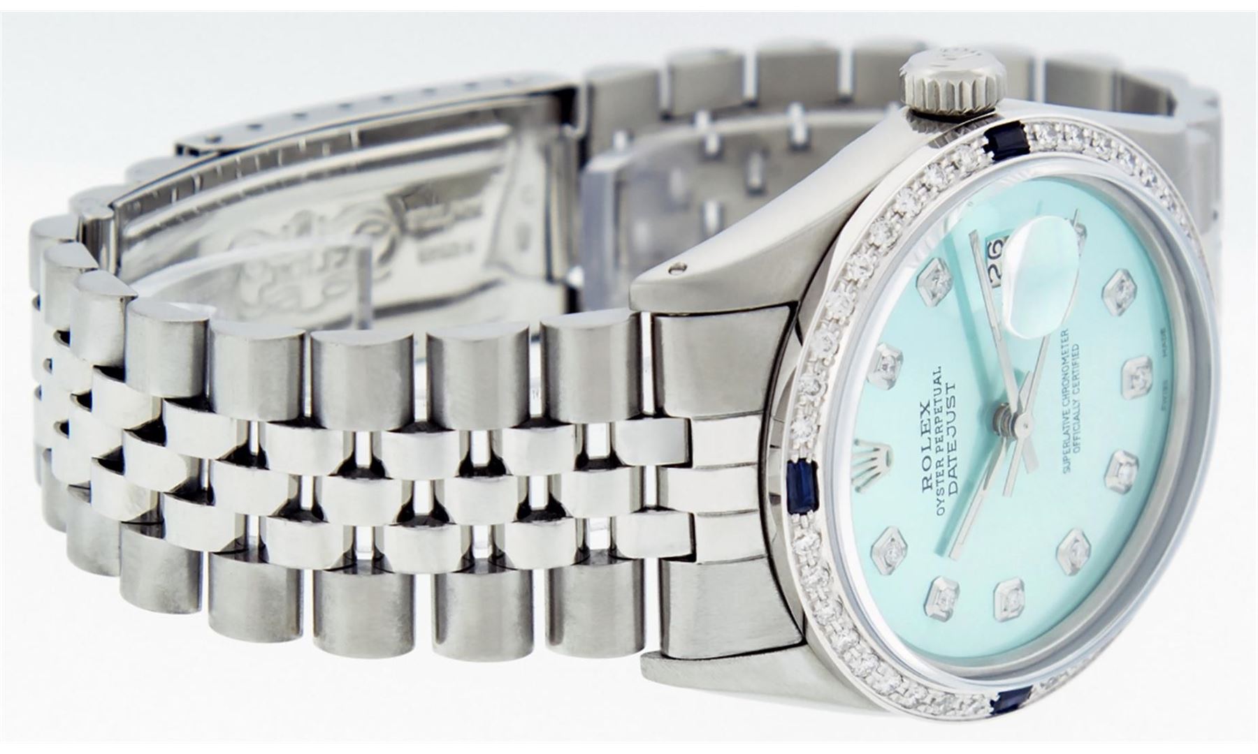 One Gents Stainless Steel Rolex Datejust Polished Bright with Satin Finish, Fully Serviced & Electronically Tested, Stainless Steel Case:36mm, Stainless Steel Crown, Custom Bezel: 18K White Gold Sapphire Beadset Diamond Bezel, Diamond Count: 36 Diamonds + 4 Sapphire, Total Weight 1.00 Carat, Clarity: SI-VS, Color: G to H. Custom Crystal: Synthetic Sapphire Cyclops Lens. Movement: Automatic Winding Movement Caliber 3035. Custom Dial: Ice Blue Diamond Dial, Diamond Count: 10 Diamonds in Dial, G To H In Color, Clarity: SI-VS. Date Window: 3 O'Clock Position Date Display, Quickset, Model: Datejust, Condition: G-6 Extra Fine. Bracelet: Stainless Steel Jubilee. Bright Polish & Satin Finish. 7.0 Inch Length, Adjustable. Standard Clasp, With Rolex Logo.