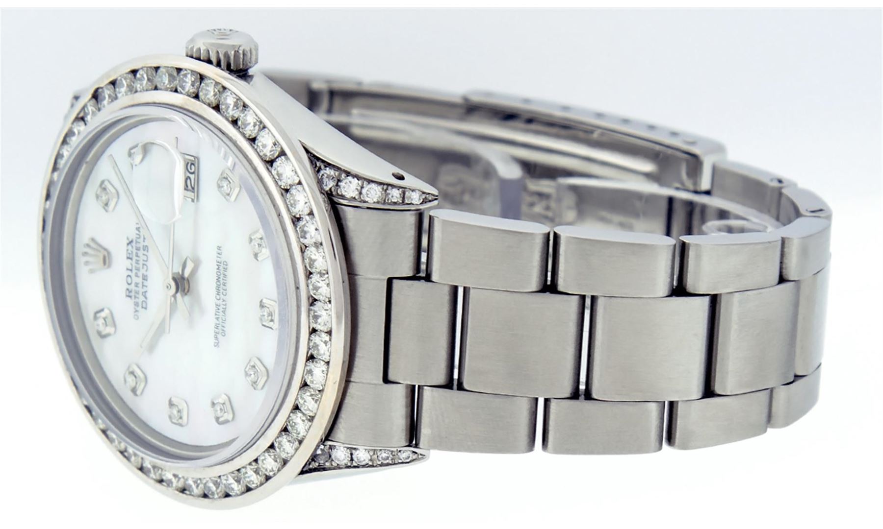 One Gents Rolex Datejust Polished Bright with Satin Finish, Serviced & Electronically Tested, Stainless Steel Case:36mm, Diamond Lugs: 24 Diamonds In Lugs, Color: G to H, Clarity: SI-VS. Stainless Steel Crown, Custom Bezel: 18K White Gold 3ct Channel Set Diamond Bezel, Diamond Count: 40 Diamonds, Total Weight 3.00 Carat, Clarity: SI-VS, Color: G to H. Custom Crystal: Synthetic Sapphire Cyclops Lens. Movement: Automatic Winding Movement Caliber 3035. Custom Dial: Mother Of Pearl Diamond Dial, Diamond Count: 10 Diamonds In Dial, Diamond Color: G To H In Color, Clarity: SI-VS. Date Window: 3 O'Clock Position Date Display, Quickset, Model: Datejust Condition: G-6 Extra Fine. Bracelet: Stainless Steel Oyster Band. Bright Polish & Satin Finish. 7.0 Inch Length, Adjustable. Standard Clasp, With Rolex Logo.