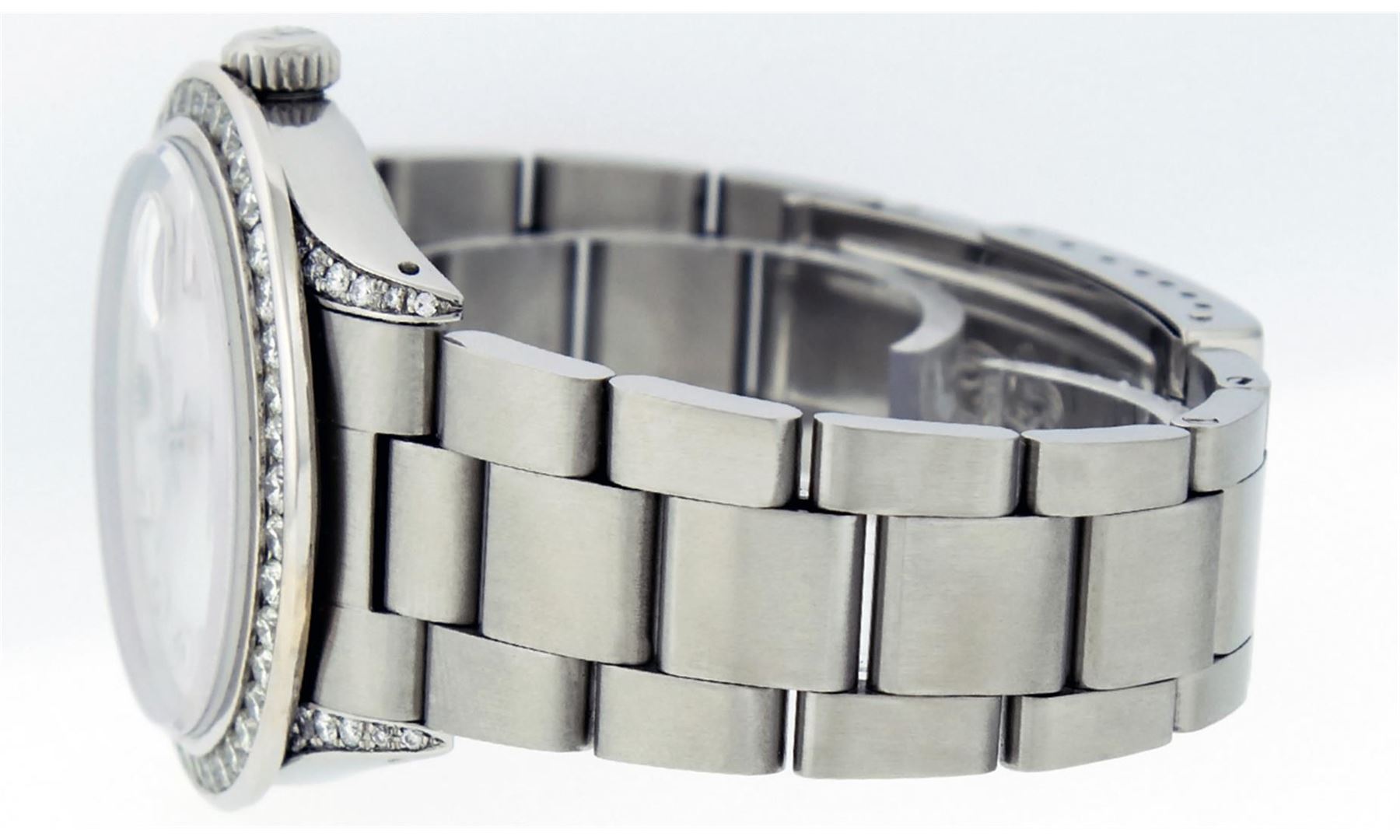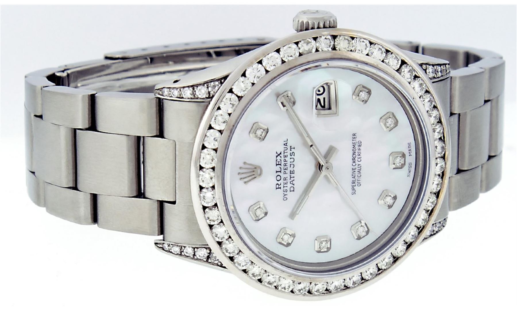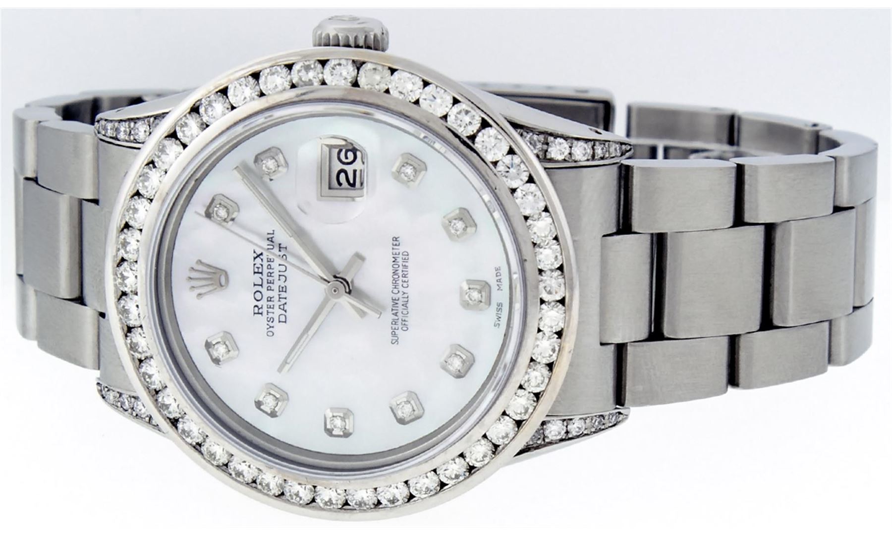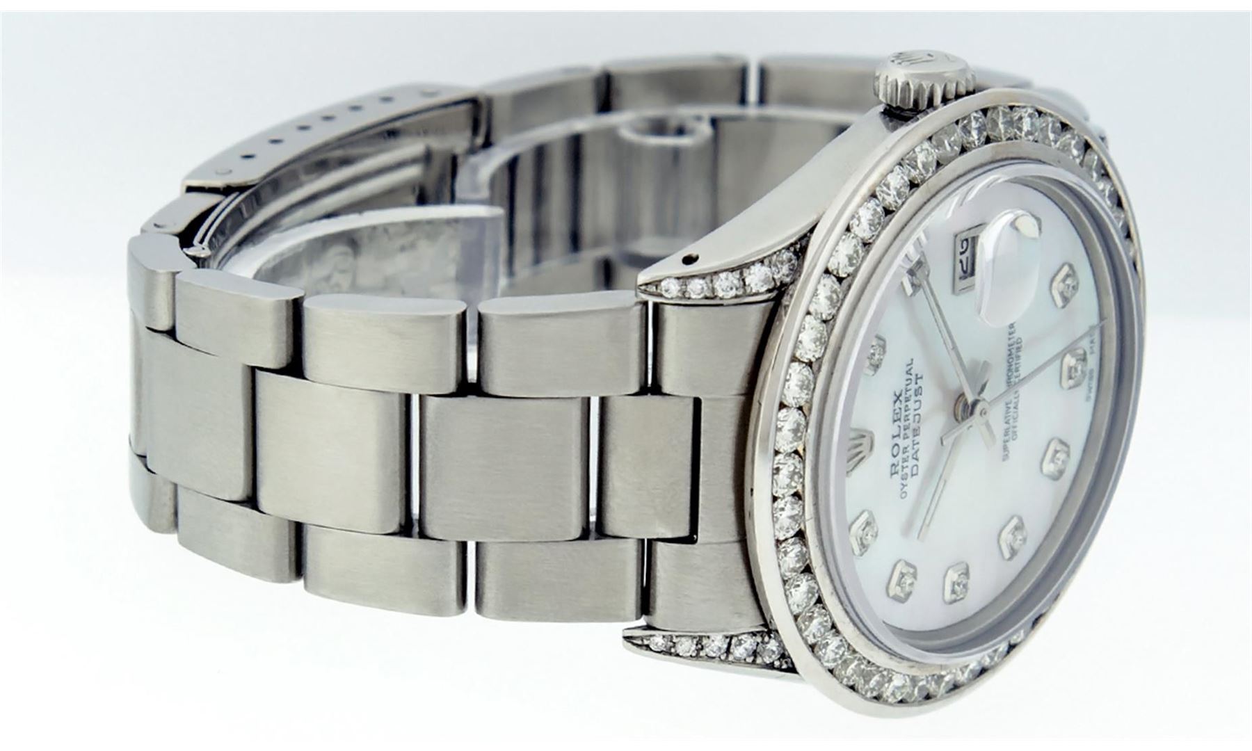 One Gents Rolex Datejust Polished Bright with Satin Finish, Serviced & Electronically Tested, Stainless Steel Case:36mm, Diamond Lugs: 24 Diamonds In Lugs, Color: G to H, Clarity: SI-VS. Stainless Steel Crown, Custom Bezel: 18K White Gold 3ct Channel Set Diamond Bezel, Diamond Count: 40 Diamonds, Total Weight 3.00 Carat, Clarity: SI-VS, Color: G to H. Custom Crystal: Synthetic Sapphire Cyclops Lens. Movement: Automatic Winding Movement Caliber 3035. Custom Dial: Mother Of Pearl Diamond Dial, Diamond Count: 10 Diamonds In Dial, Diamond Color: G To H In Color, Clarity: SI-VS. Date Window: 3 O'Clock Position Date Display, Quickset, Model: Datejust Condition: G-6 Extra Fine. Bracelet: Stainless Steel Oyster Band. Bright Polish & Satin Finish. 7.0 Inch Length, Adjustable. Standard Clasp, With Rolex Logo.