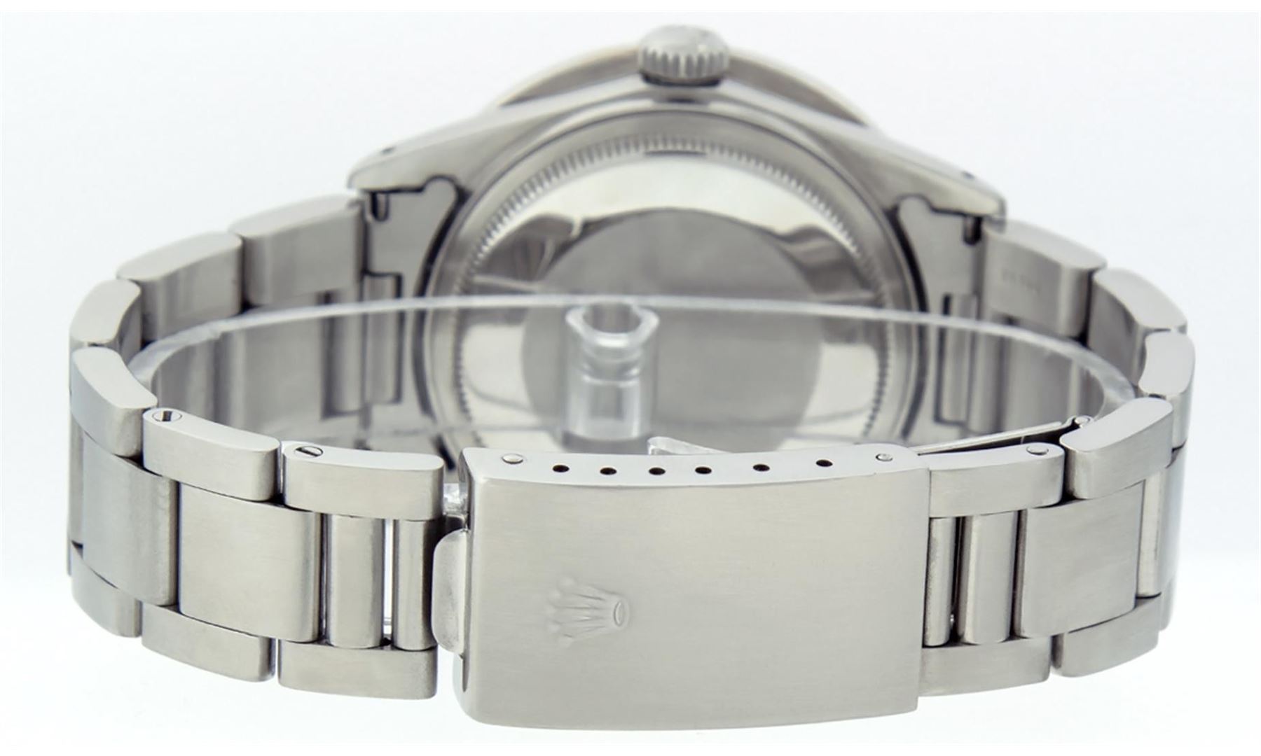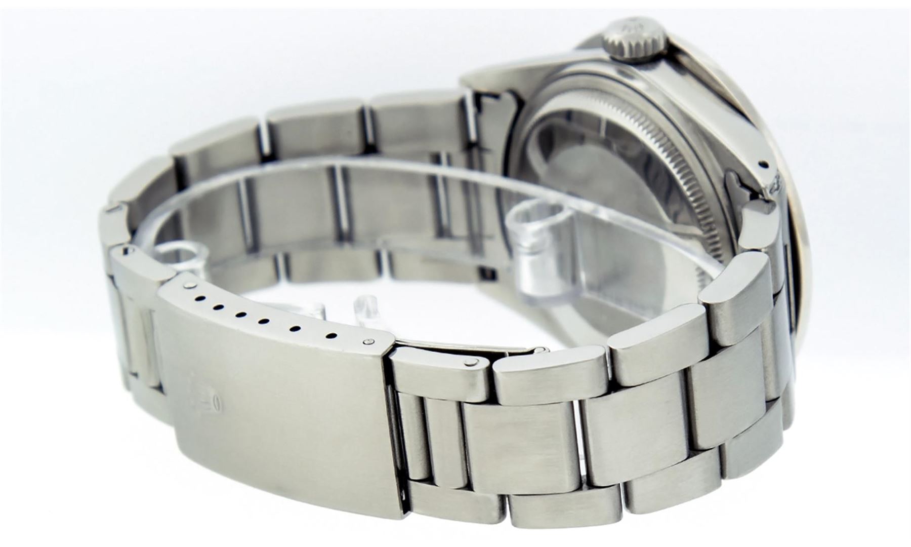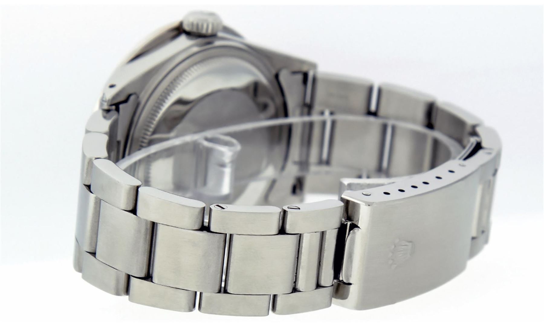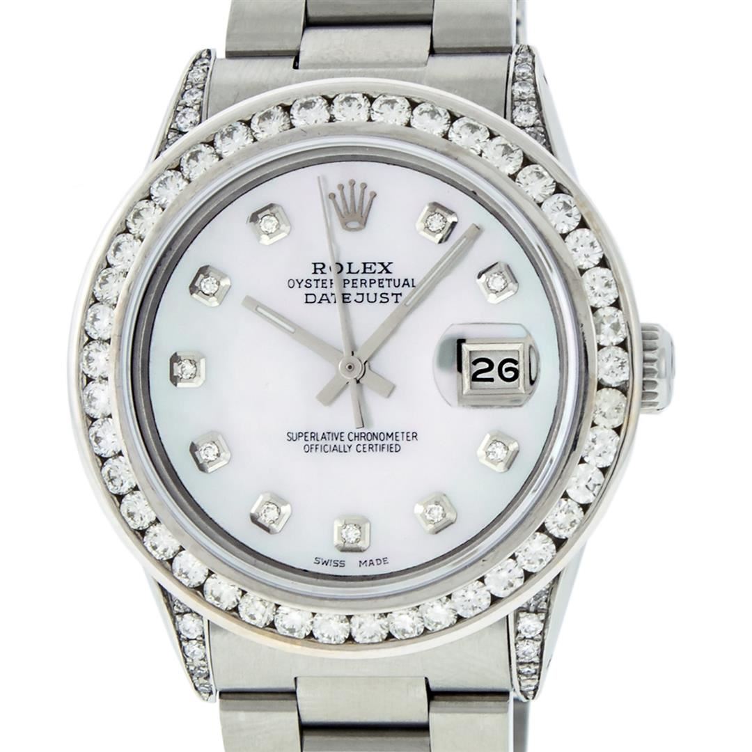 One Gents Rolex Datejust Polished Bright with Satin Finish, Serviced & Electronically Tested, Stainless Steel Case:36mm, Diamond Lugs: 24 Diamonds In Lugs, Color: G to H, Clarity: SI-VS. Stainless Steel Crown, Custom Bezel: 18K White Gold 3ct Channel Set Diamond Bezel, Diamond Count: 40 Diamonds, Total Weight 3.00 Carat, Clarity: SI-VS, Color: G to H. Custom Crystal: Synthetic Sapphire Cyclops Lens. Movement: Automatic Winding Movement Caliber 3035. Custom Dial: Mother Of Pearl Diamond Dial, Diamond Count: 10 Diamonds In Dial, Diamond Color: G To H In Color, Clarity: SI-VS. Date Window: 3 O'Clock Position Date Display, Quickset, Model: Datejust Condition: G-6 Extra Fine. Bracelet: Stainless Steel Oyster Band. Bright Polish & Satin Finish. 7.0 Inch Length, Adjustable. Standard Clasp, With Rolex Logo.