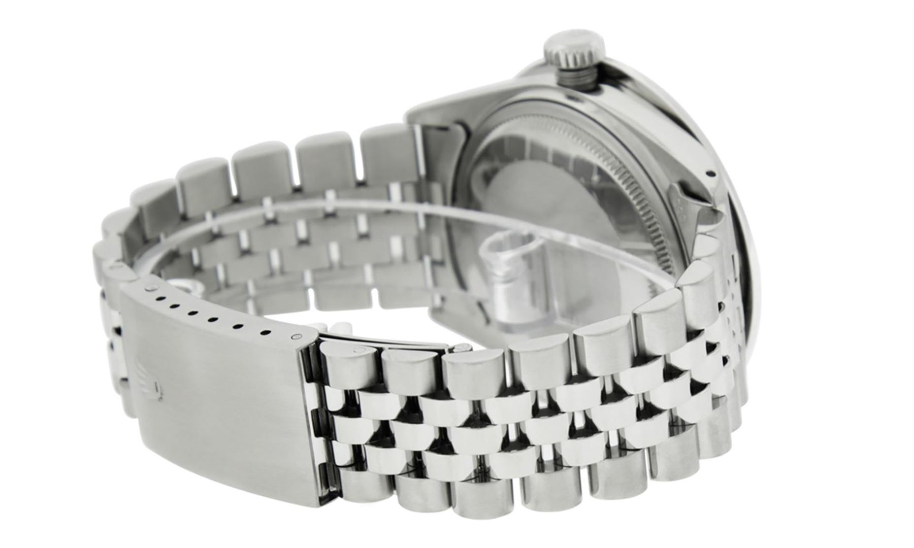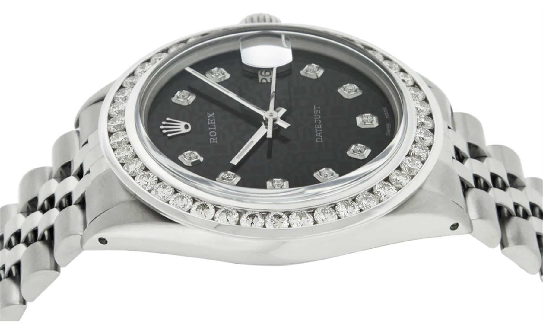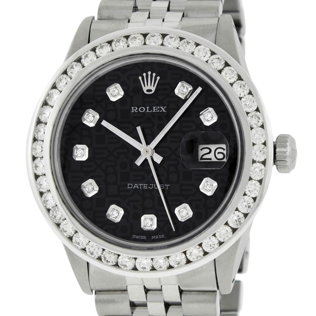 One Mens Rolex Datejust Polished Bright with Satin Finish, Serviced & Electronically Tested, Stainless Steel Case:36mm, Stainless Steel Crown, Custom Bezel: 18K White Gold 3ct Channel Set Diamond Bezel, Diamond Count: 40 Diamonds, Total Weight 3.00 Carat, Clarity: SI-VS, Color: G to H. Custom Crystal: Synthetic Sapphire Cyclops Lens. Movement: Automatic Winding Movement Caliber 3035. Custom Dial: Black Jubilee Diamond Dial, Diamond Count: 10 Diamonds In Dial, Diamond Color: G To H In Color, Clarity: SI-VS. Date Window: 3 O'Clock Position Date Display, Quickset, Model: Datejust Condition: G-6 Extra Fine. Bracelet: Stainless Steel Jubilee Band. Bright Polish & Satin Finish. 7.0 Inch Length, Adjustable. Standard Clasp, With Rolex Logo. This Watch Has Been Serviced and Polished And It Is Free Of All Dents And Scratches And Has Been Time Tested.