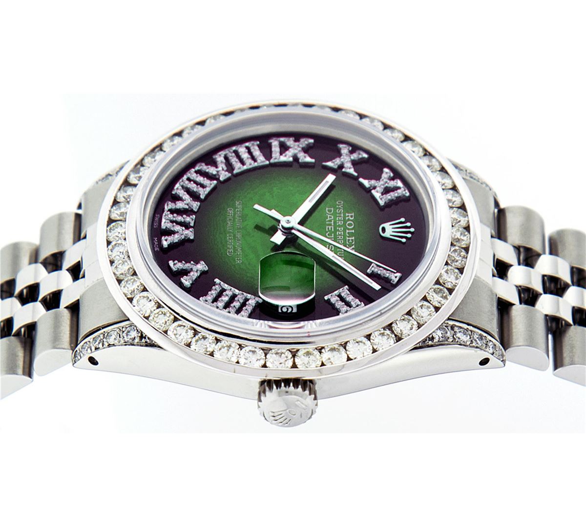 One Mens Rolex Datejust Polished Bright with Satin Finish, Serviced & Electronically Tested, Stainless Steel Case:36mm, Diamond Lugs: 24 Diamonds In Lugs, Color: G to H, Clarity: SI-VS. Stainless Steel Crown, Custom Bezel: 18K White Gold Channel Set Diamond Bezel, Diamond Count: 40 Diamonds, Total Weight 3.00 Carat, Clarity: SI-VS, Color: G to H. Custom Crystal: Synthetic Sapphire Cyclops Lens. Movement: Automatic Winding Movement Caliber 3035. Custom Dial: Green Vignette Roman Diamond Dial, Diamond Color: G To H In Color, Clarity: SI-VS. Date Window: 3 O'Clock Position Date Display, Quickset, Model: Datejust Condition: G-6 Extra Fine. Bracelet: Stainless Steel Jubilee. Bright Polish & Satin Finish. 7.0 Inch Length, Adjustable. Standard Clasp, With Rolex Logo.