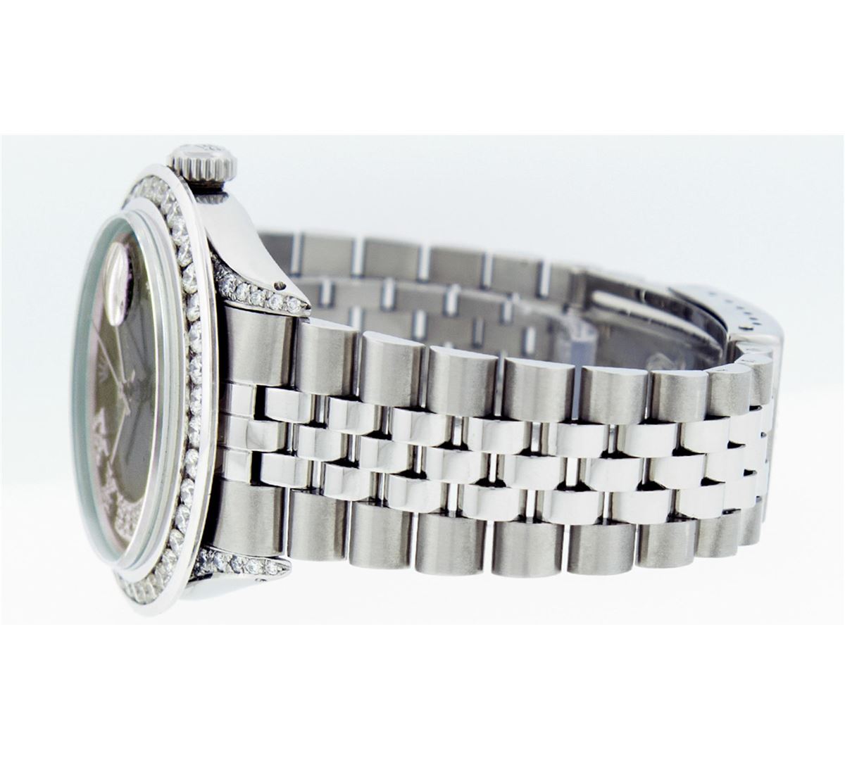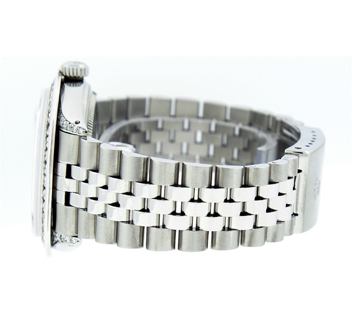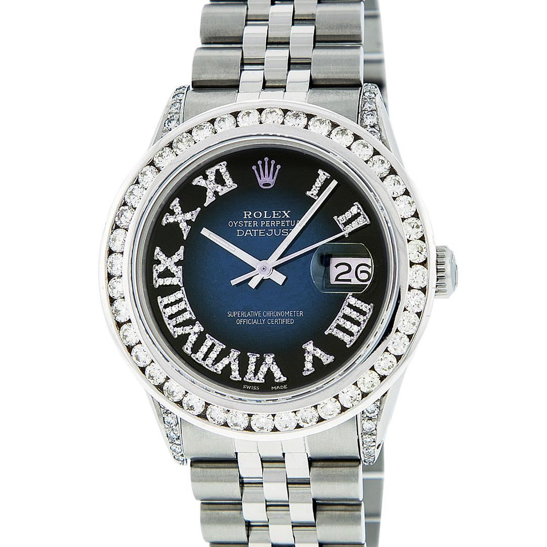 One Mens Rolex Datejust Polished Bright with Satin Finish, Serviced & Electronically Tested, Stainless Steel Case:36mm, Diamond Lugs: 24 Diamonds In Lugs, Color: G to H, Clarity: SI-VS. Stainless Steel Crown, Custom Bezel: 18K White Gold Channel Set Diamond Bezel, Diamond Count: 40 Diamonds, Total Weight 3.00 Carat, Clarity: SI-VS, Color: G to H. Custom Crystal: Synthetic Sapphire Cyclops Lens. Movement: Automatic Winding Movement Caliber 3035. Custom Dial: Blue Vignette Diamond Roman Dial, Diamond Color: G To H In Color, Clarity: SI-VS. Date Window: 3 O'Clock Position Date Display, Quickset, Model: Datejust Condition: G-6 Extra Fine. Bracelet: Stainless Steel Jubilee. Bright Polish & Satin Finish. 7.0 Inch Length, Adjustable. Standard Clasp, With Rolex Logo.