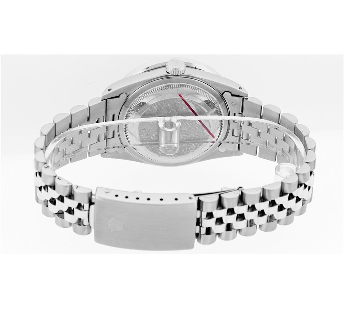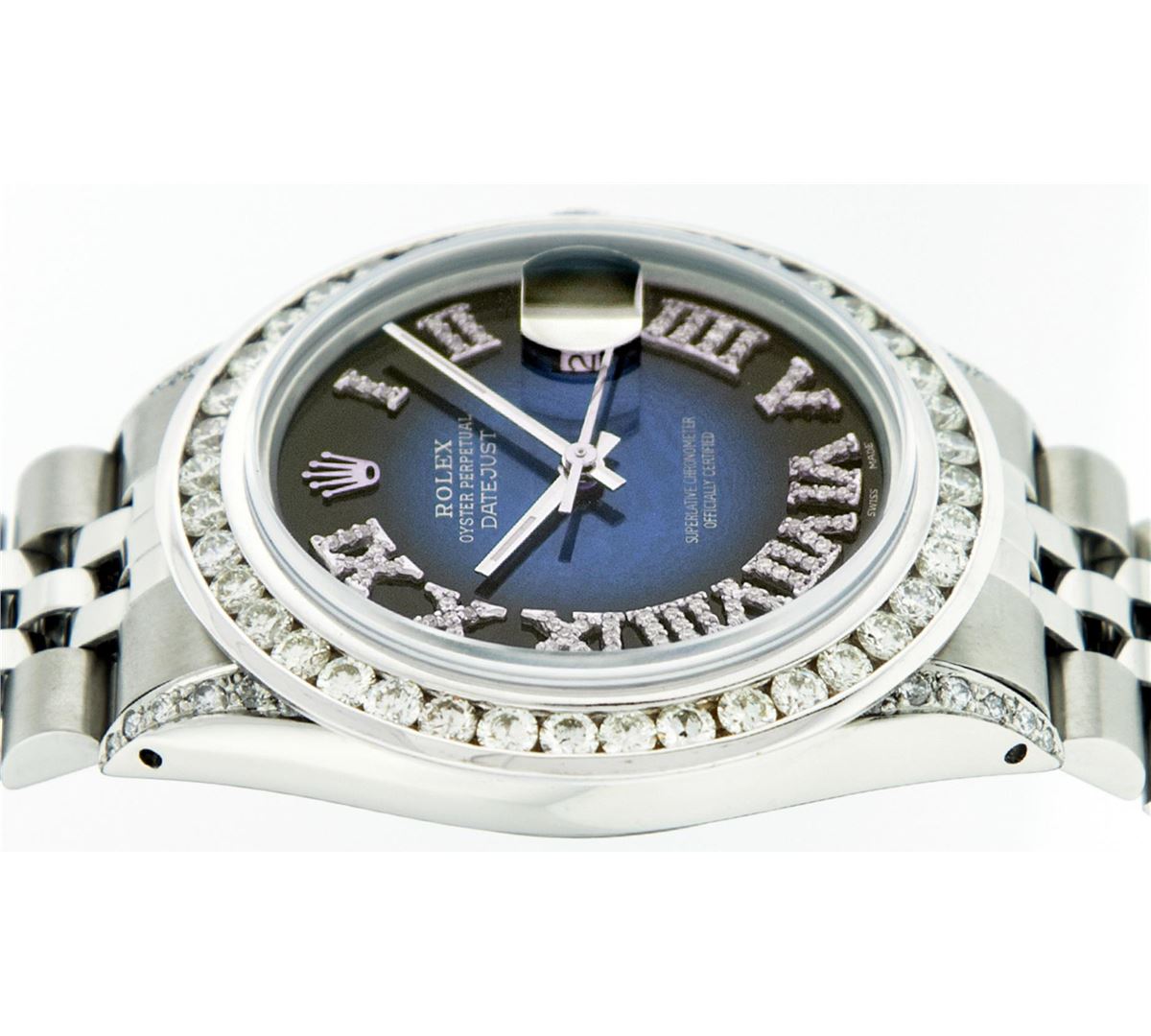 One Mens Rolex Datejust Polished Bright with Satin Finish, Serviced & Electronically Tested, Stainless Steel Case:36mm, Diamond Lugs: 24 Diamonds In Lugs, Color: G to H, Clarity: SI-VS. Stainless Steel Crown, Custom Bezel: 18K White Gold Channel Set Diamond Bezel, Diamond Count: 40 Diamonds, Total Weight 3.00 Carat, Clarity: SI-VS, Color: G to H. Custom Crystal: Synthetic Sapphire Cyclops Lens. Movement: Automatic Winding Movement Caliber 3035. Custom Dial: Blue Vignette Diamond Roman Dial, Diamond Color: G To H In Color, Clarity: SI-VS. Date Window: 3 O'Clock Position Date Display, Quickset, Model: Datejust Condition: G-6 Extra Fine. Bracelet: Stainless Steel Jubilee. Bright Polish & Satin Finish. 7.0 Inch Length, Adjustable. Standard Clasp, With Rolex Logo.
