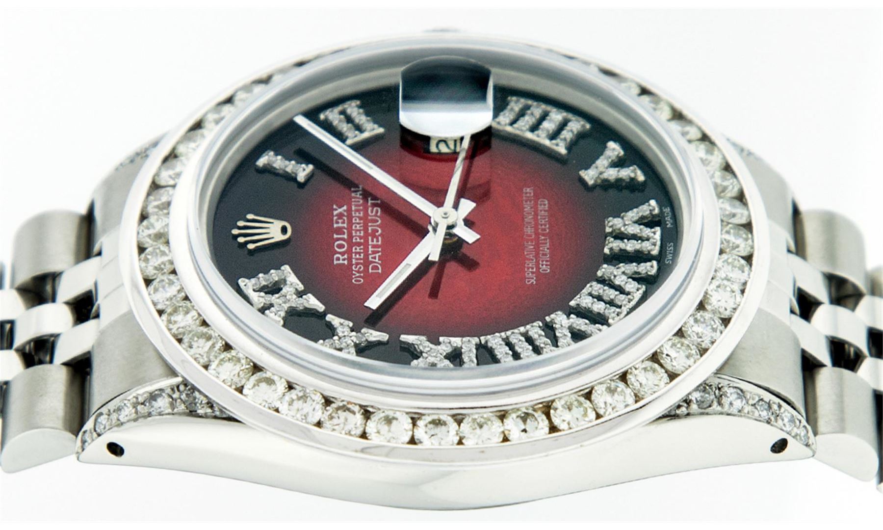 One Mens Rolex Datejust Polished Bright with Satin Finish, Serviced & Electronically Tested, Stainless Steel Case:36mm, Diamond Lugs: 24 Diamonds In Lugs, Color: G to H, Clarity: SI-VS. Stainless Steel Crown, Custom Bezel: 18K White Gold Channel Set Diamond Bezel, Diamond Count: 40 Diamonds, Total Weight 3.00 Carat, Clarity: SI-VS, Color: G to H. Custom Crystal: Synthetic Sapphire Cyclops Lens. Movement: Automatic Winding Movement Caliber 3035. Custom Dial: Red Vignette Roman Diamond Dial, Diamond Color: G To H In Color, Clarity: SI-VS. Date Window: 3 O'Clock Position Date Display, Quickset, Model: Datejust Condition: G-6 Extra Fine. Bracelet: Stainless Steel Jubilee. Bright Polish & Satin Finish. 7.0 Inch Length, Adjustable. Standard Clasp, With Rolex Logo.