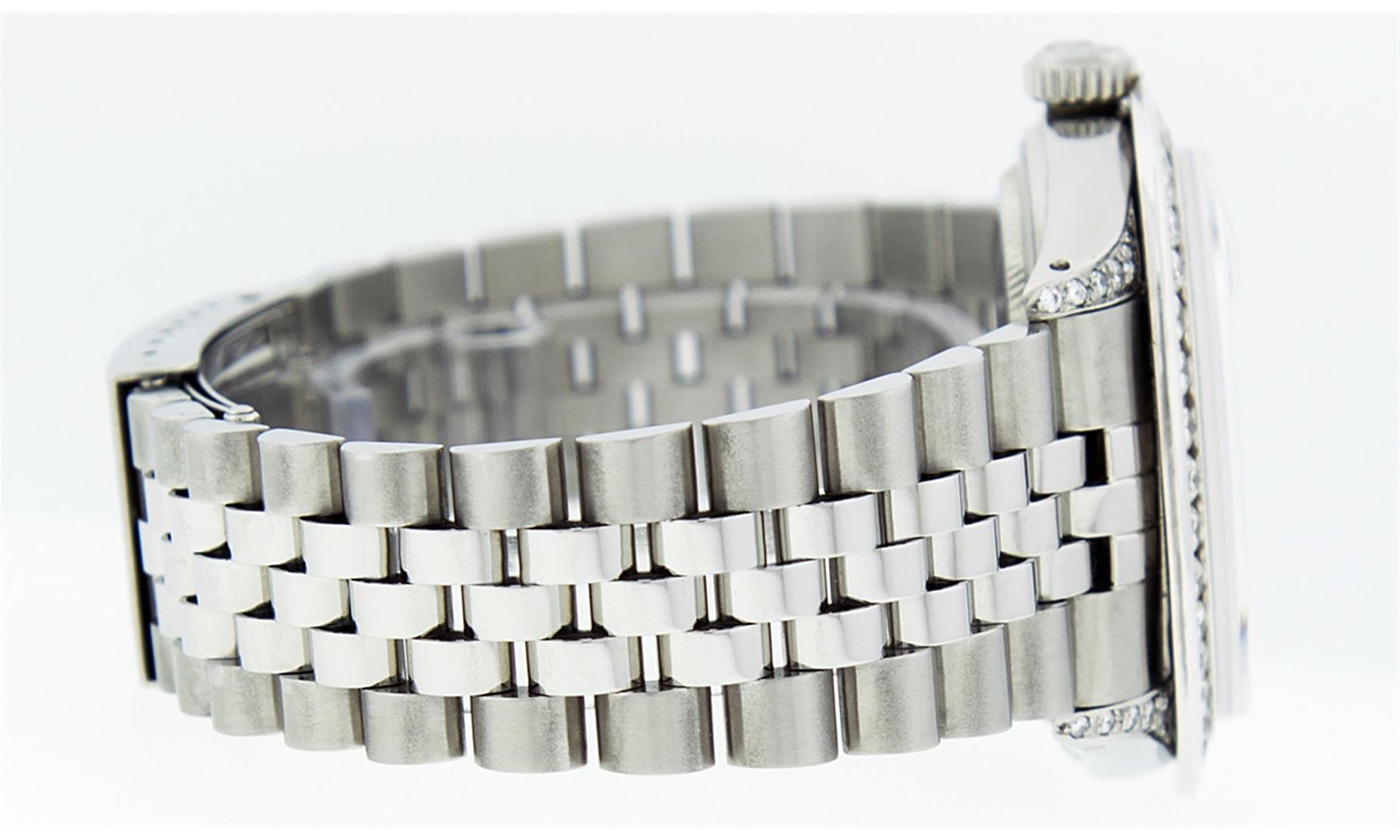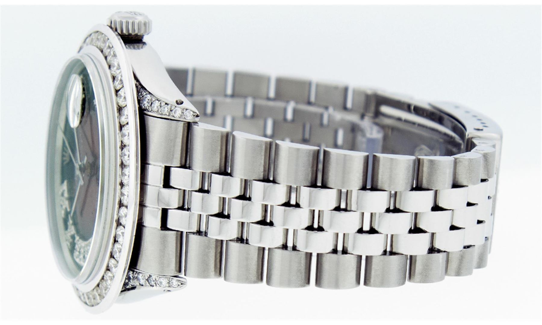 One Mens Rolex Datejust Polished Bright with Satin Finish, Serviced & Electronically Tested, Stainless Steel Case:36mm, Diamond Lugs: 24 Diamonds In Lugs, Color: G to H, Clarity: SI-VS. Stainless Steel Crown, Custom Bezel: 18K White Gold Channel Set Diamond Bezel, Diamond Count: 40 Diamonds, Total Weight 3.00 Carat, Clarity: SI-VS, Color: G to H. Custom Crystal: Synthetic Sapphire Cyclops Lens. Movement: Automatic Winding Movement Caliber 3035. Custom Dial: Red Vignette Roman Diamond Dial, Diamond Color: G To H In Color, Clarity: SI-VS. Date Window: 3 O'Clock Position Date Display, Quickset, Model: Datejust Condition: G-6 Extra Fine. Bracelet: Stainless Steel Jubilee. Bright Polish & Satin Finish. 7.0 Inch Length, Adjustable. Standard Clasp, With Rolex Logo.