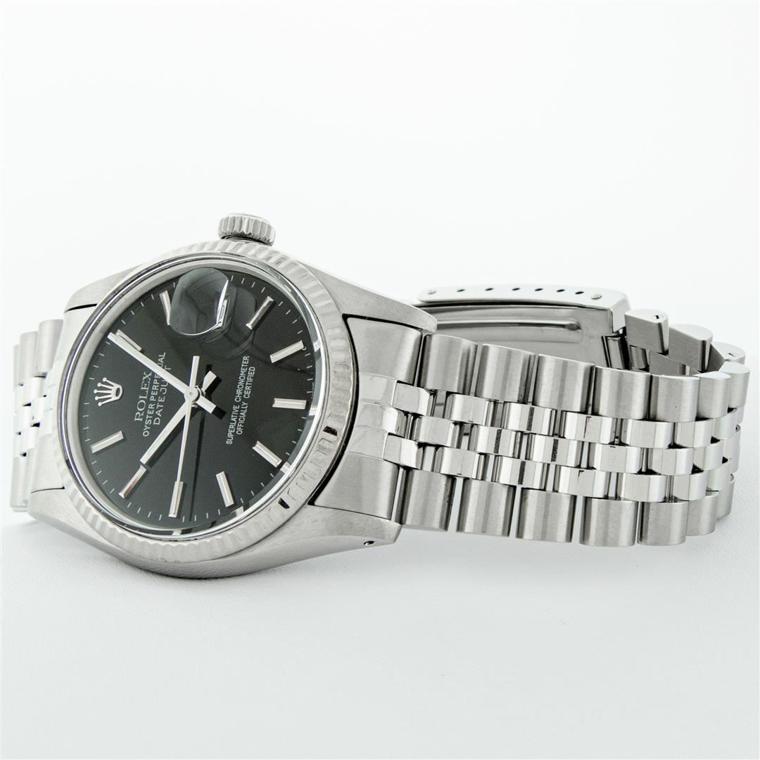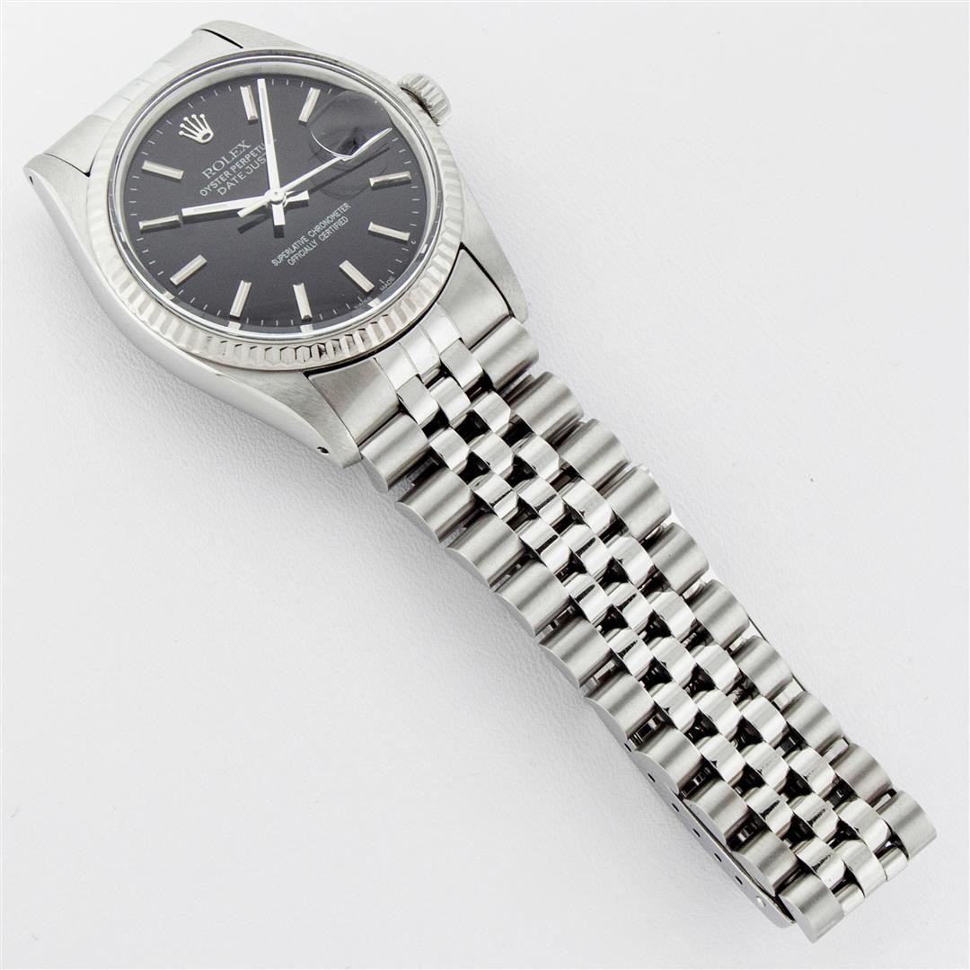 One Men's Stainless Steel Rolex Datejust Polished, Serviced & Electronically Tested, Stainless Steel Case: 36mm, Stainless Steel Crown, Bezel: 14K White Gold Fluted Bezel. Custom Crystal: New Acrylic Cyclops Lens. Custom Hands: New Luminescent Hands. Movement: Automatic Winding Movement Caliber 3035. Custom Dial: Black Index With Dash Track. Date Window: 3 O'Clock Position Date Display, Quickset, Model: Datejust, Condition: G-6 Extra Fine. Bracelet: Stainless Steel Jubilee Band Band. Bright Polish & Satin Finish. 7.0 Inch Length, Adjustable. Standard Clasp, With Rolex Logo. This Watch Has Been Serviced Time Tested And Is In Excellent Condition It Is Free Of All Scratches And Dents.