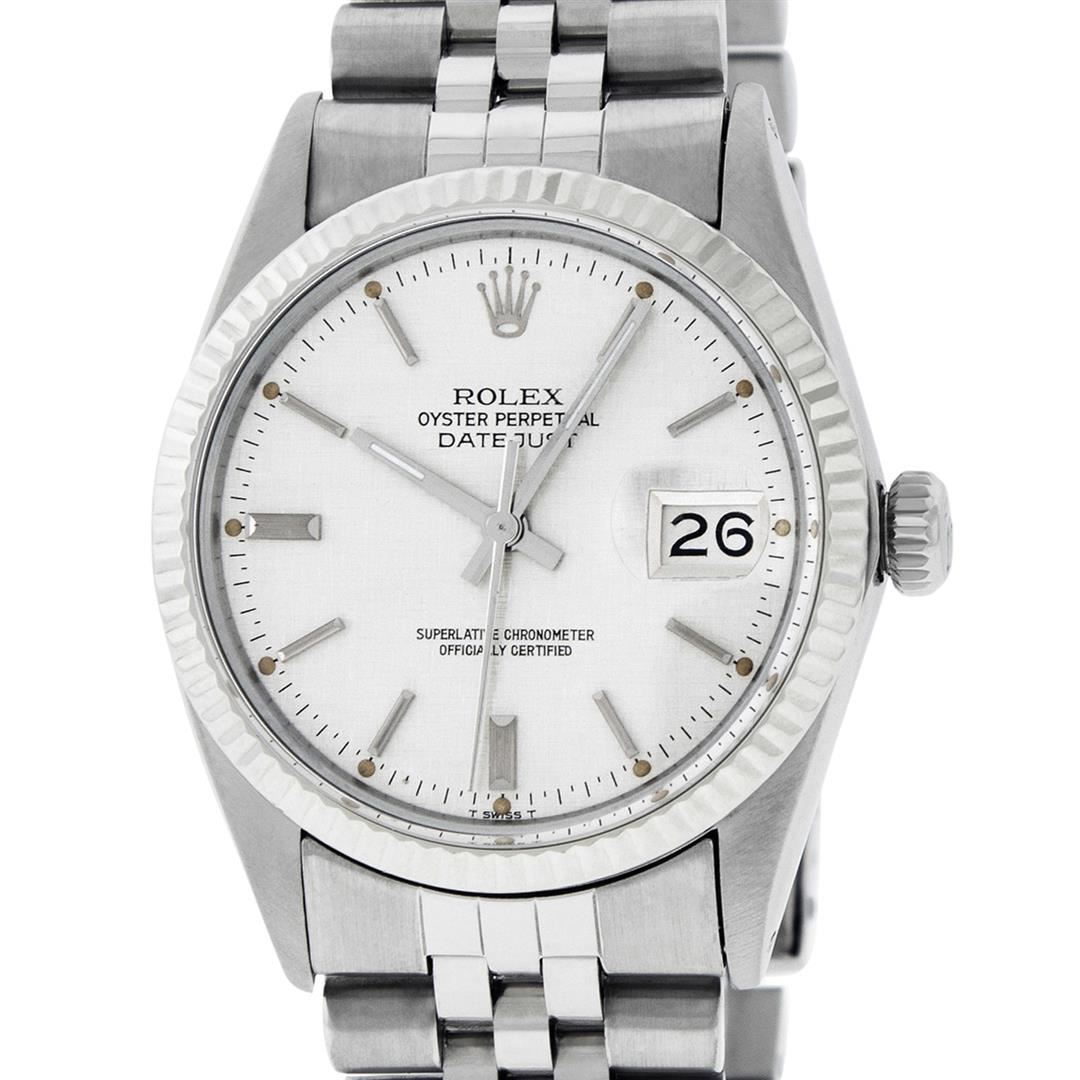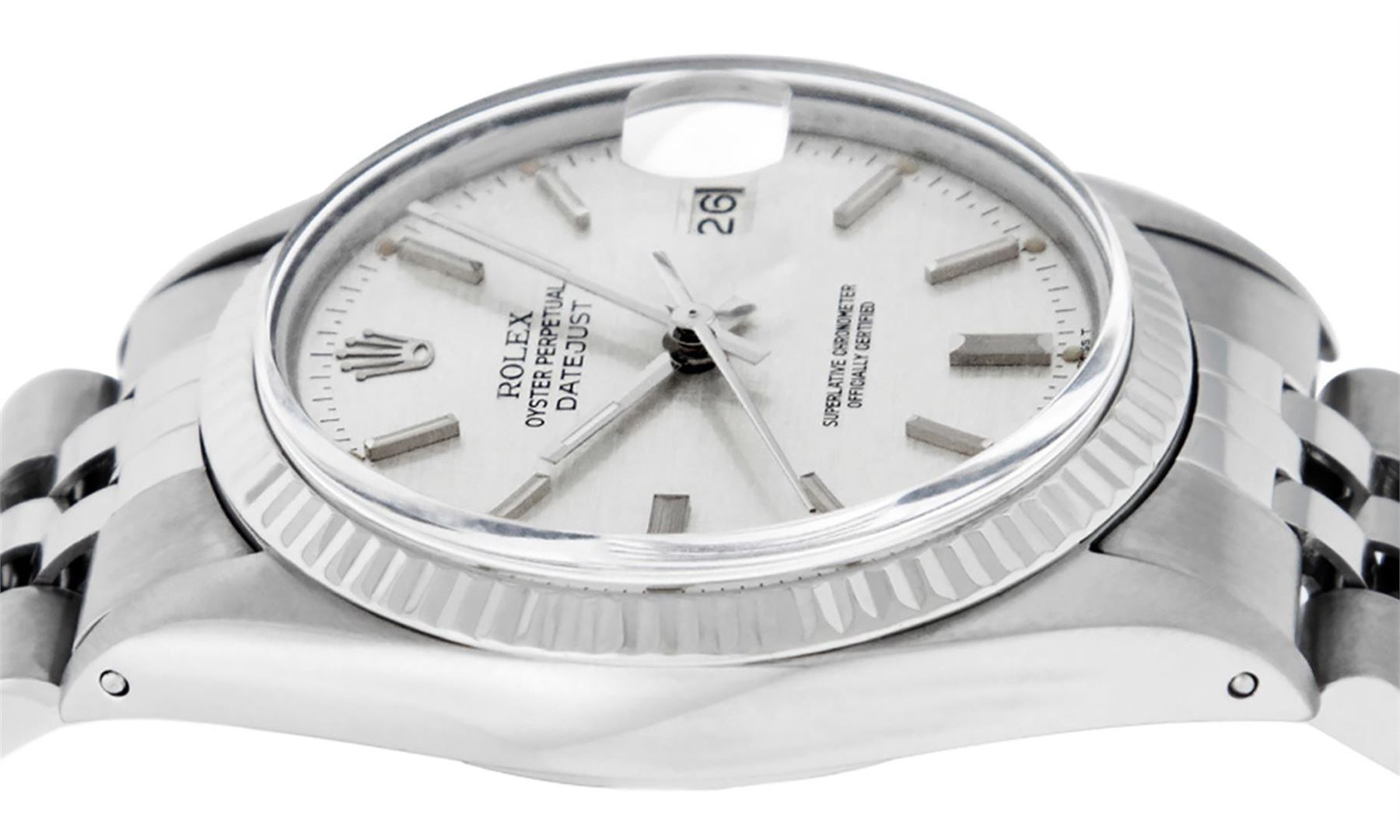 One Men's Stainless Steel Rolex Datejust Polished, Serviced & Electronically Tested, Stainless Steel Case: 36mm, Stainless Steel Crown, Bezel: 14K White Gold Fluted Bezel. Custom Crystal: New Acrylic Cyclops Lens. Custom Hands: New Luminescent Hands. Movement: Automatic Winding Movement Caliber 3035. Dial: Silver Index With Dash Track & Lumi Dot. Date Window: 3 O'Clock Position Date Display, Quickset, Model: Datejust, Condition: G-6 Extra Fine. Bracelet: Stainless Steel Jubilee Band. Bright Polish & Satin Finish. 7.0 Inch Length, Adjustable. Standard Clasp, With Rolex Logo. This Watch Has Been Serviced Time Tested And Is In Excellent Condition It Is Free Of All Scratches And Dents.