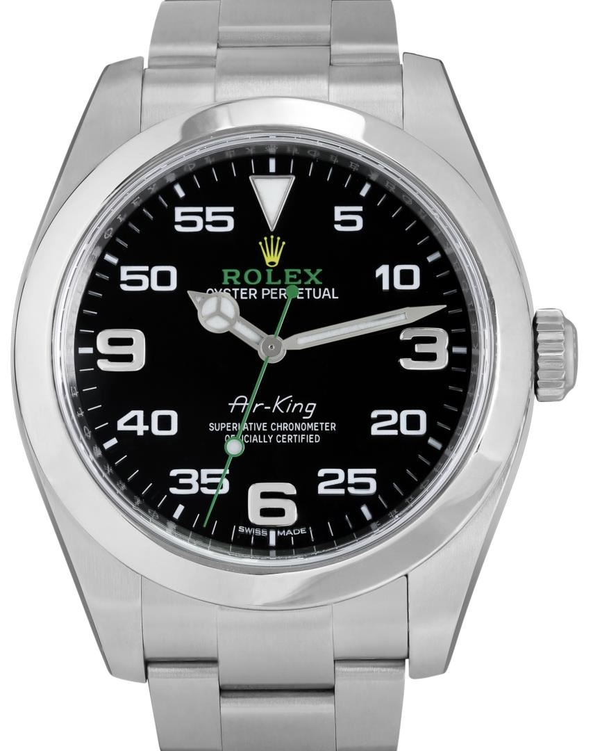 One Mens Pre Owned Stainless Steel Rolex Air King Polished, Serviced & Electronically Tested, Rolex Stainless Steel Case: 40mm, Rolex Stainless Steel Crown, Rolex Bezel: Stainless Steel Smooth Bezel. Rolex Crystal: Sapphire Crystal. Rolex Movement: Automatic Winding Movement Caliber 3131. Rolex Dial: Black Air King Dial with Arabic Hour Markers with Luminous 12 O' clock marker, and Dash Track. Rolex Hands: Luminous Air King Hands. Model: Stainless Steel Air King, Condition: G-6 Extra Fine. Rolex Bracelet: Stainless Steel Oyster Band. Bright Polish & Satin Finish. 7.0 Inch Length, Adjustable. Standard Rolex Clasp, With Rolex Logo. This Watch Comes With A Rolex Box.