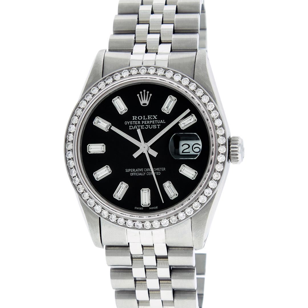 One Mens Rolex Stainless Steel Datejust Polished Bright with Satin Finish, This Watch Has Been Serviced & Electronically Tested, Stainless Steel Case: 36mm, Stainless Steel Crown, Custom Bezel:�New Stainless Steel�Beadset Diamond Bezel, Diamond Count:�54 Diamonds In Bezel, Total Weight 1.00 Carat, Clarity: SI-VS, Color: G to H. Custom Crystal: New Scratch Resistant Synthetic Sapphire Cyclops Lens. Custom Hands: New Luminescent Hands. Movement: Automatic Winding Movement Caliber 3035. Custom Dial: Black Baguette Diamond Dial, Diamond Count: 10 Baguette Diamonds On Dial, Color: G to H, Clarity: VS2-SI1. Date Window: 3 O'Clock Position Date Display, Quickset, Model: Datejust. Condition: G-6 Extra Fine. Bracelet: Stainless Steel Jubilee Band. Bright Polish & Satin Finish.�7.0 Inch Length, Adjustable. Standard Clasp, With Rolex Logo. This Watch Has Been Serviced Time Tested And Is In Excellent Condition It Is Free Of All Scratches And Dents.