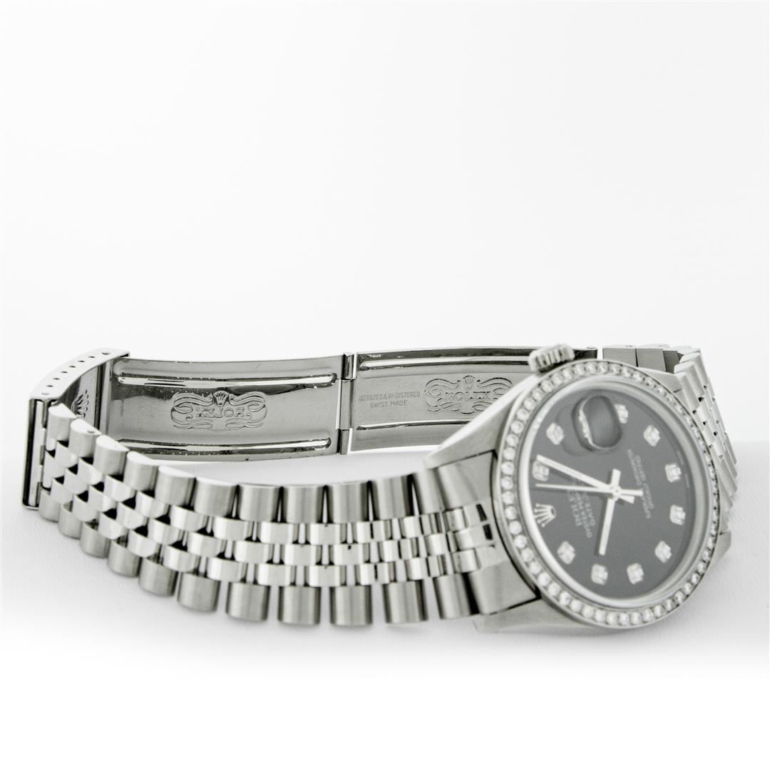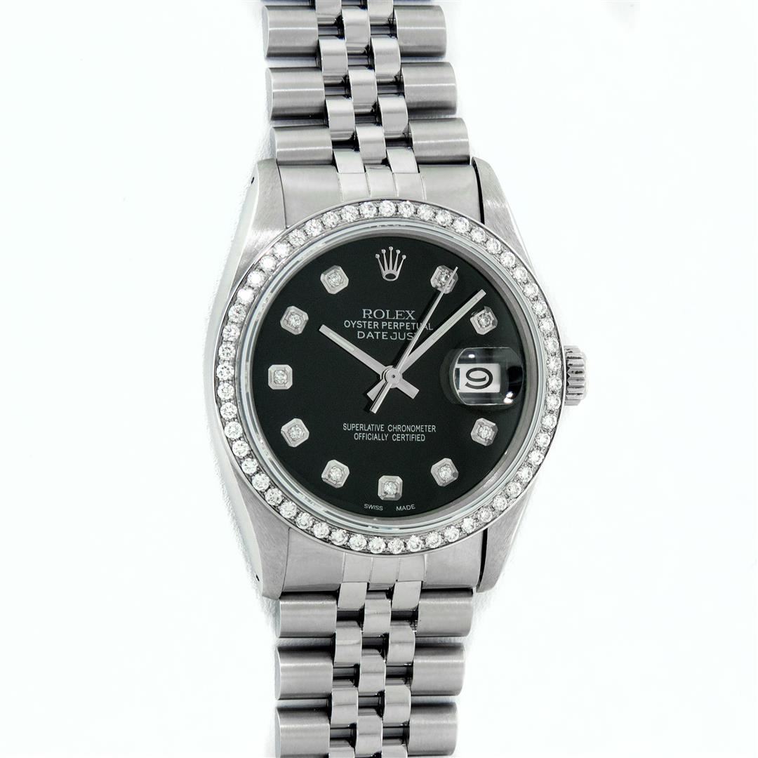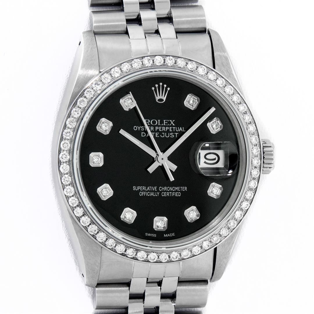 One Men's Rolex Stainless Steel Datejust Polished Bright with Satin Finish, This Watch Has Been Serviced & Electronically Tested, Stainless Steel Case: 36mm, Stainless Steel Crown, Custom Bezel:�New Stainless Steel�Beadset Diamond Bezel, Diamond Count:�54 Diamonds On Bezel, Total Weight 1.00 Carat, Clarity: SI-VS, Color: G to H. Custom Crystal: New Scratch Resistant Synthetic Sapphire Cyclops Lens. Custom Hands: New Luminescent Hands. Movement: Automatic Winding Movement Caliber 3035. Custom Dial: Black Diamond Dial, Diamond Count: 10 Diamonds On Dial, Color: G to H, Clarity: VS2-SI1. Date Window: 3 O'Clock Position Date Display, Quickset, Model: Datejust. Condition: G-6 Extra Fine. Bracelet: Stainless Steel Jubilee Band. Bright Polish & Satin Finish.�7.0 Inch Length, Adjustable. Standard Clasp, With Rolex Logo. This Watch Has Been Serviced Time Tested And Is In Excellent Condition It Is Free Of All Scratches And Dents.