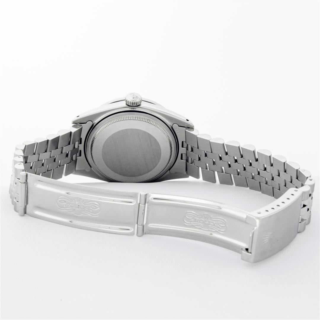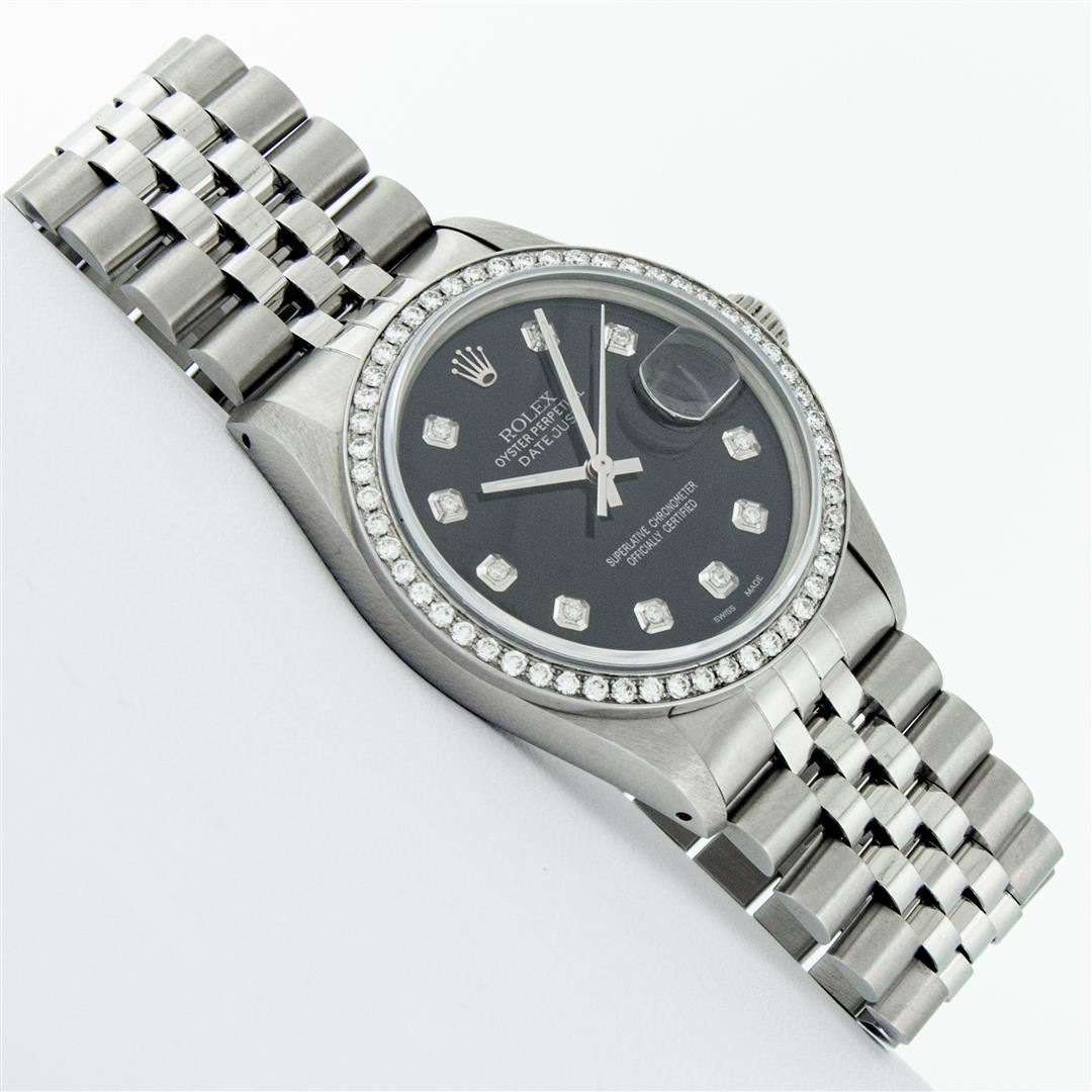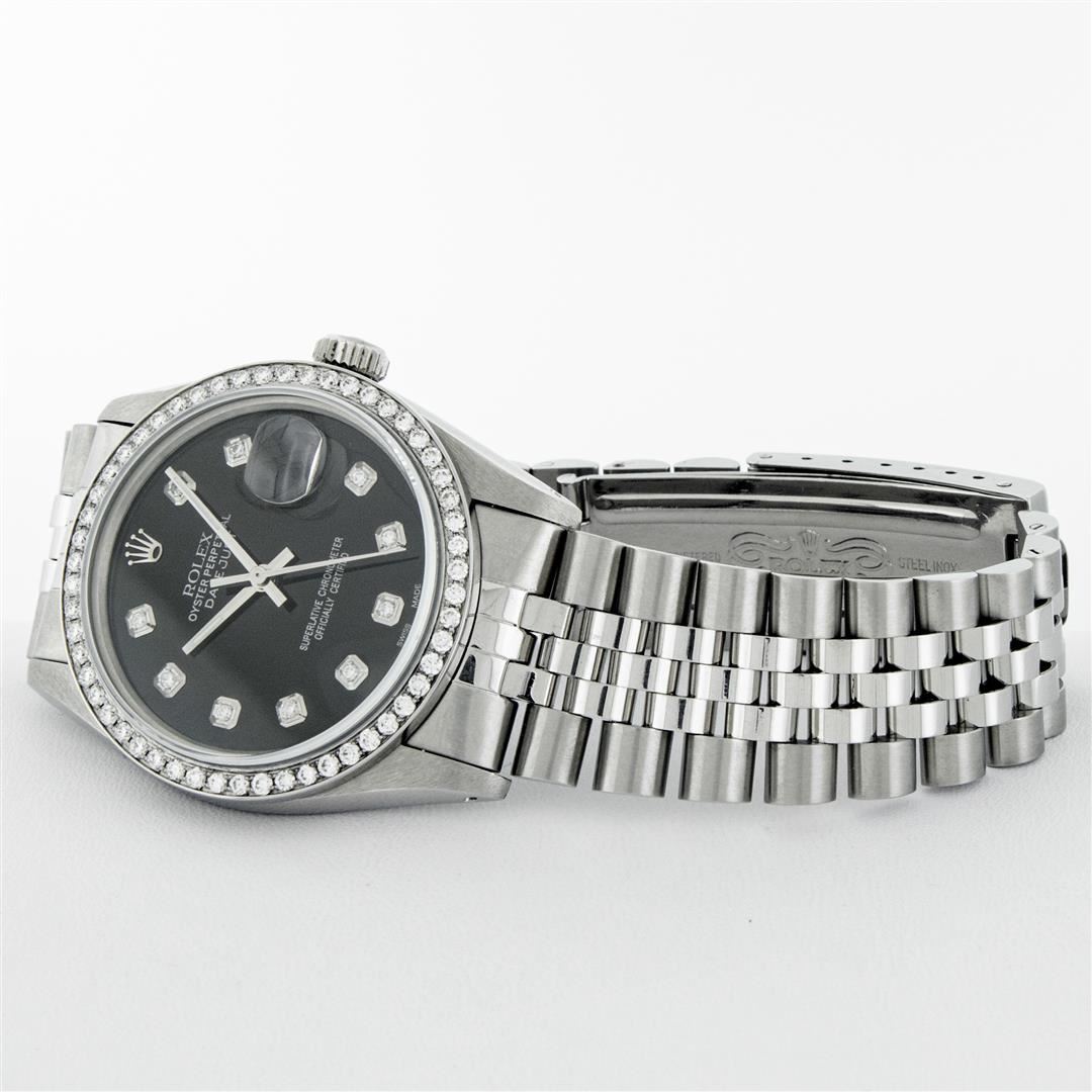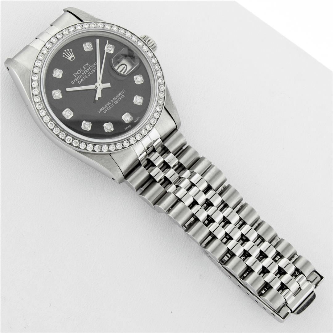 One Men's Rolex Stainless Steel Datejust Polished Bright with Satin Finish, This Watch Has Been Serviced & Electronically Tested, Stainless Steel Case: 36mm, Stainless Steel Crown, Custom Bezel:�New Stainless Steel�Beadset Diamond Bezel, Diamond Count:�54 Diamonds On Bezel, Total Weight 1.00 Carat, Clarity: SI-VS, Color: G to H. Custom Crystal: New Scratch Resistant Synthetic Sapphire Cyclops Lens. Custom Hands: New Luminescent Hands. Movement: Automatic Winding Movement Caliber 3035. Custom Dial: Black Diamond Dial, Diamond Count: 10 Diamonds On Dial, Color: G to H, Clarity: VS2-SI1. Date Window: 3 O'Clock Position Date Display, Quickset, Model: Datejust. Condition: G-6 Extra Fine. Bracelet: Stainless Steel Jubilee Band. Bright Polish & Satin Finish.�7.0 Inch Length, Adjustable. Standard Clasp, With Rolex Logo. This Watch Has Been Serviced Time Tested And Is In Excellent Condition It Is Free Of All Scratches And Dents.
