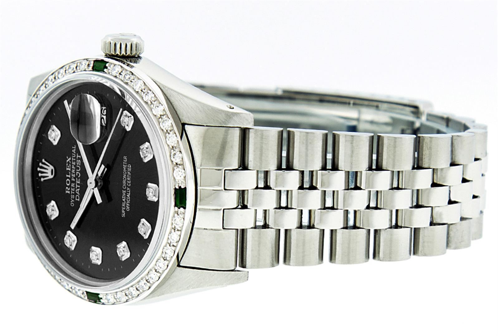 One Mens Rolex Datejust Polished Bright with Satin Finish, Serviced & Electronically Tested, Stainless Steel Case:36mm, Stainless Steel Crown, Custom Bezel: 18K White Gold Emerald Beadset Diamond Bezel, Diamond + Gem Count: 36 Diamonds + 4 Emeralds. Total Weight 1.00 Carat, Clarity: Si-VS, Color: G to H. Custom Crystal: Synthetic Sapphire Cyclops Lens. Movement: Automatic Winding Movement Caliber 3035. Custom Dial: Black Diamond Dial With Line Track, 10 Diamond in Dial G To H In Color, Si-VS Clarity. Date Window: 3 O'Clock Position Date Display, Quickset, Model:Datejust. Condition: G-6 Extra Fine. Bracelet:Stainless Steel Jubilee. Bright Polish & Satin Finish. 7.0 Inch Length, Adjustable. Standard Clasp, With Rolex Logo.