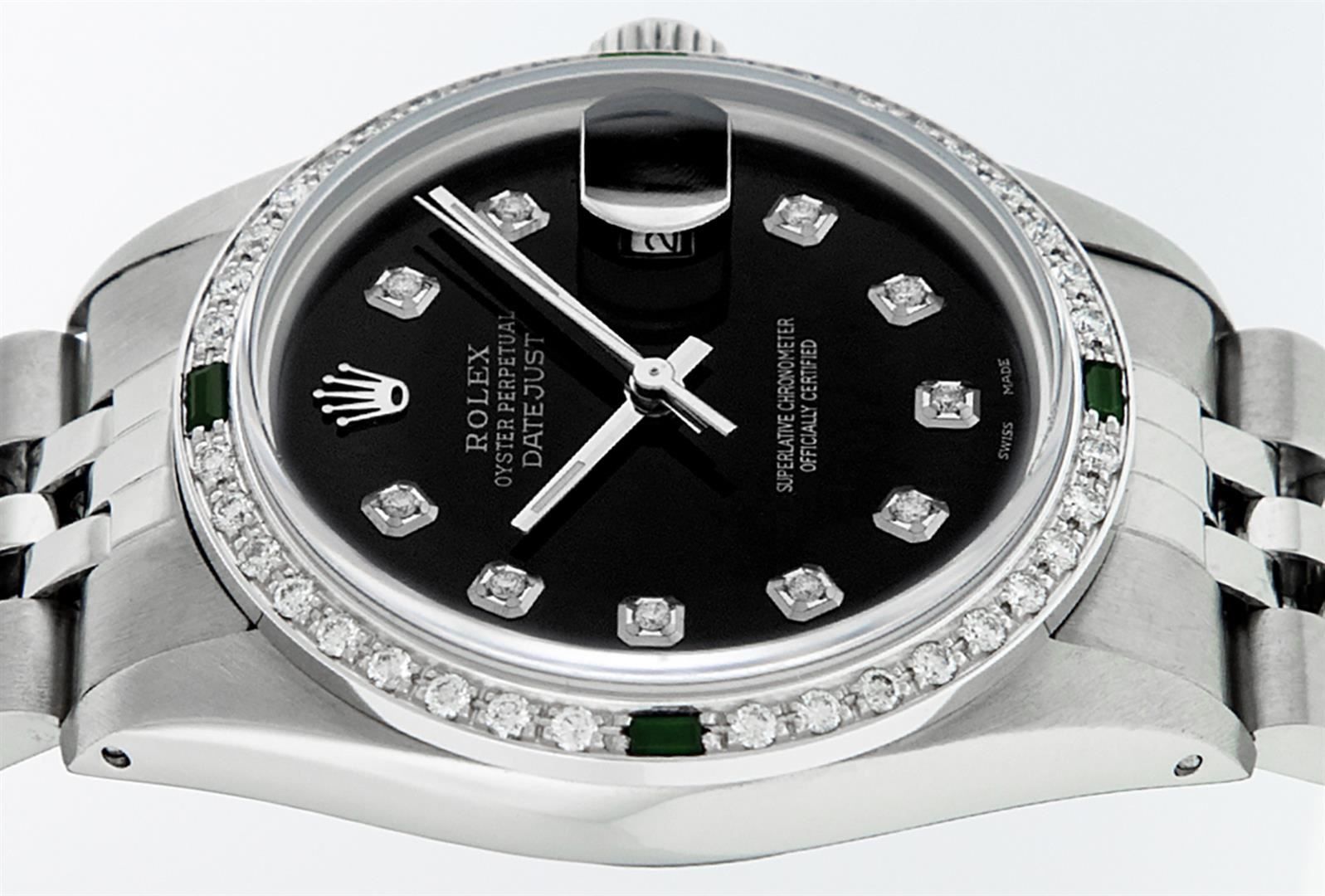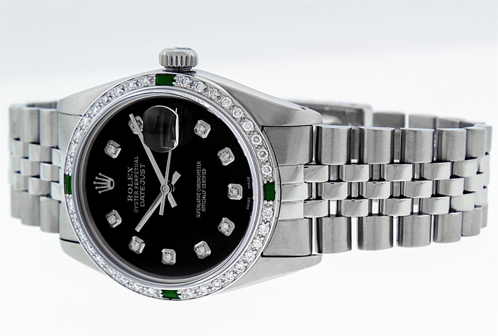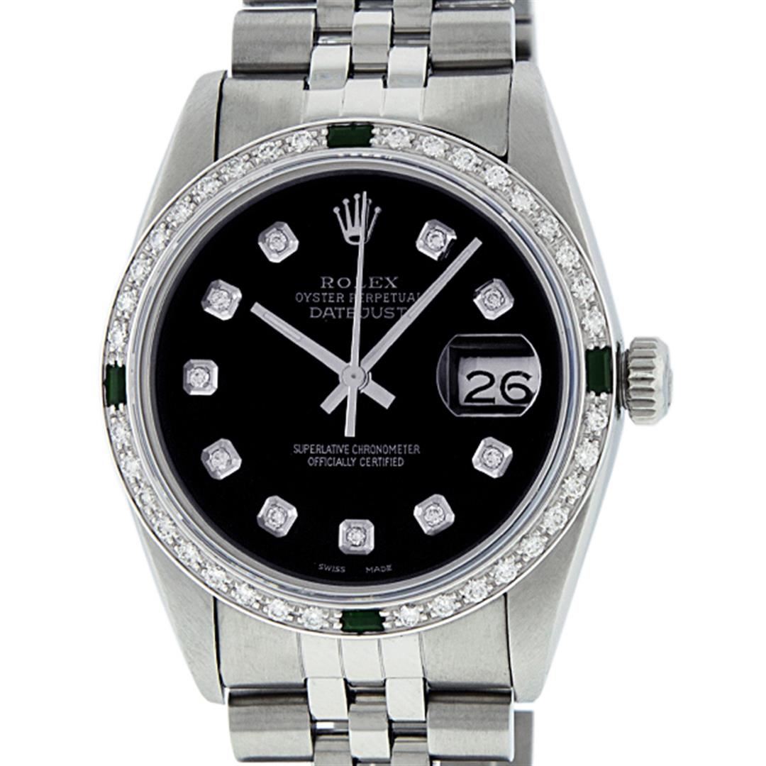 One Mens Stainless Steel Rolex Datejust Polished, Serviced & Electronically Tested, Stainless Steel Case: 36mm, Stainless Steel Crown, Custom Bezel: New 18K White Gold Emerald Beadset Diamond Bezel, Diamond + Gem Count: 36 Diamonds + 4 Emeralds, Total Weight 1.00 Carat, Clarity: SI-VS, Color: G to H. Custom Crystal: New Scratch Resistant Synthetic Sapphire Cyclops Lens. Custom Hands: New Luminescent Hands. Movement: Automatic Winding Movement Caliber 3035. Custom Dial: Black Diamond Dial, 10 Diamonds in Dial, G To H In Color, Clarity: SI-VS. Date Window: 3 O'Clock Position Date Display, Quickset, Model: Datejust. Condition: G-6 Extra Fine. Bracelet: Stainless Steel Jubilee Band. Bright Polish & Satin Finish. 7.0 Inch Length, Adjustable. Standard Clasp, With Rolex Logo. This Watch Has Been Serviced Time Tested And Is In Excellent Condition It Is Free Of All Scratches And Dents.