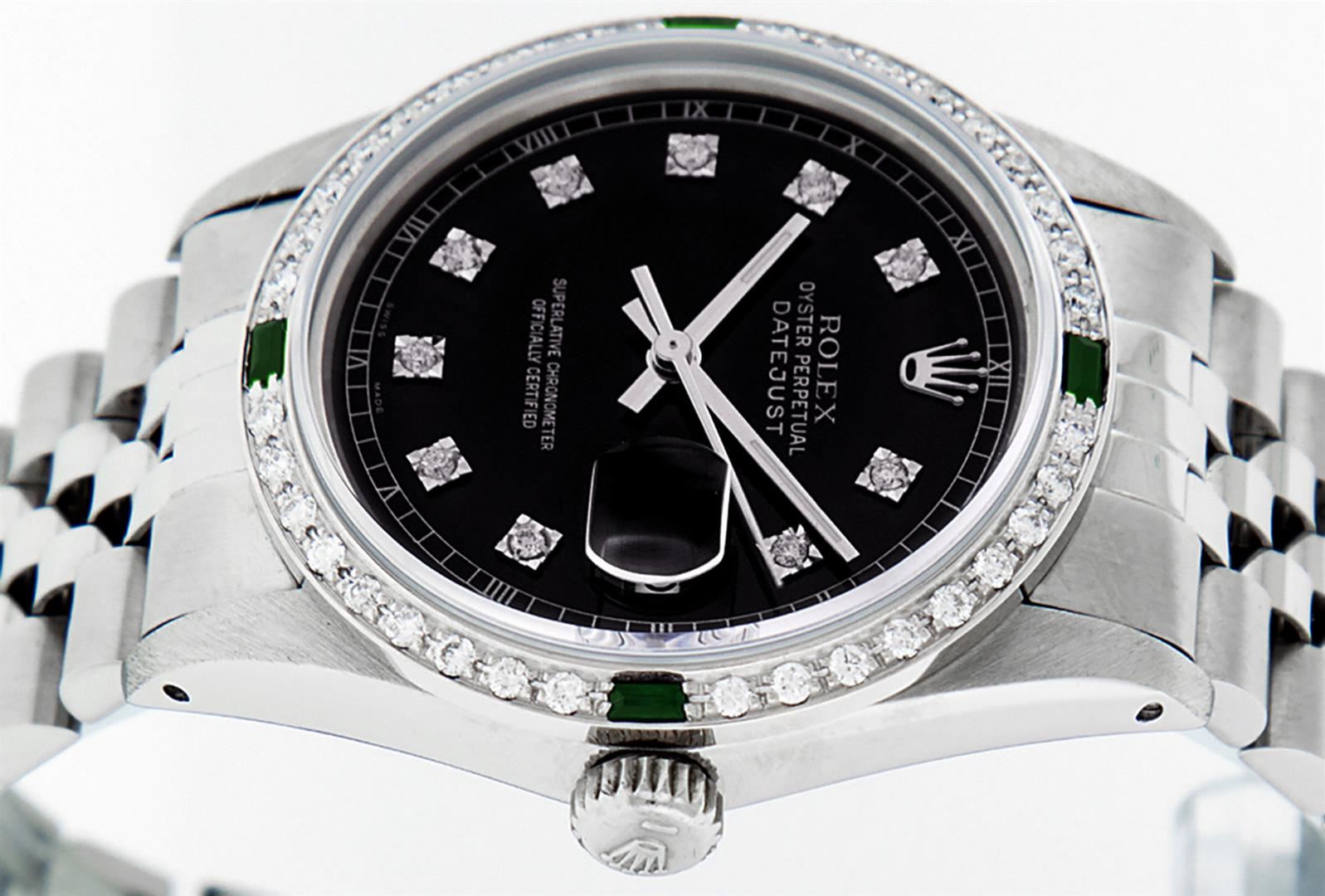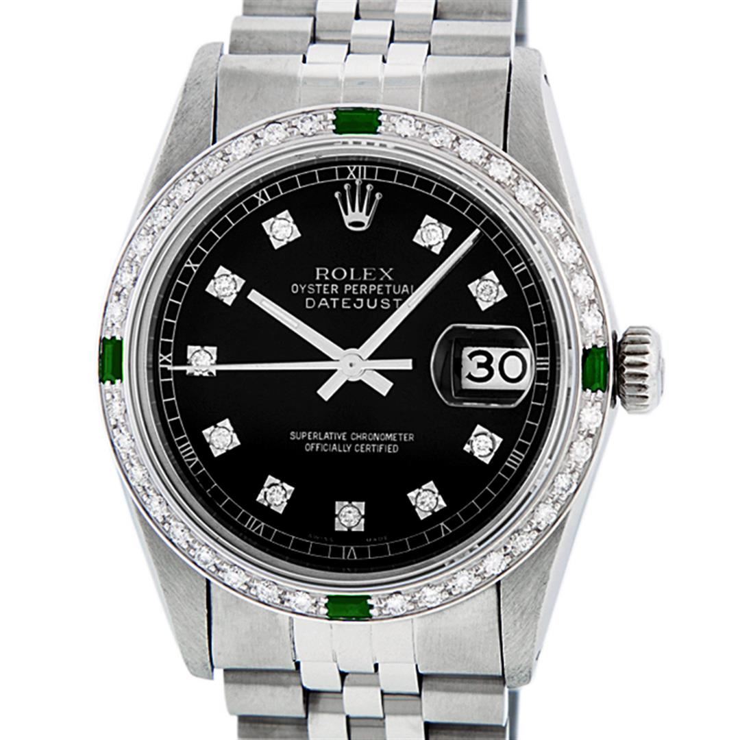 One Mens Stainless Steel Rolex Datejust Polished, Serviced & Electronically Tested, Stainless Steel Case: 36mm, Stainless Steel Crown, Custom Bezel: New 18K White Gold Emerald Beadset Diamond Bezel, Diamond + Gem Count: 36 Diamonds + 4 Emeralds, Total Weight 1.00 Carat, Clarity: SI-VS, Color: G to H. Custom Crystal: New Scratch Resistant Synthetic Sapphire Cyclops Lens. Custom Hands: New Luminescent Hands. Movement: Automatic Winding Movement Caliber 3035. Custom Dial: Black Diamond Dial With Roman Track, 10 Diamonds in Dial, G To H In Color, Clarity: SI-VS. Date Window: 3 O'Clock Position Date Display, Quickset, Model: Datejust. Condition: G-6 Extra Fine. Bracelet: Stainless Steel Jubilee Band. Bright Polish & Satin Finish. 7.0 Inch Length, Adjustable. Standard Clasp, With Rolex Logo. This Watch Has Been Serviced Time Tested And Is In Excellent Condition It Is Free Of All Scratches And Dents.
