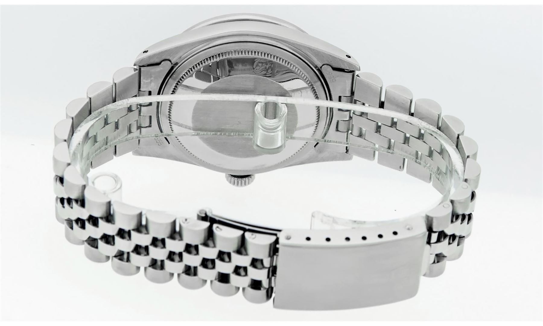 One Mens Rolex Datejust Polished Bright with Satin Finish, Serviced & Electronically Tested, Stainless Steel Case: 36mm, Custom Diamond Lugs: 28 Diamonds In Lugs, Color: G to H, Clarity: SI-VS. Stainless Steel Crown, Custom Bezel: 18K White Gold Diamond + Ruby Beadset, Diamond Count: 36 Diamonds + 4 Rubies, Total Weight 1.00 Carat, Clarity: SI-VS, Color: G to H. Custom Crystal: New Scratch Resistant Synthetic Sapphire Cyclops Lens. Custom Hands: New Luminescent Hands. Movement: Automatic Winding Movement Caliber 3035. Custom Dial: Black Diamond Dial With Dash Track, Stone Count: 10 Diamonds, Diamond Color: G To H In Color, Clarity: SI-VS. Date Window: 3 O'Clock Position Date Display, Quickset, Model: Datejust Condition: G-6 Extra Fine. Bracelet: Stainless Steel Jubilee Band. Bright Polish & Satin Finish. 7.0 Inch Length, Adjustable. Standard Clasp, With Rolex Logo. This Watch Has Been Serviced And Polished And Its Free Of All Dents And Scratches.