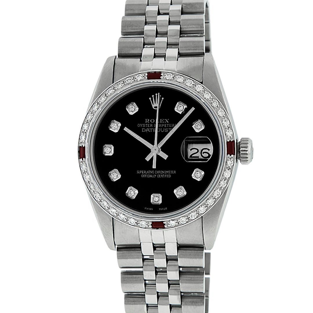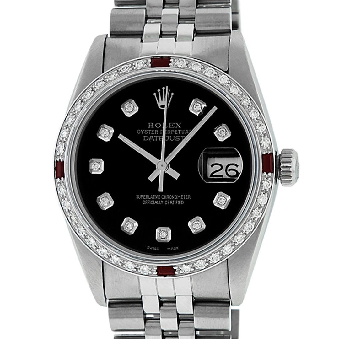 One Mens Stainless Steel Rolex Datejust Polished, Serviced & Electronically Tested, Stainless Steel Case: 36mm, Stainless Steel Crown, Custom Bezel: New 18K White Gold Ruby Beadset Diamond Bezel, Diamond + Gem Count: 36 Diamonds + 4 Rubies, Total Weight 1.00 Carat, Clarity: SI-VS, Color: G to H. Custom Crystal: New Scratch Resistant Synthetic Sapphire Cyclops Lens. Custom Hands: New Luminescent Hands. Movement: Automatic Winding Movement Caliber 3035. Custom Dial: Black Diamond Dial, 10 Diamonds in Dial, G To H In Color, Clarity: SI-VS. Date Window: 3 O'Clock Position Date Display, Quickset, Model: Datejust. Condition: G-6 Extra Fine. Bracelet: Stainless Steel Jubilee Band. Bright Polish & Satin Finish. 7.0 Inch Length, Adjustable. Standard Clasp, With Rolex Logo. This Watch Has Been Serviced Time Tested And Is In Excellent Condition It Is Free Of All Scratches And Dents.