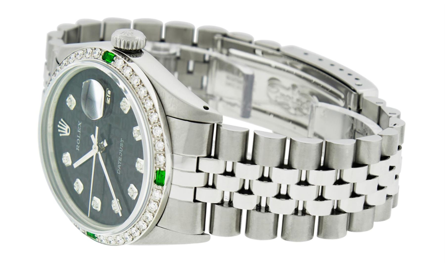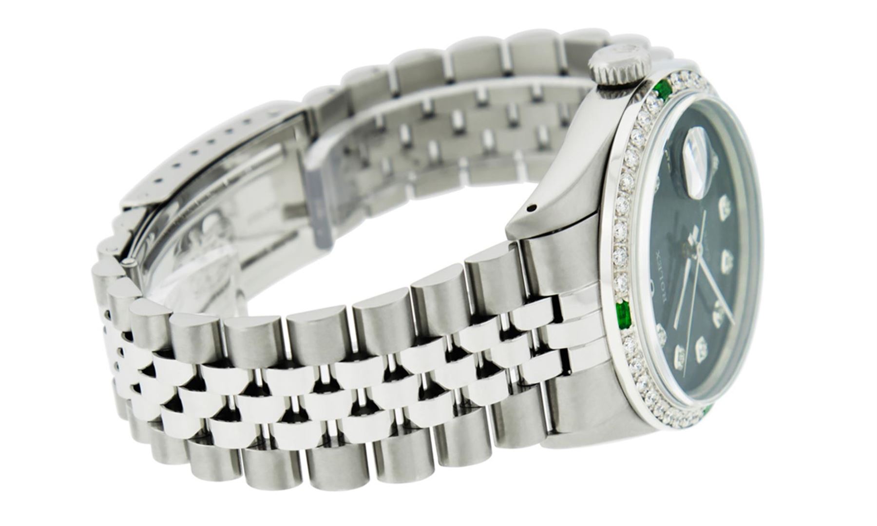 One Mens Rolex Datejust Polished Bright with Satin Finish, Serviced & Electronically Tested, Stainless Steel Case:36mm, Stainless Steel Crown, Custom Bezel: 18K White Gold Emerald Beadset Diamond Bezel, Diamond Count: 36 Diamonds + 4 Emeralds, Total Weight 1.00 Carat, Clarity: SI-VS, Color: G to H. Custom Crystal: Synthetic Sapphire Cyclops Lens. Movement: Automatic Winding Movement Caliber 3035. Custom Dial: Black Jubilee Diamond Dial, Diamond Count: 10 Diamonds In Dial, Diamond Color: G To H In Color, Clarity: SI-VS. Date Window: 3 O'Clock Position Date Display, Quickset, Model: Datejust Condition: G-6 Extra Fine. Bracelet: Stainless Steel Jubilee Band. Bright Polish & Satin Finish. 7.0 Inch Length, Adjustable. Standard Clasp, With Rolex Logo. This Watch Has Been Serviced and Polished And It Is Free Of All Dents And Scratches And Has Been Time Tested.