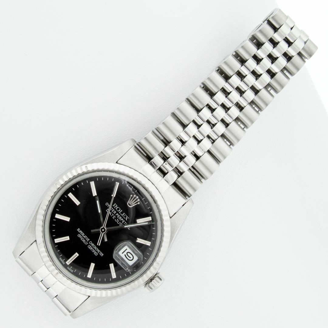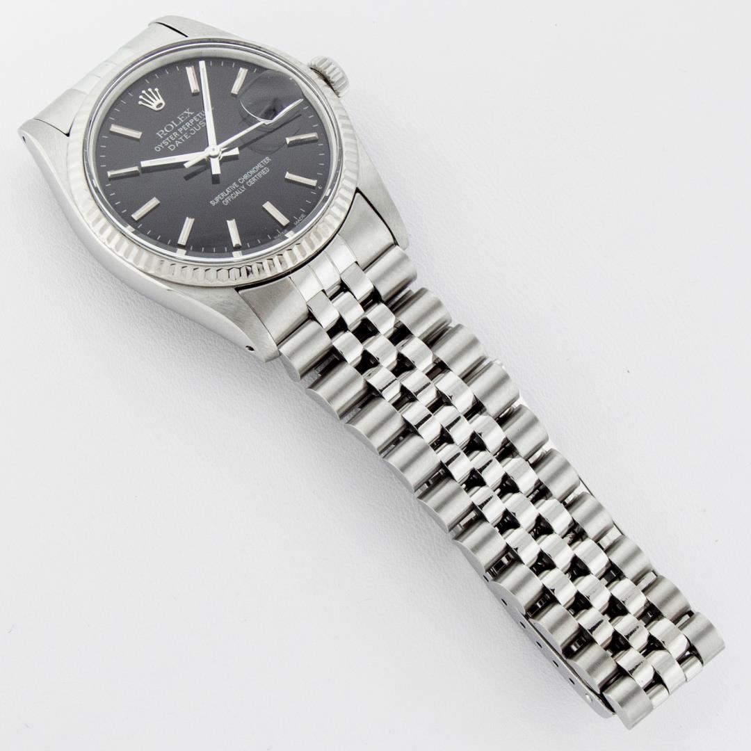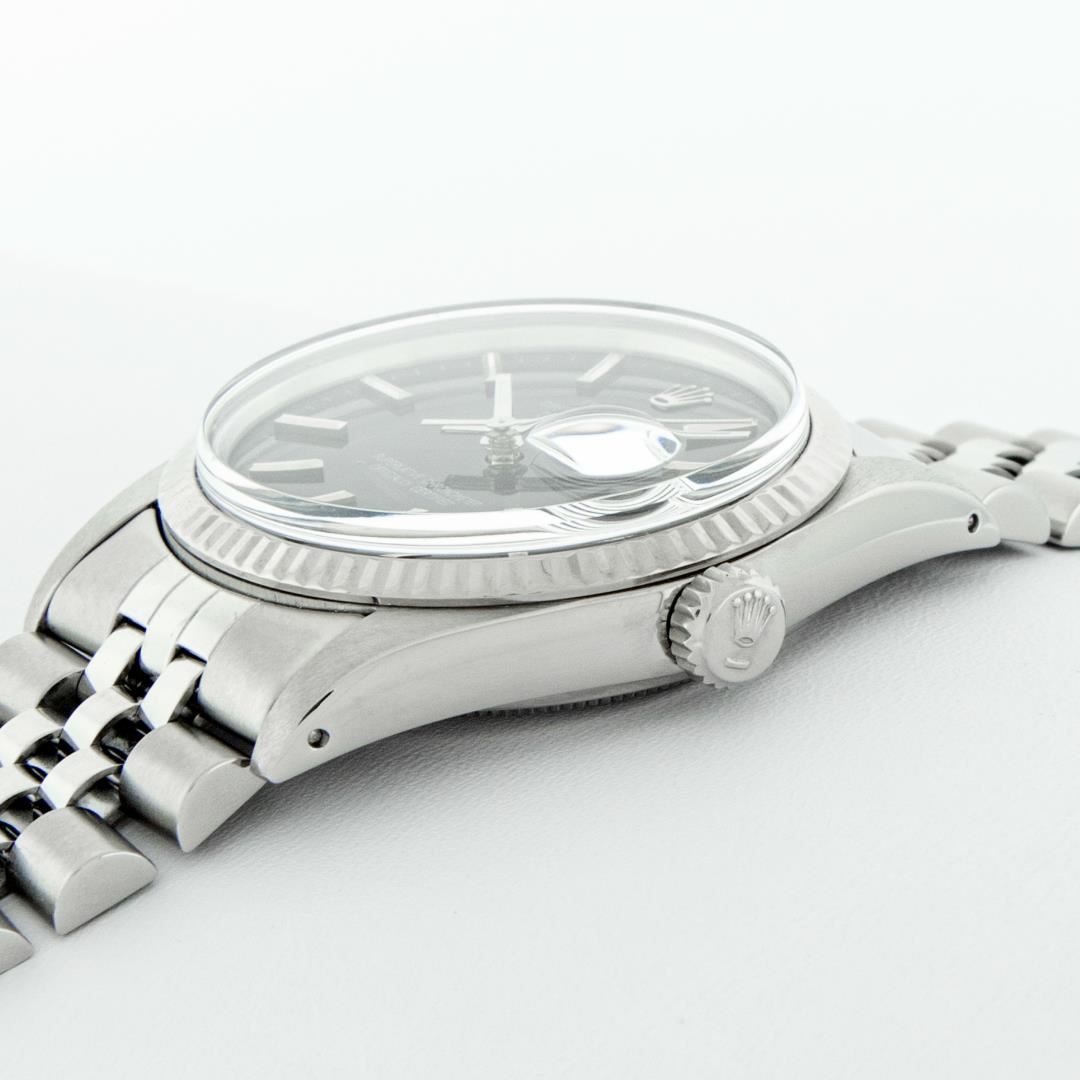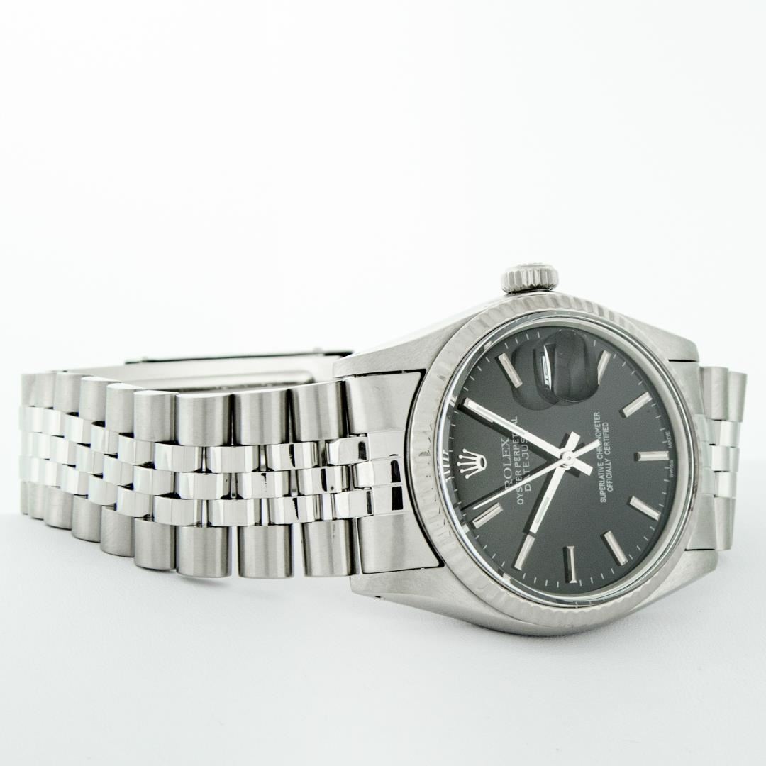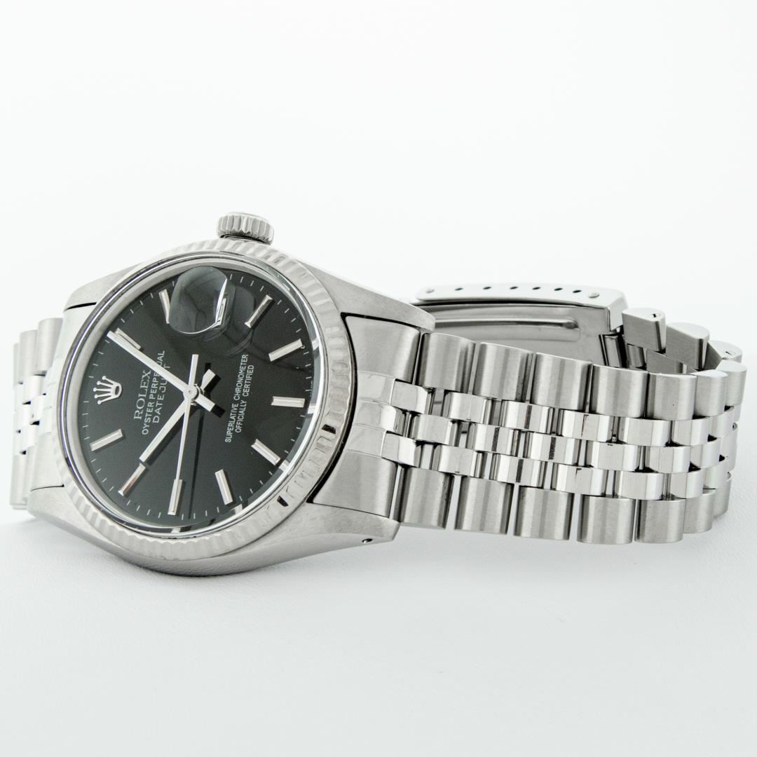 One Mens Pre Owned Rolex Datejust Polished, Serviced & Electronically Tested, Rolex Stainless Steel Case: 36mm, Rolex Stainless Steel Crown, Rolex Bezel: 14K White Gold Fluted Bezel. Custom Crystal: Acrylic With Magnified Date Window. Custom Hands: New Luminescent Hands. Rolex Movement: Automatic Winding Movement 3035. Custom Dial: Refinished To Black Dial With Index Hour Markers With Line Track. Date Window: 3 O'Clock Position Date Display, Quickset, Model: Datejust, Condition: G-6 Extra Fine. Rolex Bracelet: Stainless Steel Jubilee Band. Bright Polish & Satin Finish. 7.0 Inch Length, Adjustable. Standard Clasp, With Rolex Logo. This Watch Has Been Serviced And Polished It Is Free Of All Scratches And Dents.