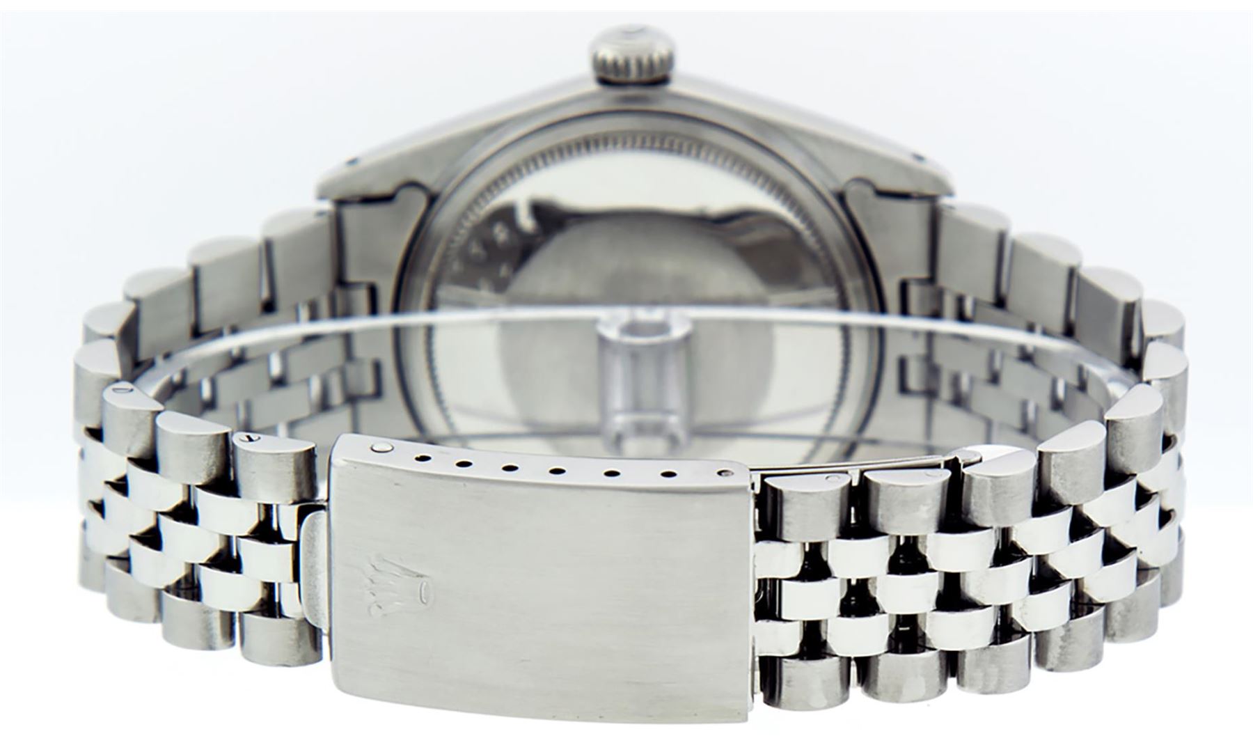One Mens Pre Owned Rolex Datejust Polished, Serviced & Electronically Tested, Rolex Stainless Steel Case: 36mm, Rolex Stainless Steel Crown, Rolex Bezel: 14K White Gold Fluted Bezel. Custom Crystal: Acrylic With Magnified Date Window. Custom Hands: New Luminescent Hands. Rolex Movement: Automatic Winding Movement 3035. Custom Dial: Refinished To Black Dial With Index Hour Markers With Line Track. Date Window: 3 O'Clock Position Date Display, Quickset, Model: Datejust, Condition: G-6 Extra Fine. Rolex Bracelet: Stainless Steel Jubilee Band. Bright Polish & Satin Finish. 7.0 Inch Length, Adjustable. Standard Clasp, With Rolex Logo. This Watch Has Been Serviced And Polished It Is Free Of All Scratches And Dents.