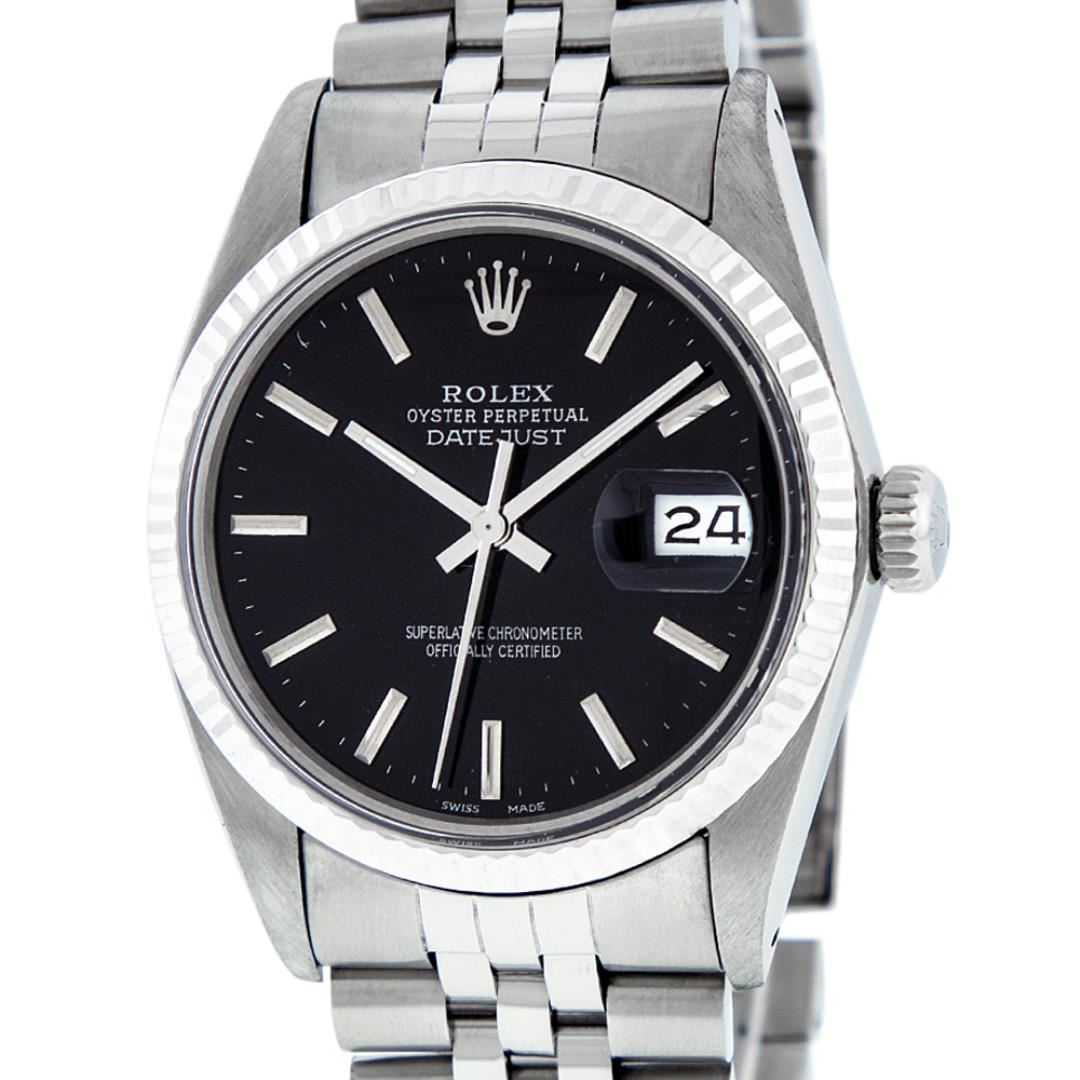 One Pre Owned Stainless Steel Rolex 36MM Datejust Polished, Serviced & Electronically Tested, Rolex Stainless Steel Case: 36mm, Rolex Stainless Steel Crown, Rolex Bezel: White Gold Fluted Bezel. Custom Crystal: New Acrylic With Magnified Date Window. Custom Hands: New Luminescent Hands. Rolex Movement: Automatic Winding Movement 3035. Custom Dial: Custom Black Dial With Index Hour Markers With Line Track. Date Window: 3 O'Clock Position Date Display, Quickset, Model: Datejust, Condition: G-6 Extra Fine. Rolex Bracelet: Stainless Steel Jubilee Band. Bright Polish & Satin Finish. 7.0 Inch Length, Adjustable. Fold Clasp, With Rolex Logo. Watch Has Been Serviced And Polished It Is Free Of All Scratches And Dents.
