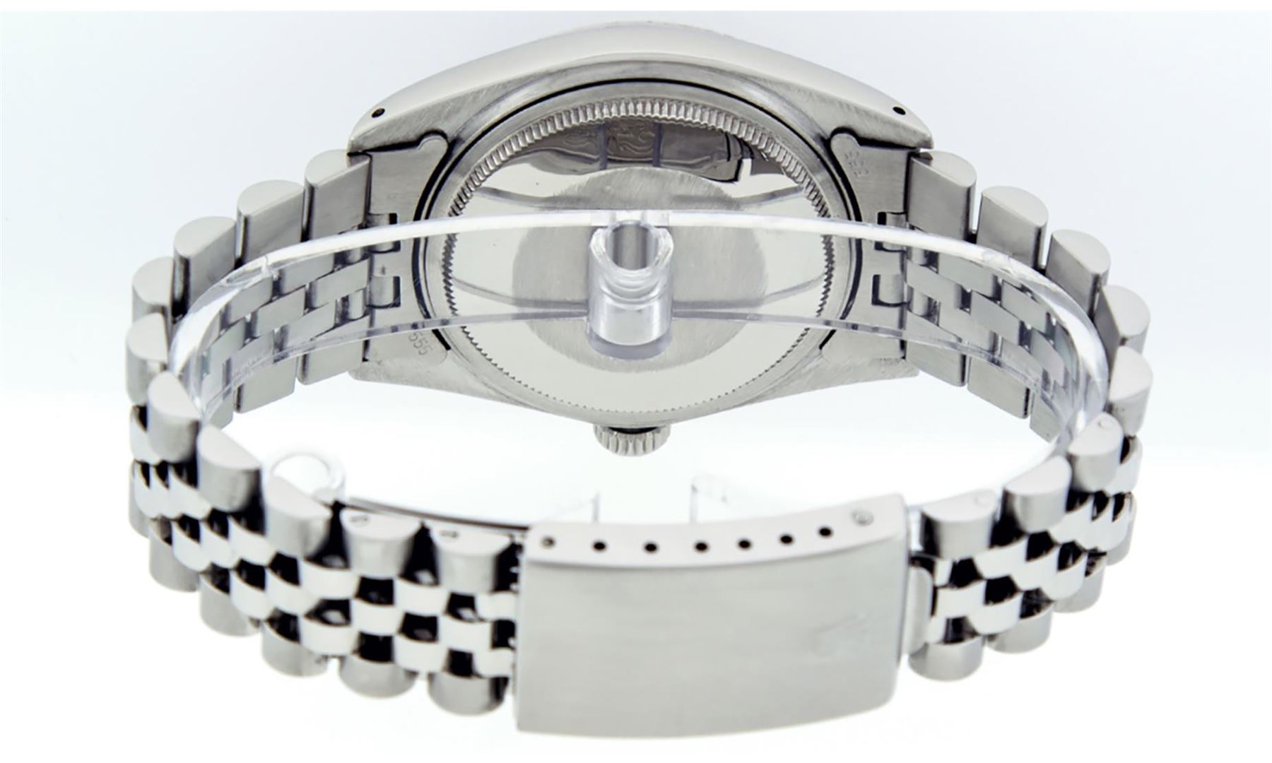 One Pre Owned Stainless Steel Rolex 36MM Datejust Polished, Serviced & Electronically Tested, Rolex Stainless Steel Case: 36mm, Rolex Stainless Steel Crown, Rolex Bezel: White Gold Fluted Bezel. Custom Crystal: New Acrylic With Magnified Date Window. Custom Hands: New Luminescent Hands. Rolex Movement: Automatic Winding Movement 3035. Custom Dial: Custom Black Dial With Index Hour Markers With Line Track. Date Window: 3 O'Clock Position Date Display, Quickset, Model: Datejust, Condition: G-6 Extra Fine. Rolex Bracelet: Stainless Steel Jubilee Band. Bright Polish & Satin Finish. 7.0 Inch Length, Adjustable. Fold Clasp, With Rolex Logo. Watch Has Been Serviced And Polished It Is Free Of All Scratches And Dents.