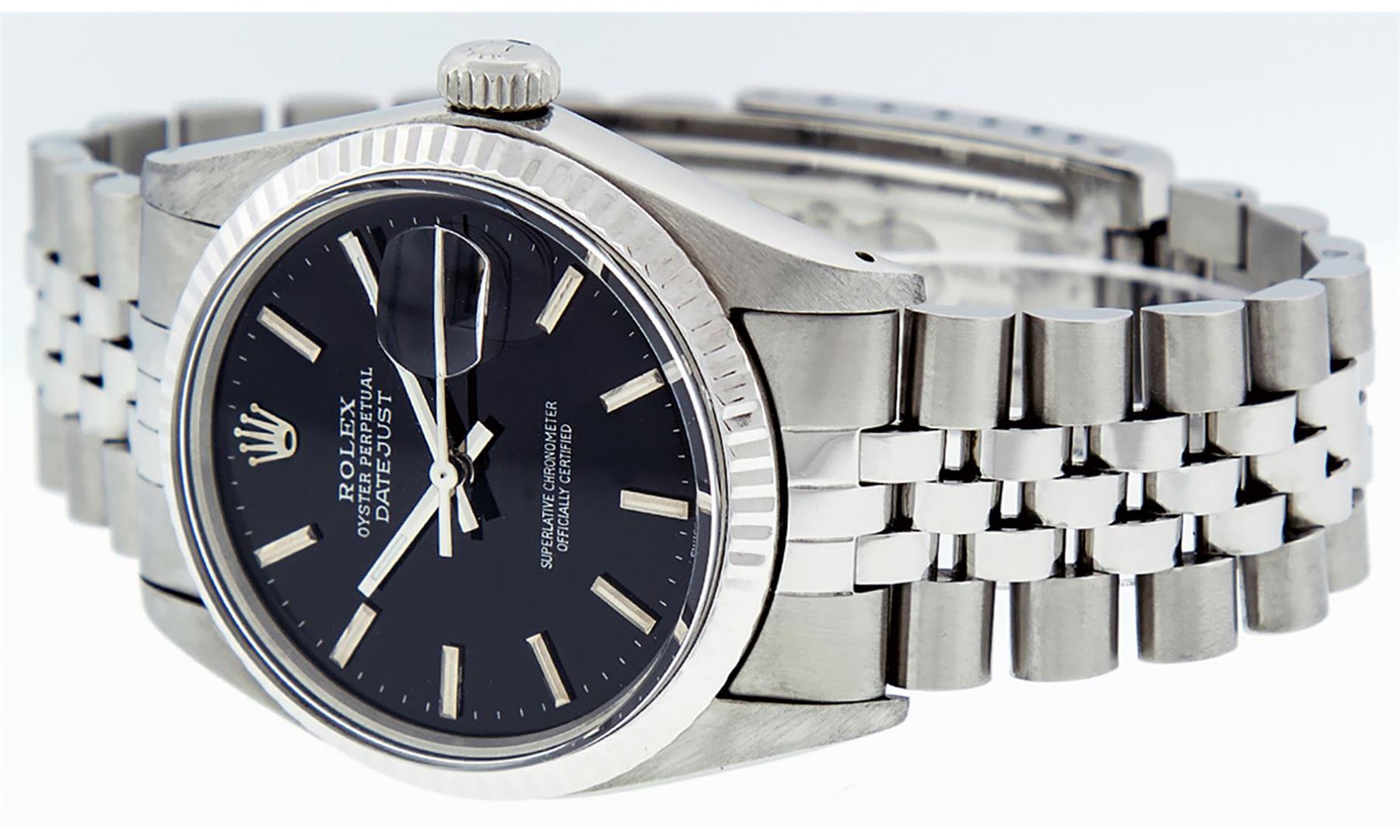 One Mens Rolex Datejust Polished, Serviced & Electronically Tested, Stainless Steel Case: 36mm, Stainless Steel Crown, Bezel: 14K White Gold Fluted Bezel. Custom Crystal: Acrylic Cyclops Lens. Custom Hands: New Luminescent Hands. Movement: Automatic Windi