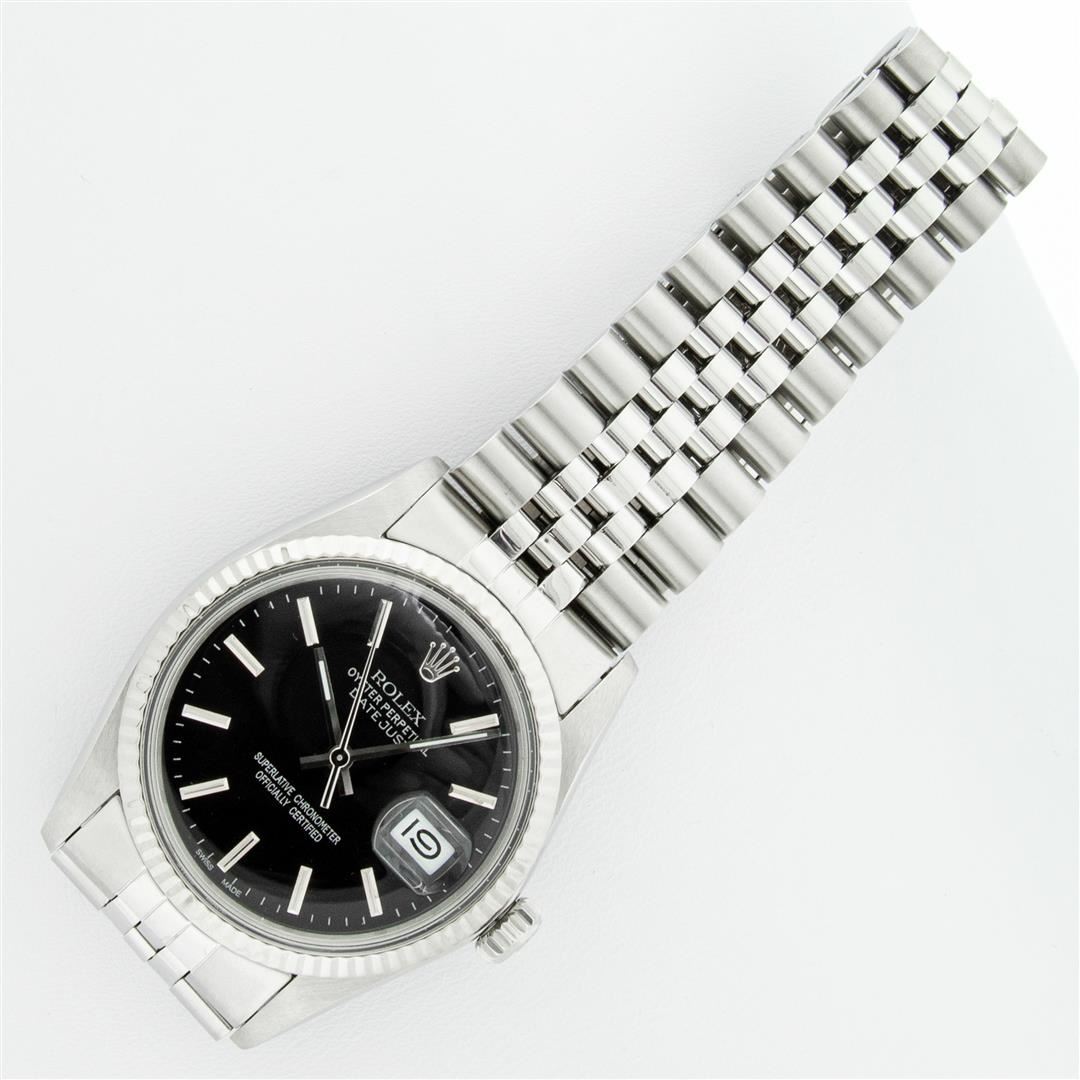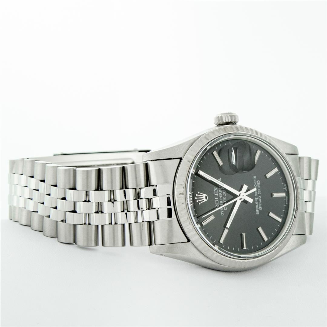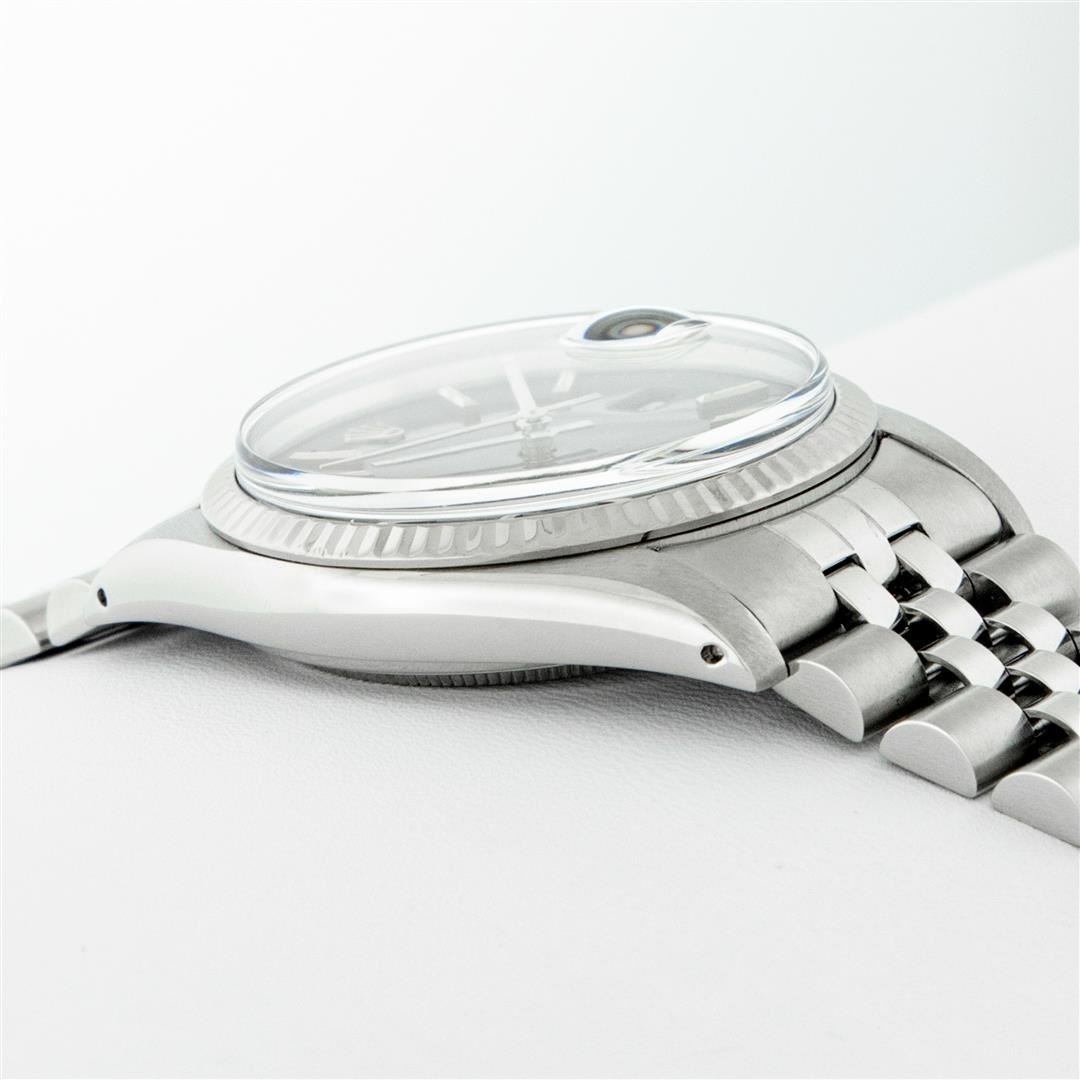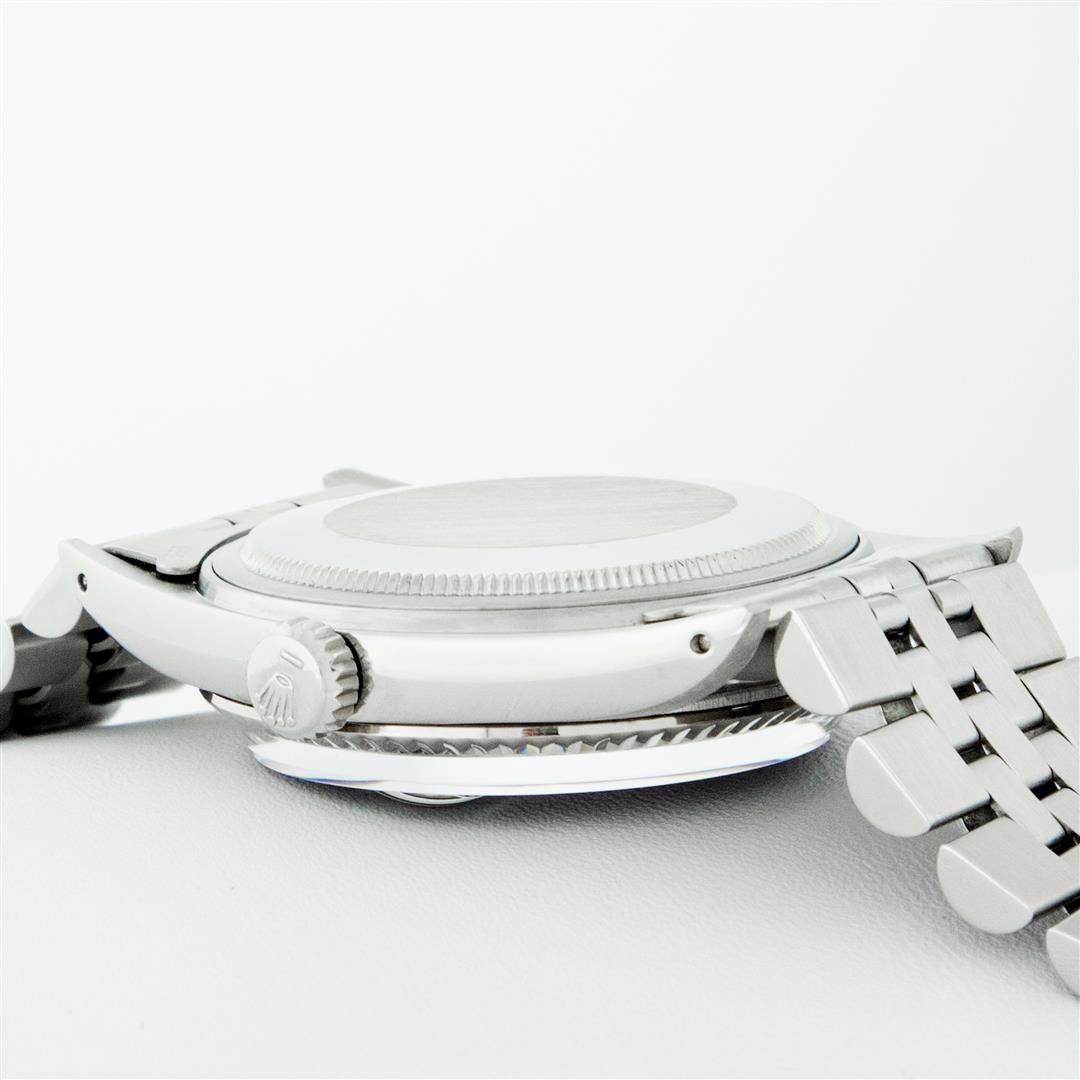 One Mens Pre Owned Rolex Datejust Polished, Serviced & Electronically Tested, Rolex Stainless Steel Case: 36mm, Rolex Stainless Steel Crown, Rolex Bezel: 14K White Gold Fluted Bezel. Custom Crystal: Acrylic Cyclops Lens. Custom Hands: New Luminescent Hand