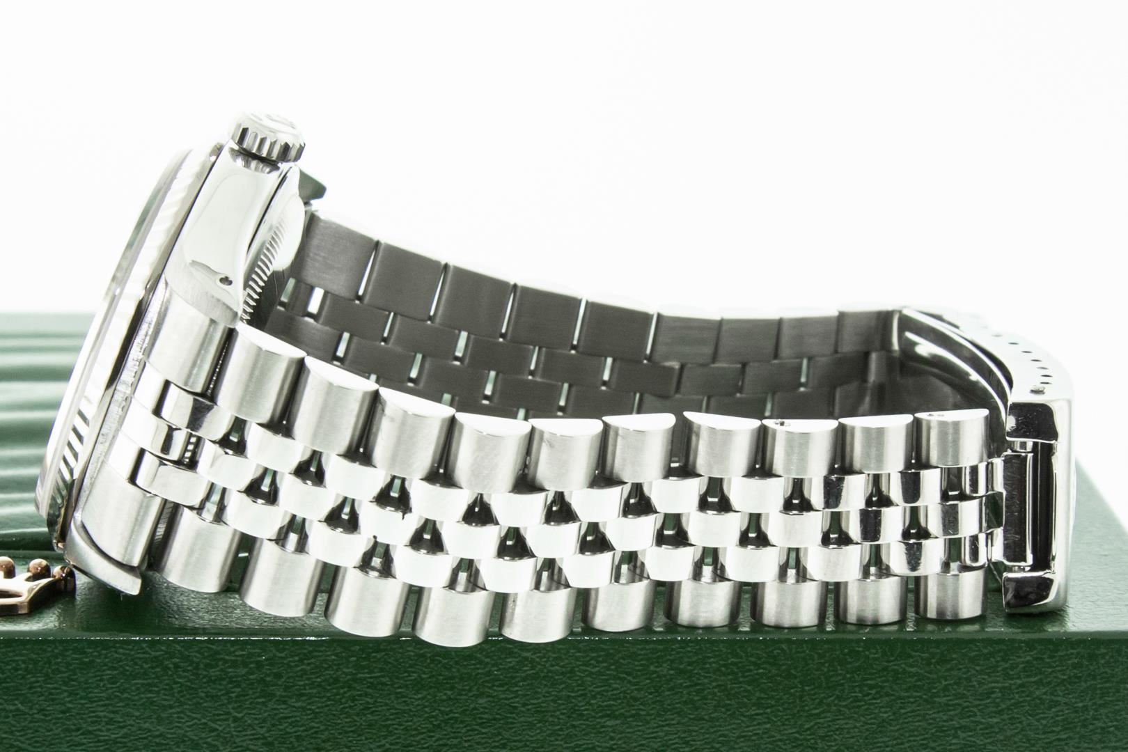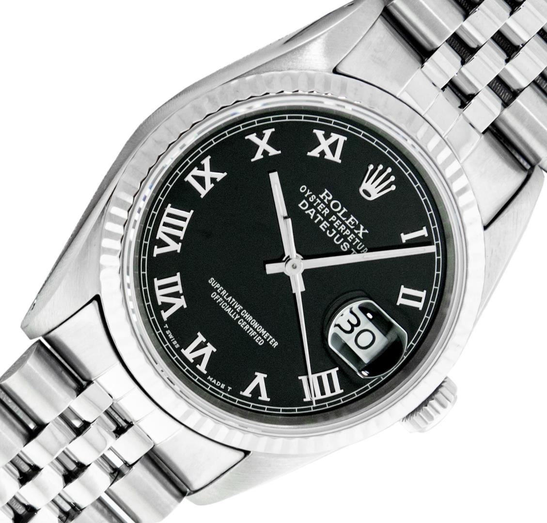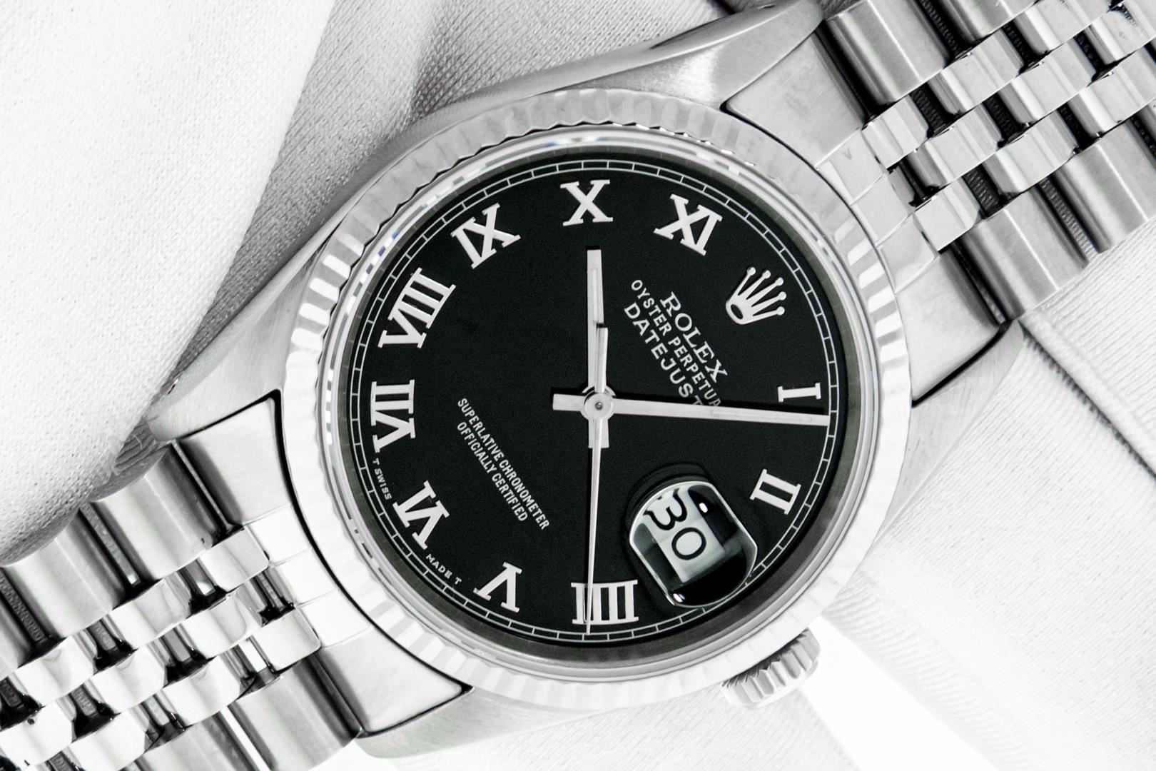 One Mens Pre Owned Stainless Steel Rolex Datejust Polished Bright with Satin Finish, This Watch Has Been Serviced & Electronically Tested, Rolex Stainless Steel Case: 36mm, Rolex Stainless Steel Crown, Rolex Bezel: 18K White Gold Fluted Bezel. Custom Crystal: New Sapphire With Magnified Date Window. Custom Hands: New Luminescent Hands. Rolex Movement: Automatic Winding Movement Caliber 3135. Custom Dial: Black Roman With Square Track. Date Window: 3 O'Clock Position Date Display, Quickset, Model: Sapphire Datejust, Condition: G-6 Extra Fine. Rolex Bracelet: Stainless Steel Jubilee Band. Bright Polish & Satin Finish. 7.0 Inch Length, Adjustable. Standard Clasp, With Rolex Logo. This Watch Has Been Serviced Time Tested And Is In Excellent Condition It Is Free Of All Scratches And Dents. This Watch Comes With Rolex Box, Booklets, Hang Tag, & Wallet.