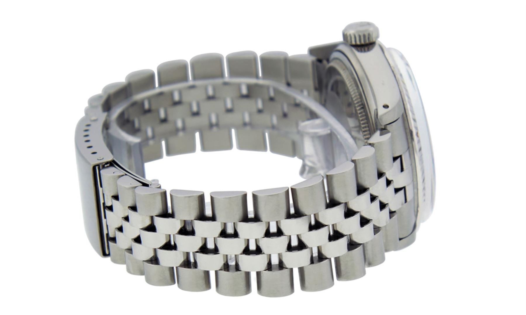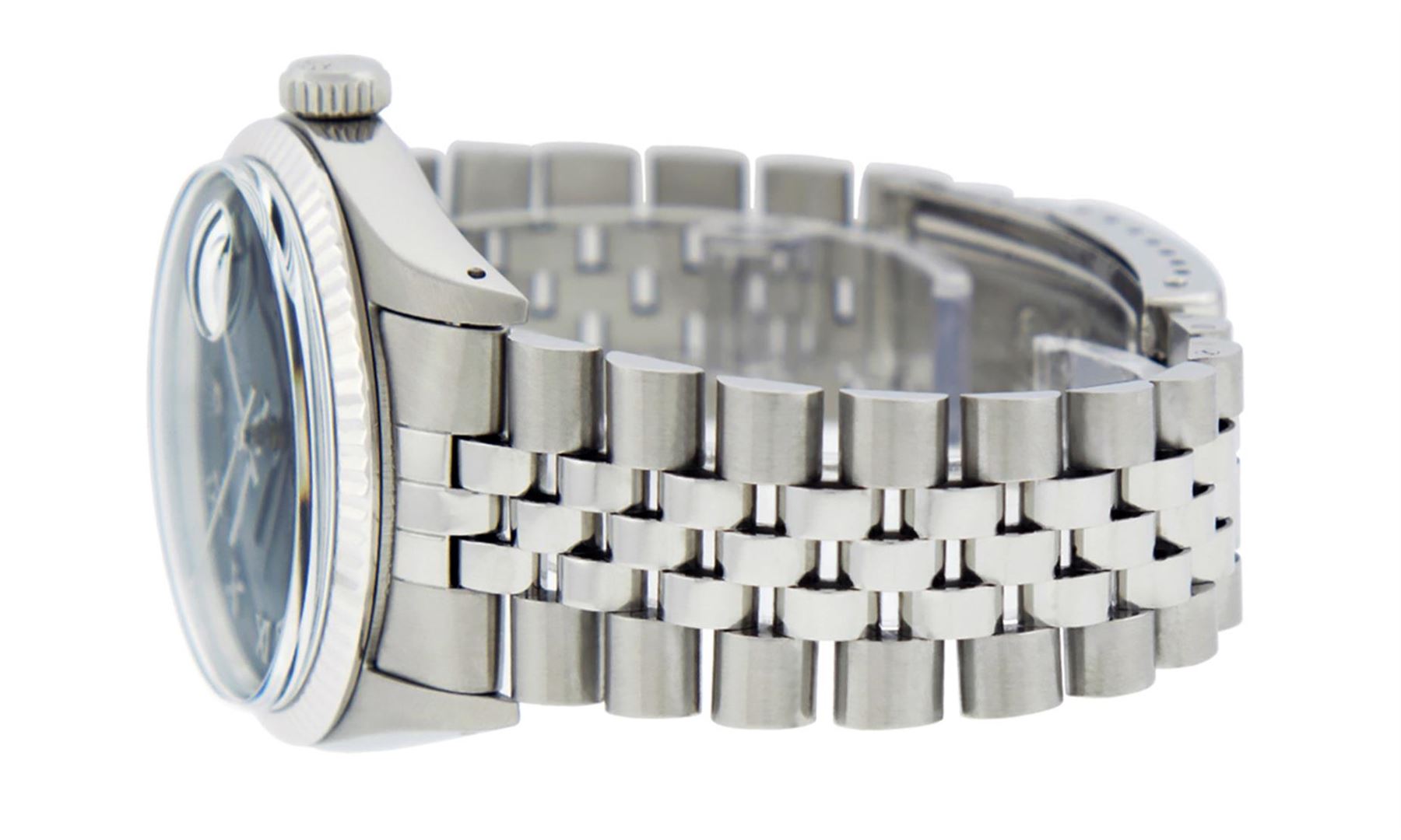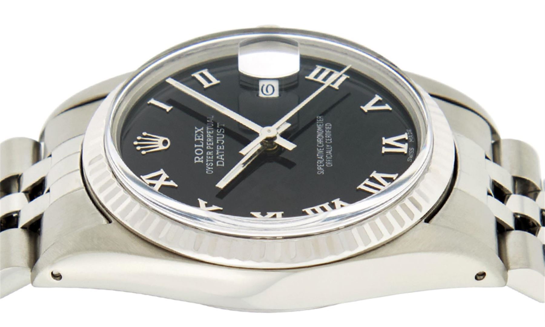 One Mens Rolex Datejust Polished Bright with Satin Finish, Serviced & Electronically Tested, Stainless Steel Case:36mm, Stainless Steel Crown, Bezel: 14K White Gold Fluted Bezel. Custom Crystal: Acrylic Cyclops Lens. Movement: Automatic Winding Movement Caliber 3035. Custom Dial: Black Roman Dial. Date Window: 3 O'Clock Position Date Display, Quickset, Model: Datejust Condition: G-6 Extra Fine. Bracelet: Stainless Steel Jubilee Band. Bright Polish & Satin Finish. 7.0 Inch Length, Adjustable. Standard Clasp, With Rolex Logo. This Watch Has Been Serviced and Polished And It Is Free Of All Dents And Scratches And Has Been Time Tested.